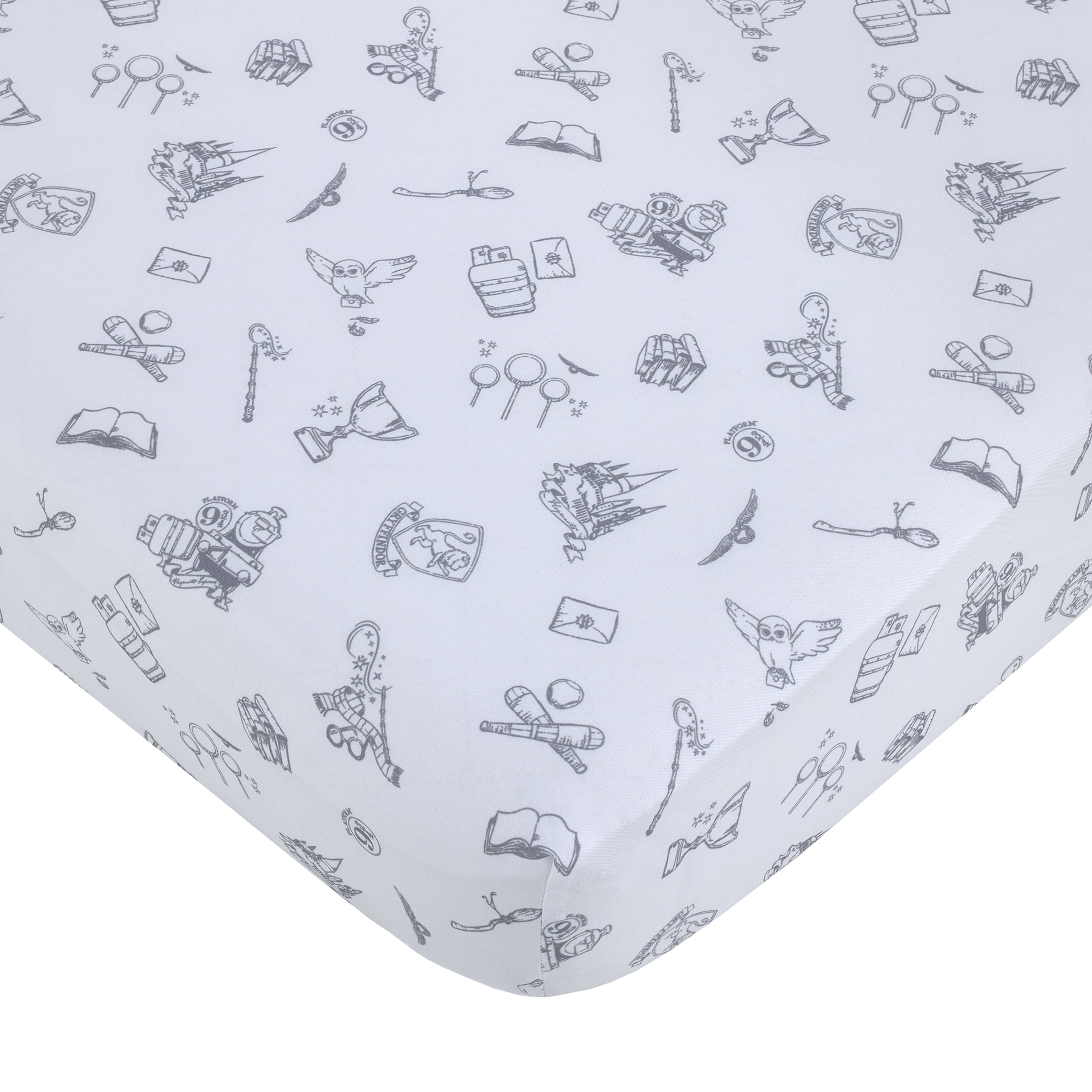 The 3 Piece Nursery Crib Bedding Set includes a comforter, fitted crib sheet and crib skirt Features magical icons of the wizarding world in shades of grey, white and soft pastels The playful fitted crib sheet has full elastic for a safe and snug fit