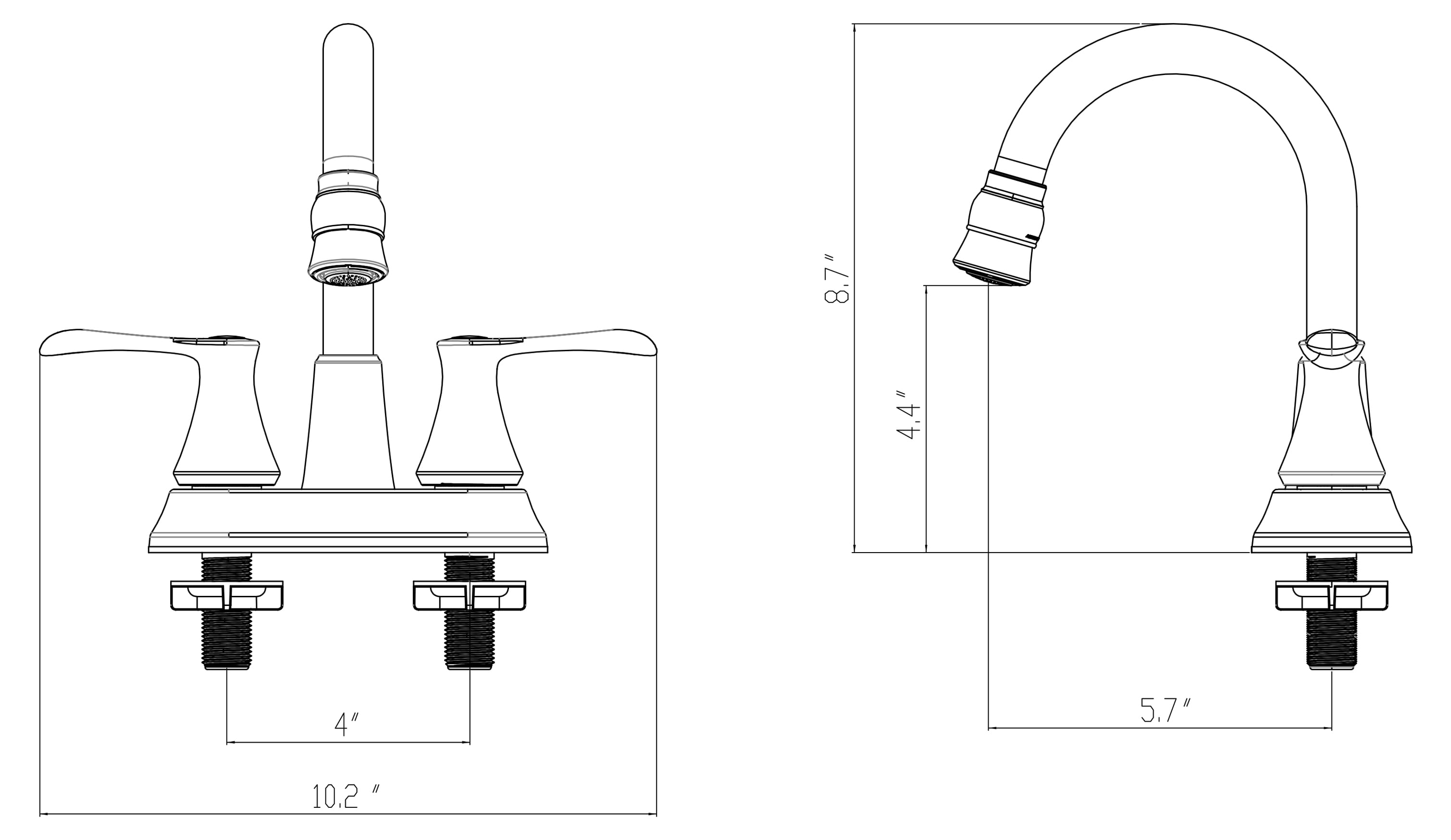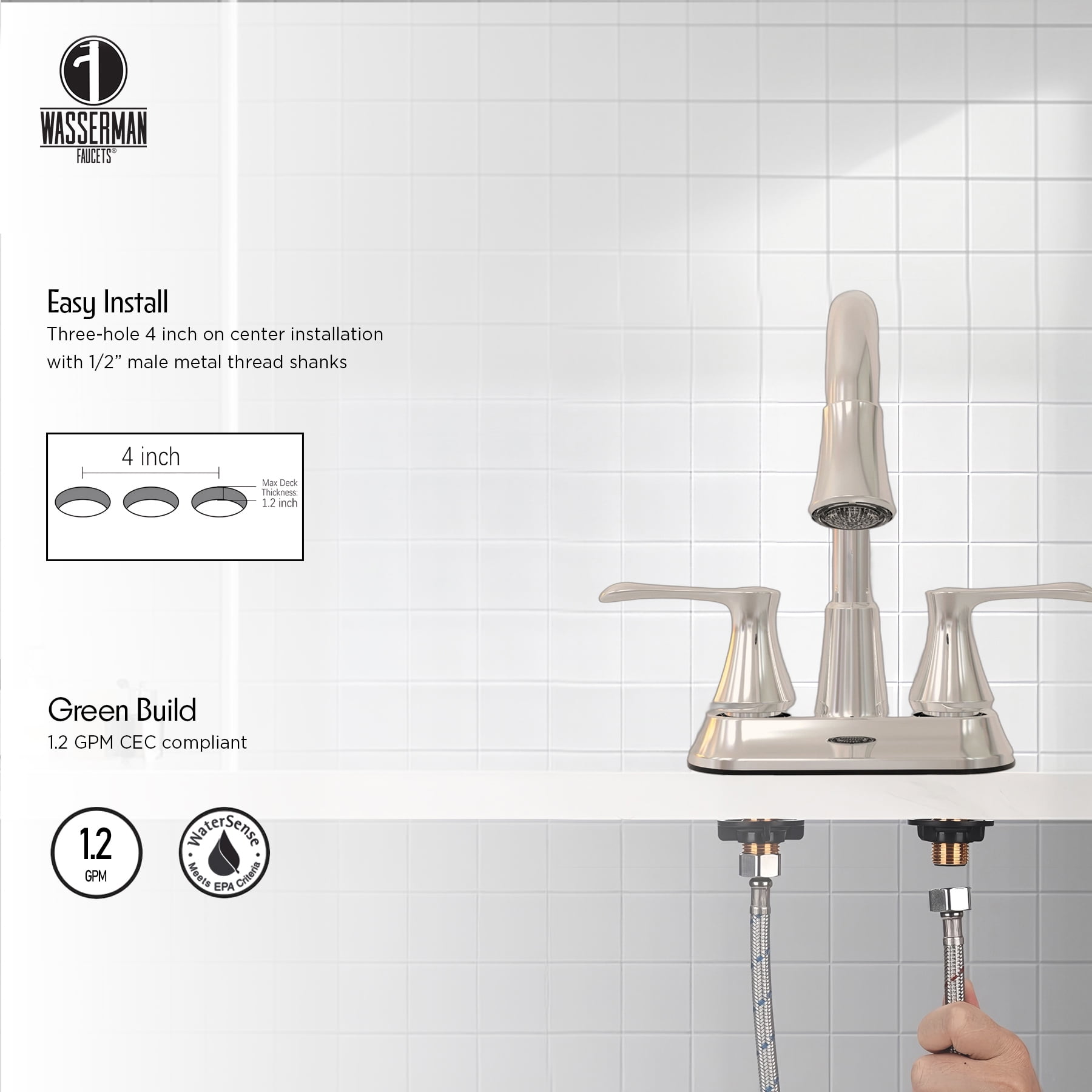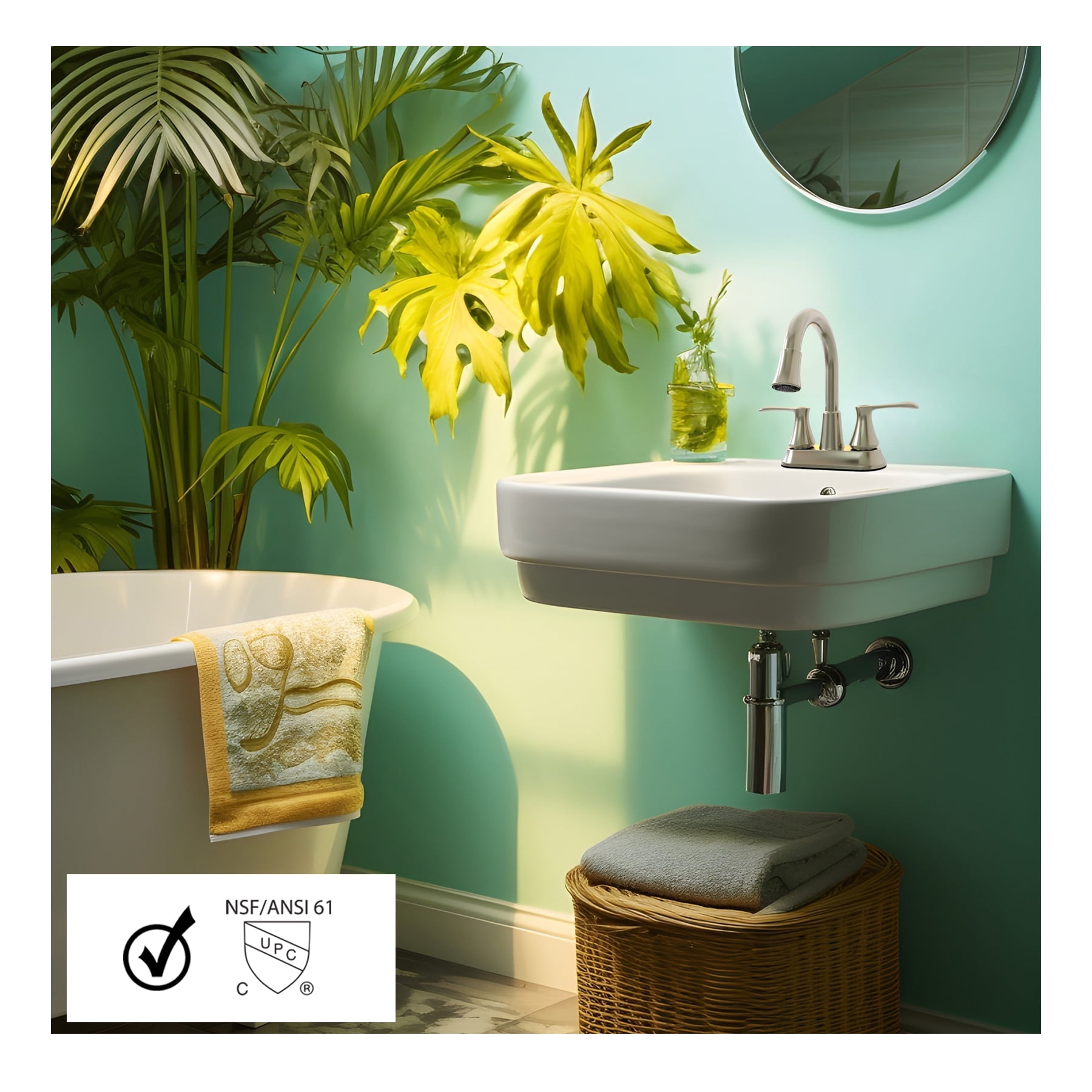 – 360 Degree Swivel Spout – High Arc Lavatory Faucet – High Quality Washerless Cartridges for Durability and Reliability – Wing Style Double Handle – Hybrid Metal Deck – Push Pop-up Included – Chrome Finish – 4″ on Center Installation – Flow Rate: 1.2 GPM – Standard 1/2″ IP faucet connection – Complies with ASME A112.18.1-2012/CSA B125.1-12 – Complies with NSF – Meets California low-lead AB1953 requirements – cUPC certification