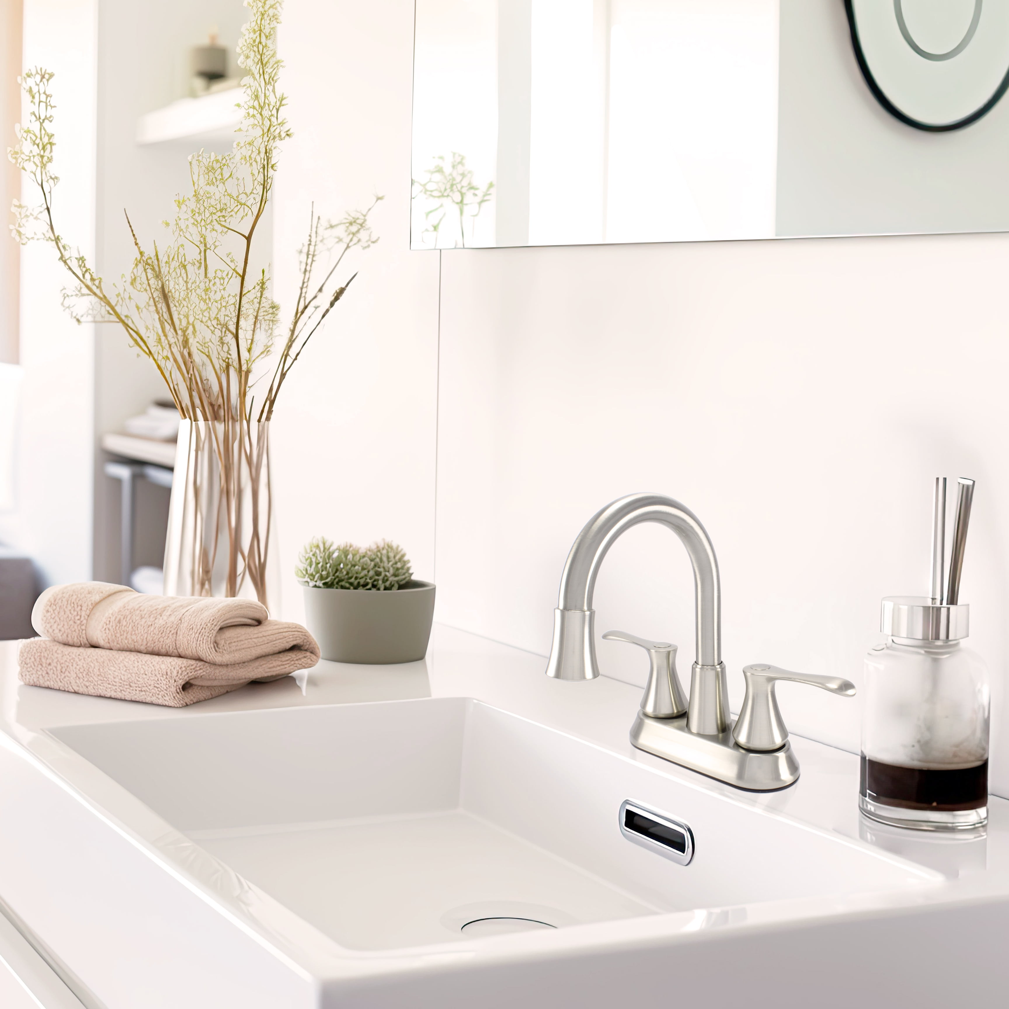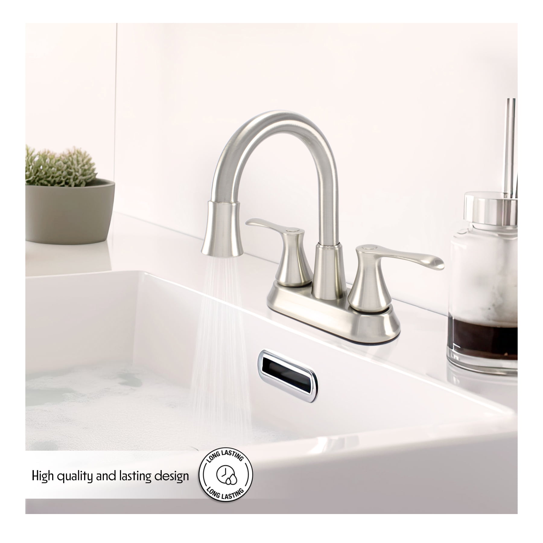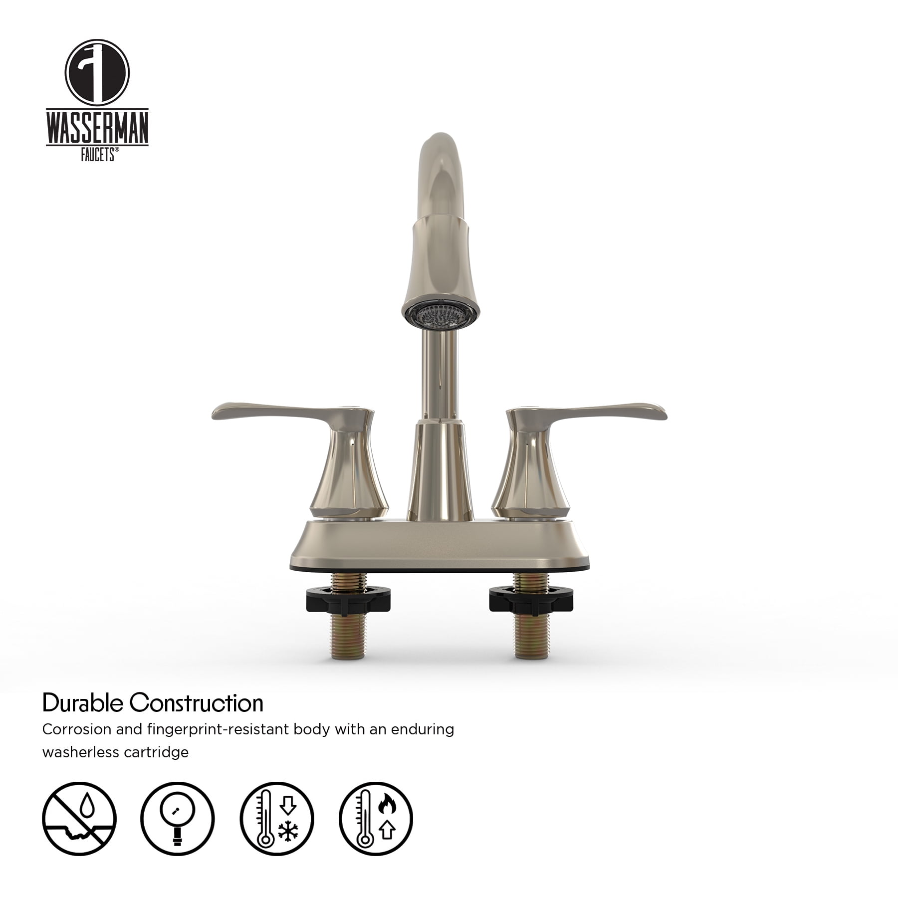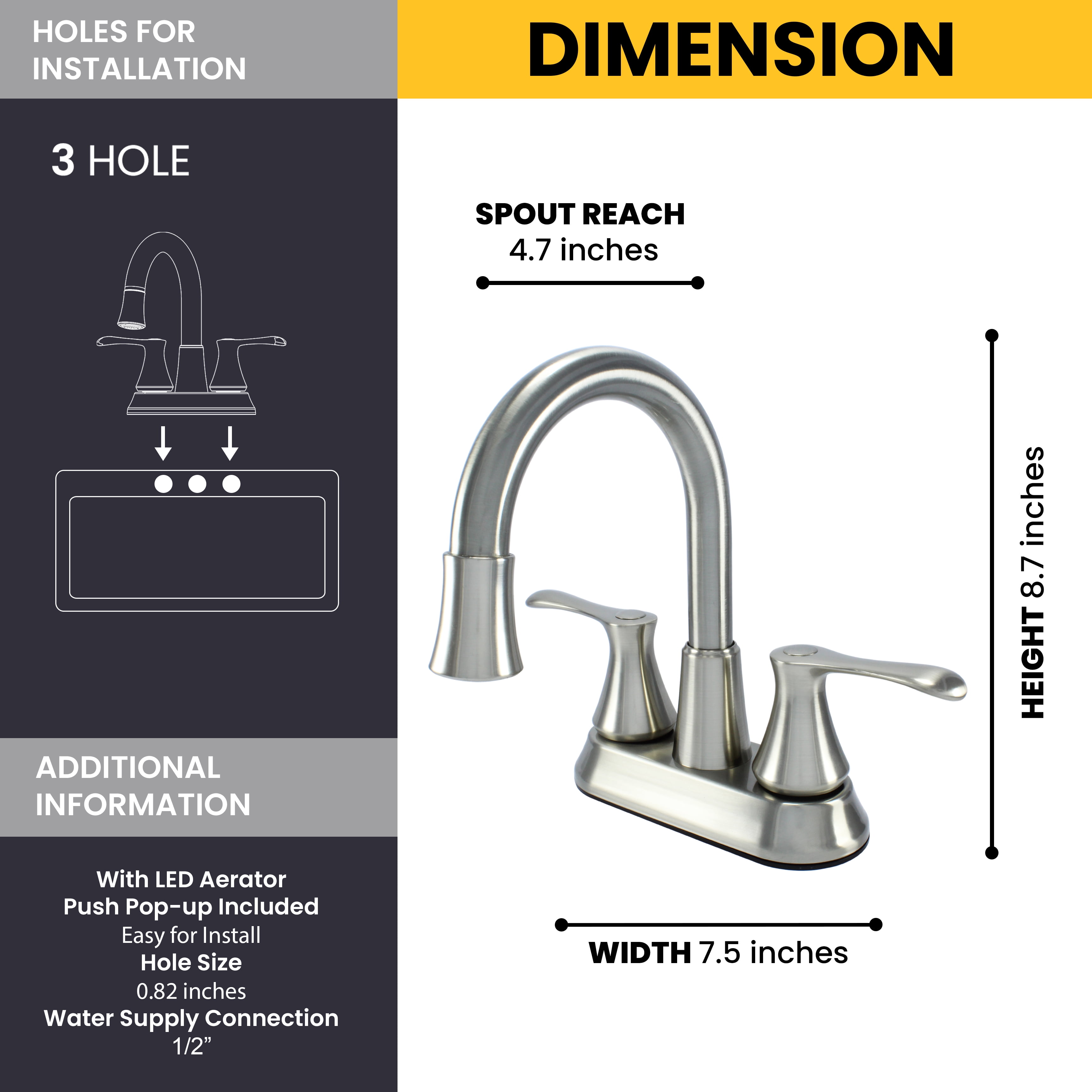 Hybrid Metal Deck Faucet 360 Degree Swivel Spout LED aerator Double handle Washerless cartridge With Pop-up Brushed Nickel High Quality Washerless Cartridges for Durability and Reliability 4″ on Center Installation Flow Rate: 1.2 GPM Standard 1/2″ IP faucet connection Complies with ASME A112.18.1-2012/CSA B125.1-12 Complies with NSF Meets California low-lead AB1953 requirements cUPC certification