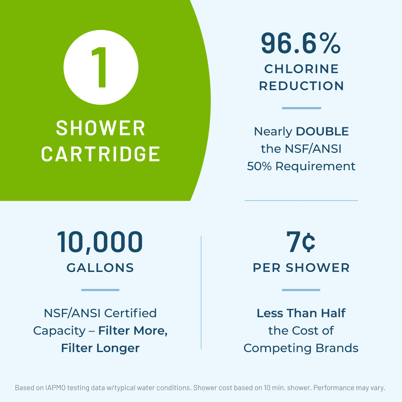 Compatible with: WaterChef Shower Filter Systems SF-7C, SF-7C-ECO, and SF-7W FlowRate: 2.5 gpm at 80 psi Rated Capacity: 20,000 Gallons per 2-Pack WaterChef® Premium Shower Filter Cartridges – Feel the Difference Immediately IAPMO Platinum Certified for NSF/ANSI Standard 177 for Chlorine – Trusted Performance Superior Filtration at a Lower Cost per Shower than Competing Brands (often less than half the price) Powerful ThermalGuard™ Filtration Technology to Remove More Chlorine From Your Shower BPA Free & Eco-Smart Quick and Easy Cartridge Changes – NO Tools Required Rated Capacity of 10,000 Gallons or up to 6 Months per Filter Cartridge