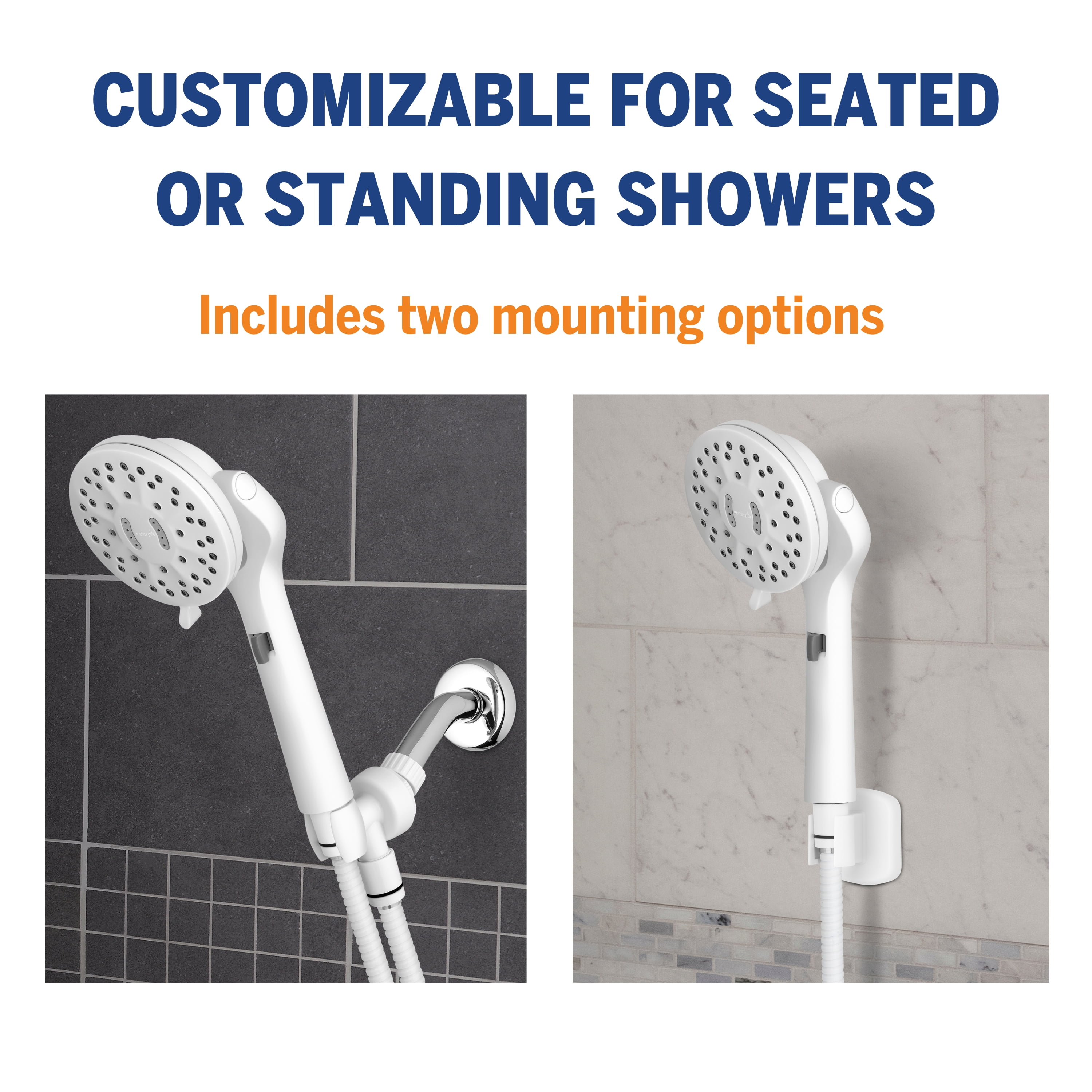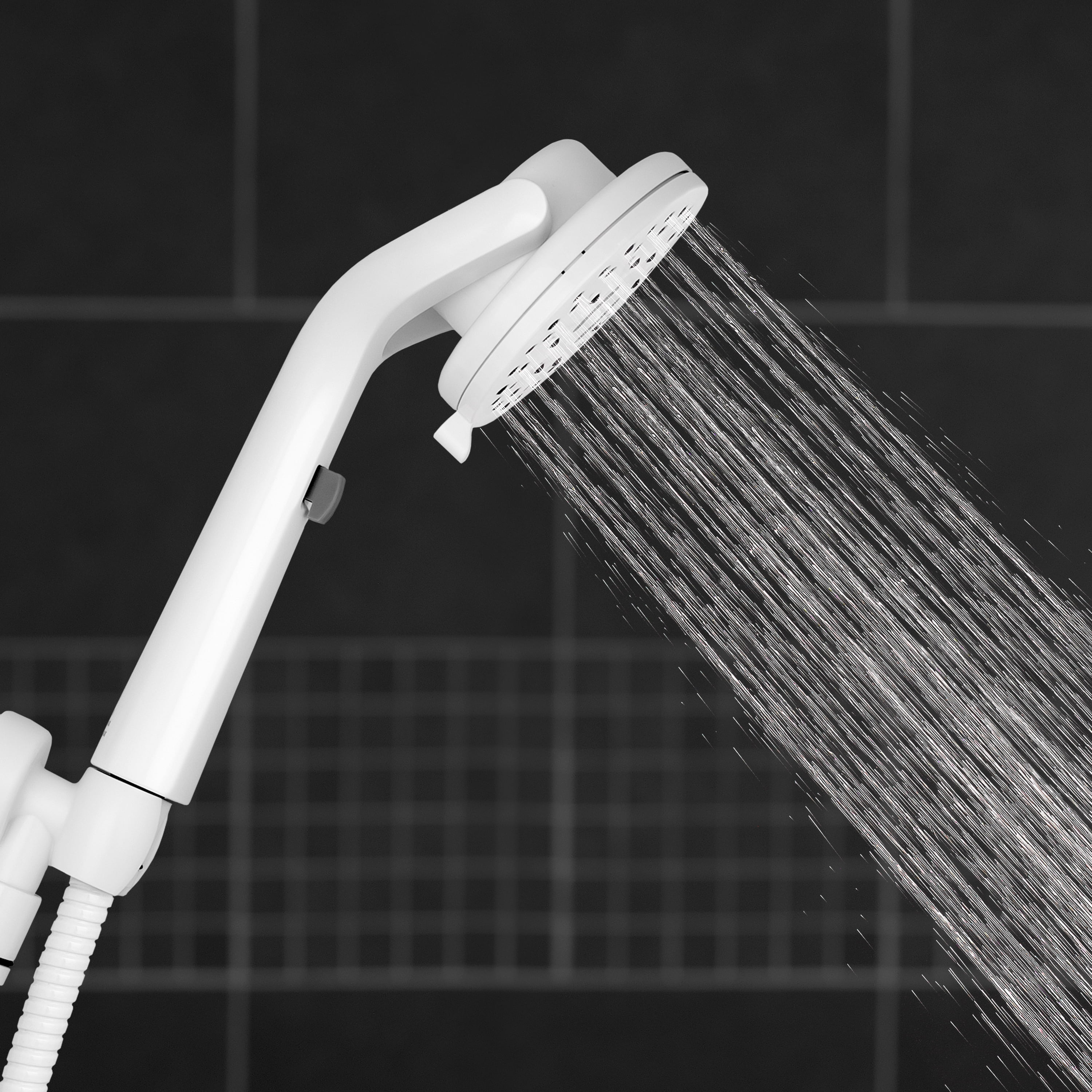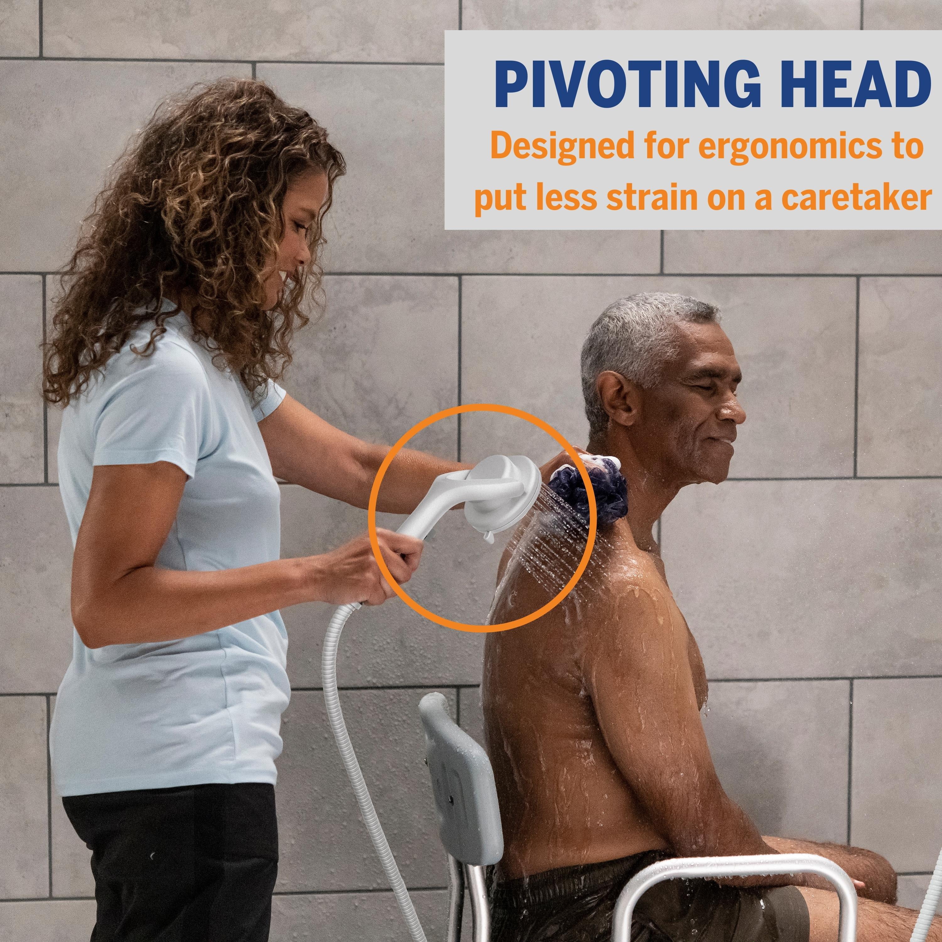 Whether caring for yourself or someone else, the ShowerCare Pivoting Hand Held Shower Head integrates modern design with ADA-compliant safety benefits. Customizable for seated or standing showers, this hand held shower head features a 180-degree pivoting head, putting less strain on yourself and others. Simply pivot the showerhead to spray directly where needed and shower hands-free. Using the one-handed pressure adjustment, toggle between a full flow and a trickle for the optimal water intensity you require. Choose from 5 refreshing spray settings including our PowerPulse Massage spray, a revolution in shower head technology that delivers up to 2X the massage force vs. other retail market shower heads. It is FDA registered and clinically shown to help soothe muscle tension, increase flexibility, and promote restful night sleep. The flexible 8-foot metal hose provides added convenience when bathing yourself or others, and makes cleaning the shower easy.