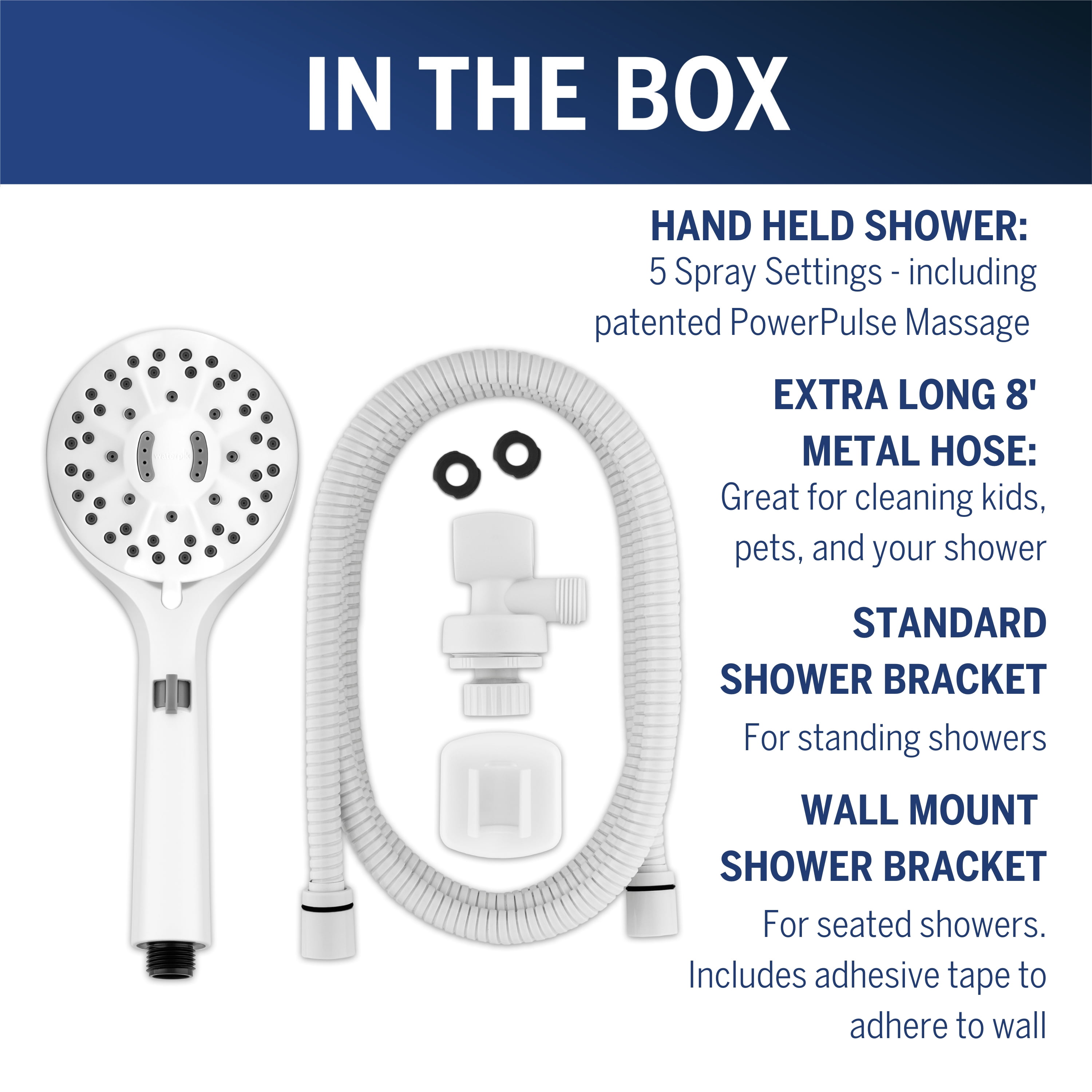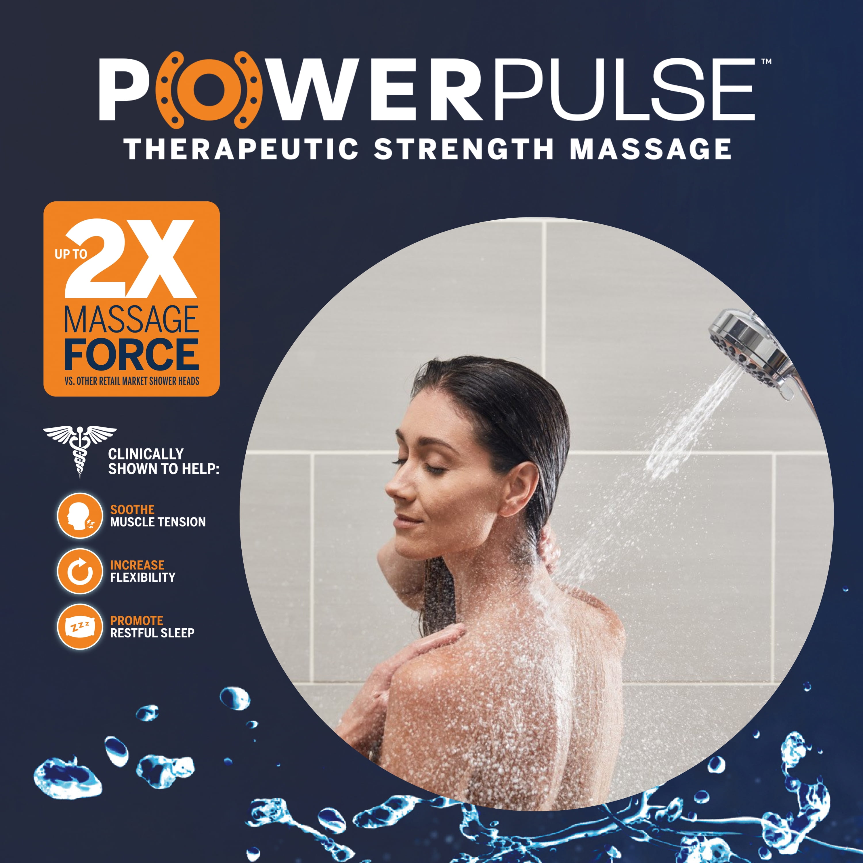 Adjustable height Anti-clog nozzles Clinically shown to help soothe muscle tension, increase flexibility, and promote restful sleep FDA registered shower head Hand held shower with 8-Foot metal hose Installs in minutes Lifetime limited warranty Therapeutic strength massage up to 2X massage force vs. other retail market shower heads Spray Modes: Full Body PowerPulse Massage PowerPulse Massage + Full Body PowerPulse Massage + PowerSpray PowerSpray