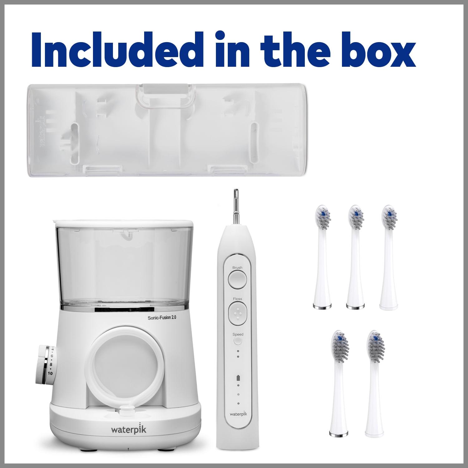 – In the Box: Waterpik Sonic-Fusion 2.0 White (SF-03), Compact Replacement Flossing Brush Heads (SFRB) with covers, Premium Toothbrush Case