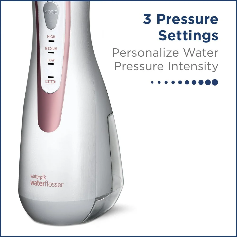Brand Waterpik Power Source Battery Powered Color White About this item EASY & EFFECTIVE: The Waterpik Water Flosser is the easy and most effective way to floss, removing up to 99.9 percent of plaque from treated areas and is up to 50 percent more effective than dental floss for improving gum health TESTED & TRUSTED: Waterpik is clinically proven and the only Water Flosser brand to earn the American Dental Association (ADA) Seal of Acceptance. Enjoy healthier gums and brighter teeth in just 1 minute a day USB CHARGING SYSTEM: Included USB charger connects magnetically to the unit and charges in 4 hours; LED battery indicator lets you know when it’s time to recharge, global voltage compatible 100 240VAC, 60/50Hz ADVANCED CORDLESS DESIGN: Convenient cordless and a waterproof design for use in the shower. Includes 2 pressure settings ranging from 45 to 75 PSI for a custom clean, ultra quiet operation, and 4 accessory tips for multiple users and needs WARRANTY & SUPPORT: Waterpik Fort Collin, Colorado support team is available to help with any product questions or needs. The cordless select water Flosser is backed by a 2-year warranty.