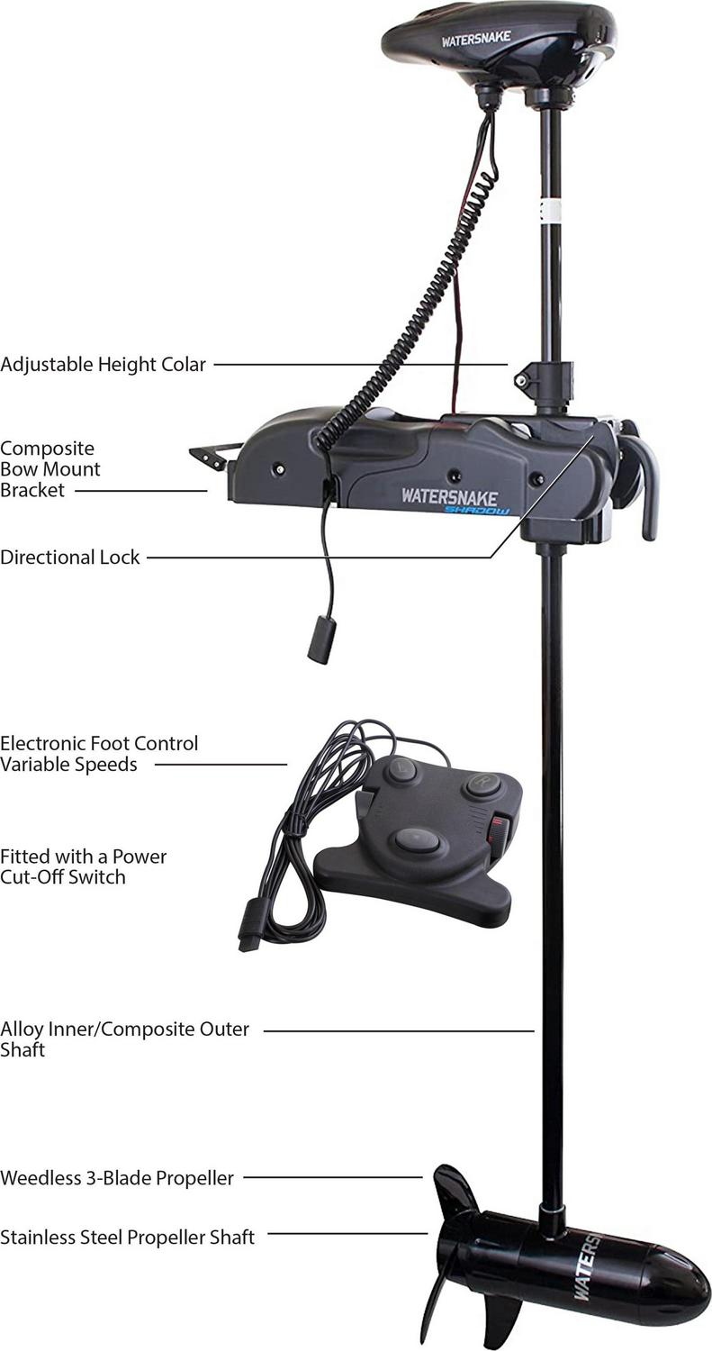 Get out on the water with this Watersnake Shadow Trolling Motor. It is the most popular Watersnake model and an easy-to-operate upgrade with electric foot control. This bow-mounted electric trolling motor has a 48-inch stainless steel corrosion-resistant shaft. The foot control is simple to use and has a cut-off switch that engages as soon as the motor is placed into the stow position.