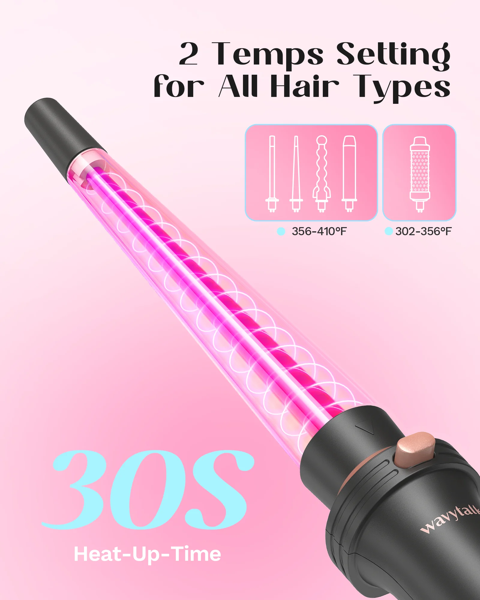 Get different incredible hairstyles at home with Wavytalk 5 in 1 Curling Iron Set! Different size can make different hairstyles: 0.35-0.7 inch conical curling wand works for small curls, 0.5 inch small curling wand works for medium curls, 1 inch spiral curling wand works for vintage waves. 1.25 inch curling iron works for loose curls, 1.5 inch curling brush works for loose relaxed curls, volumizing and Bangs. Invest in Wavytalk curling wand set for a premium hair styling experience that delivers consistent, beautiful results every time. Transform your look effortlessly and enjoy the confidence that comes with salon-perfect curls.
