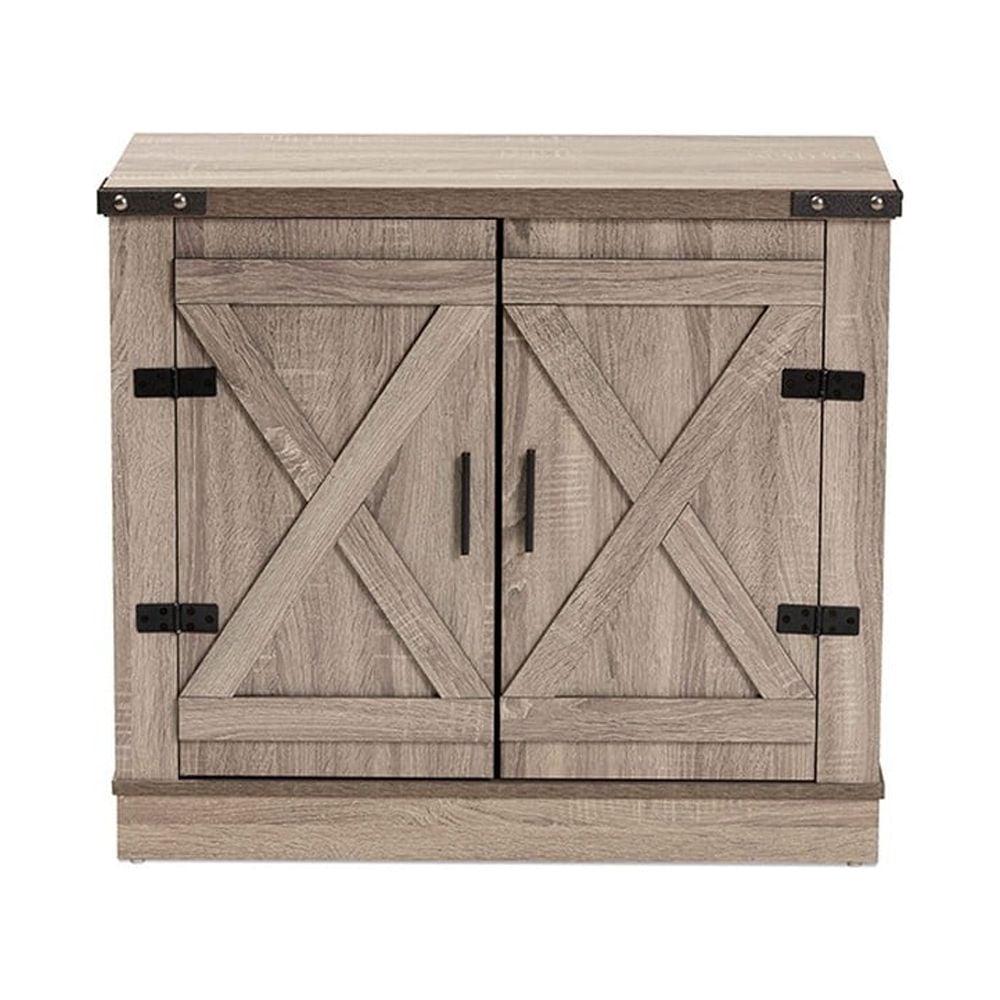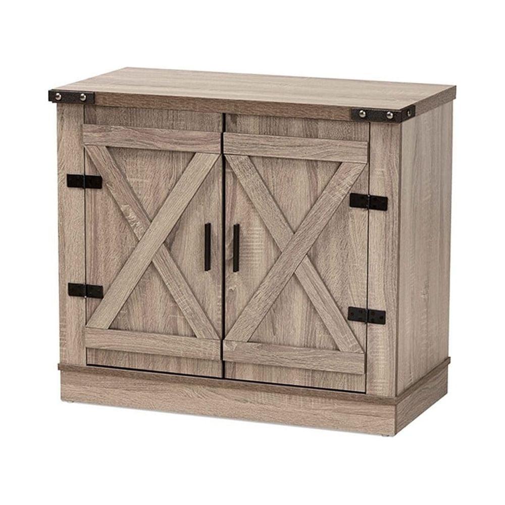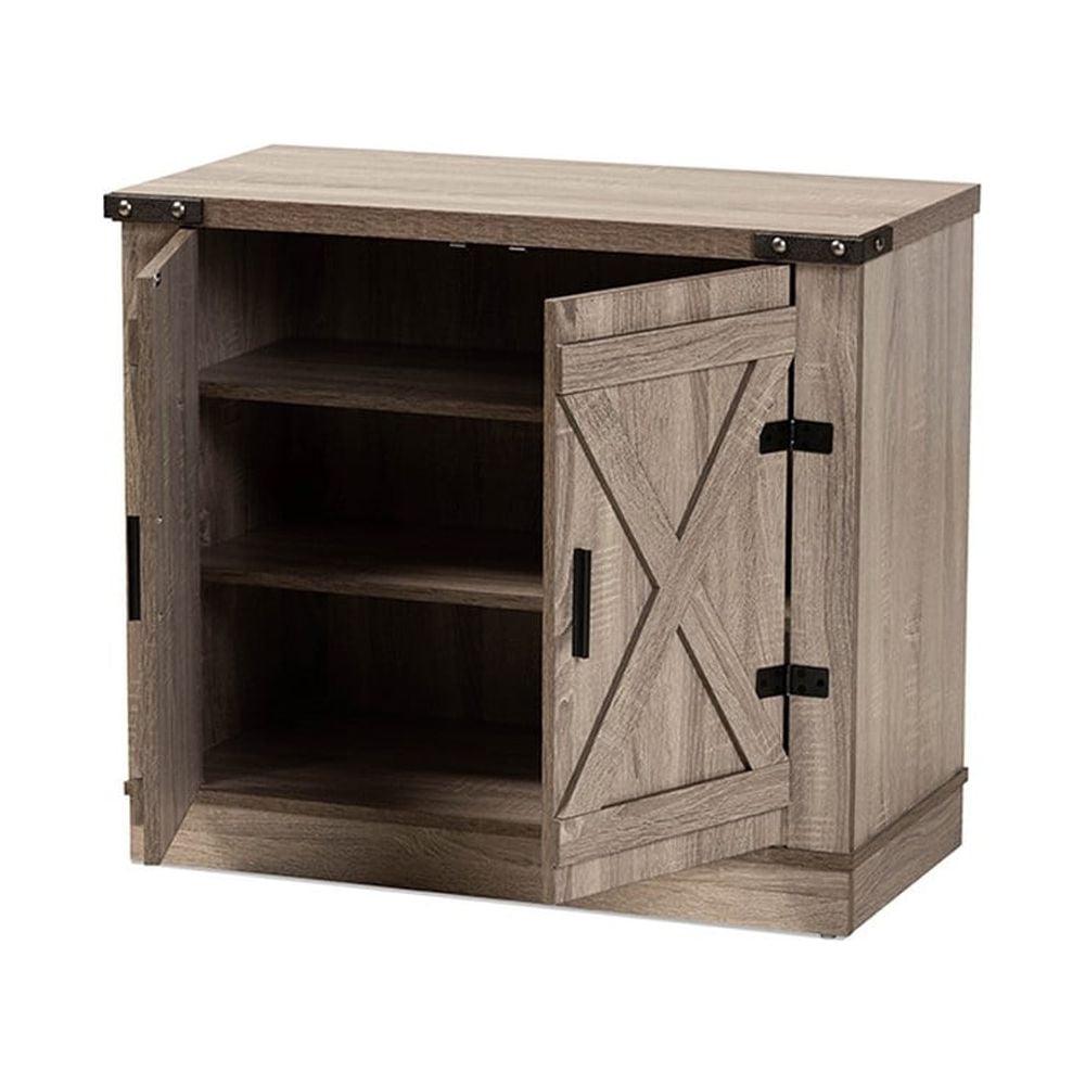 Wayne Modern Contemporary Farmhouse Oak Brown Finished Wood 2-Door Shoe Storage Cabinet Featuring an eye-catching farmhouse inspired design, the Wayne shoe cabinet is a stylish solution to organizing your entryway. Made in Malaysia, the Wayne is crafted from sturdy wood finished in a light oak brown. The hinged doors reveal three spacious shelves capable of storing around 9 pairs of shoes, depending on size. Requiring assembly, the large, rectangular tabletop offers ample surface area to place keys, mail, and other miscellaneous items. Showcasing a striking aesthetic that adds personality to any space, the Wayne shoe cabinet is sure to elevate any home.