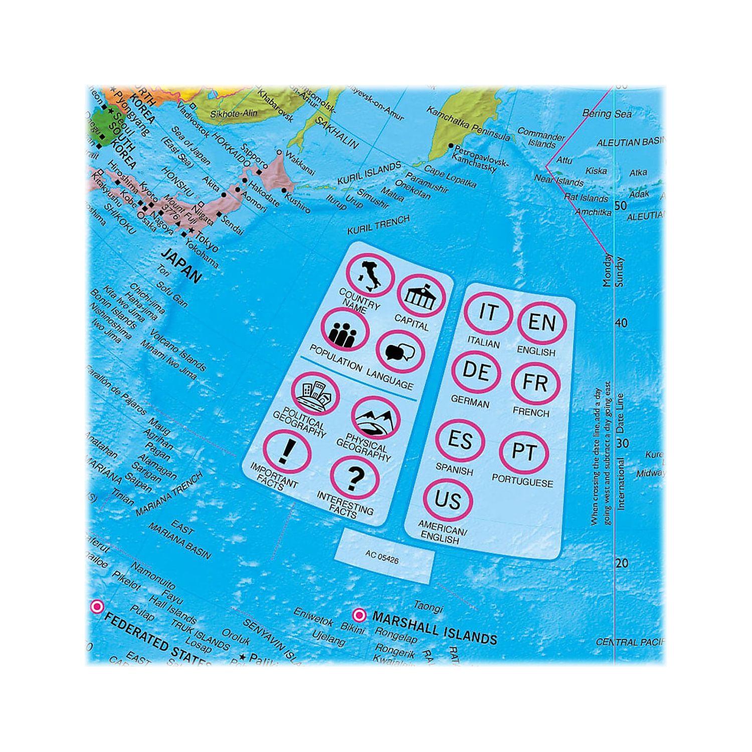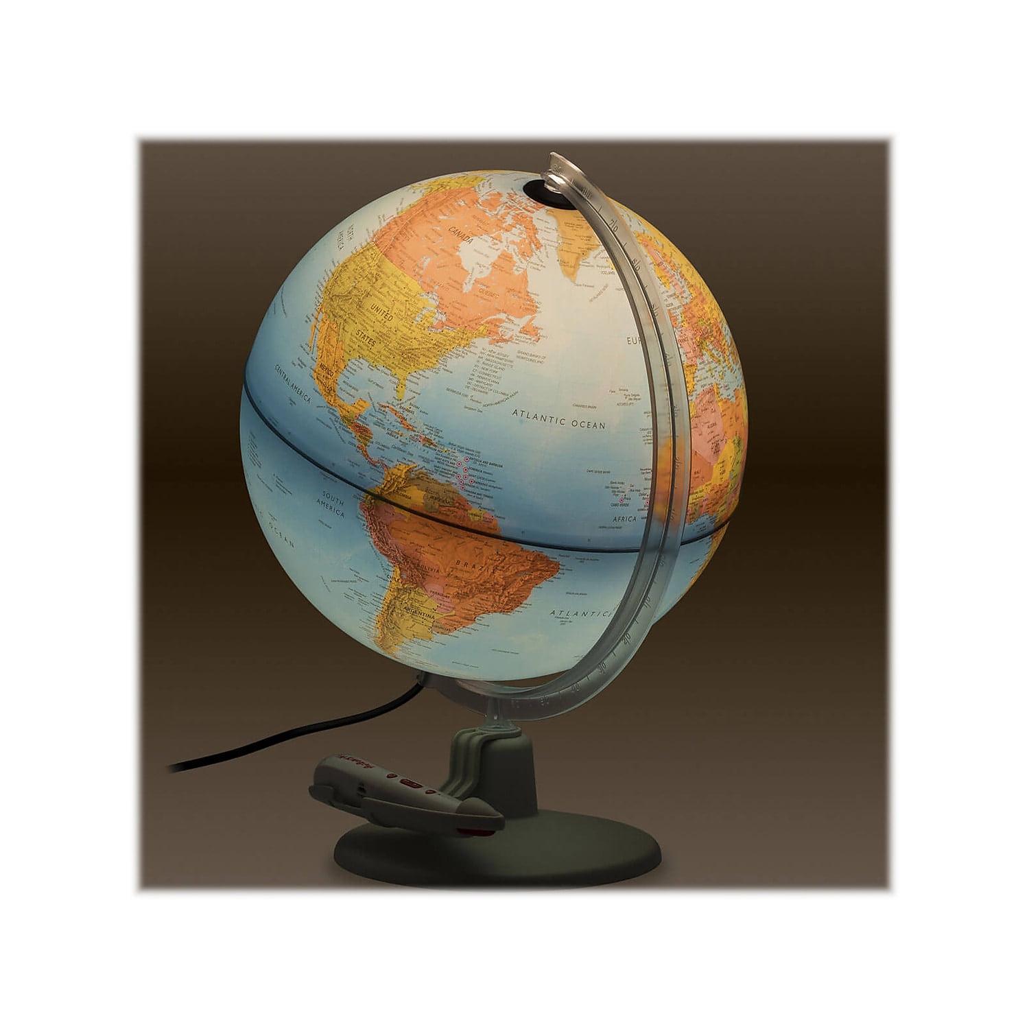 – Includes internal LED light, a USB cord with inline switch, and a 5V outlet power plug; the USB cord can easily be unplugged when illumination is not required. Contains more than 300 pieces of information on geography. 1-year manufacturer limited warranty.