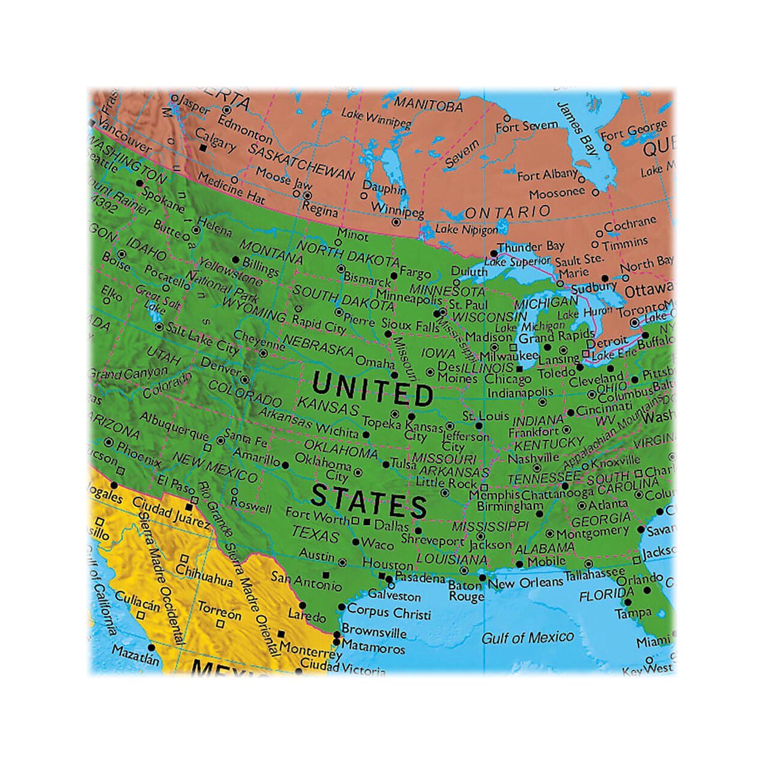 – Size: 12″Dia. Includes four short menus (Country Name/Population/Capital/Language) and four menus with detailed information (Physical Geography/Political Geography/Important Facts/Interesting Facts). Features talking maps of US and Canada (names of states and their capitals).