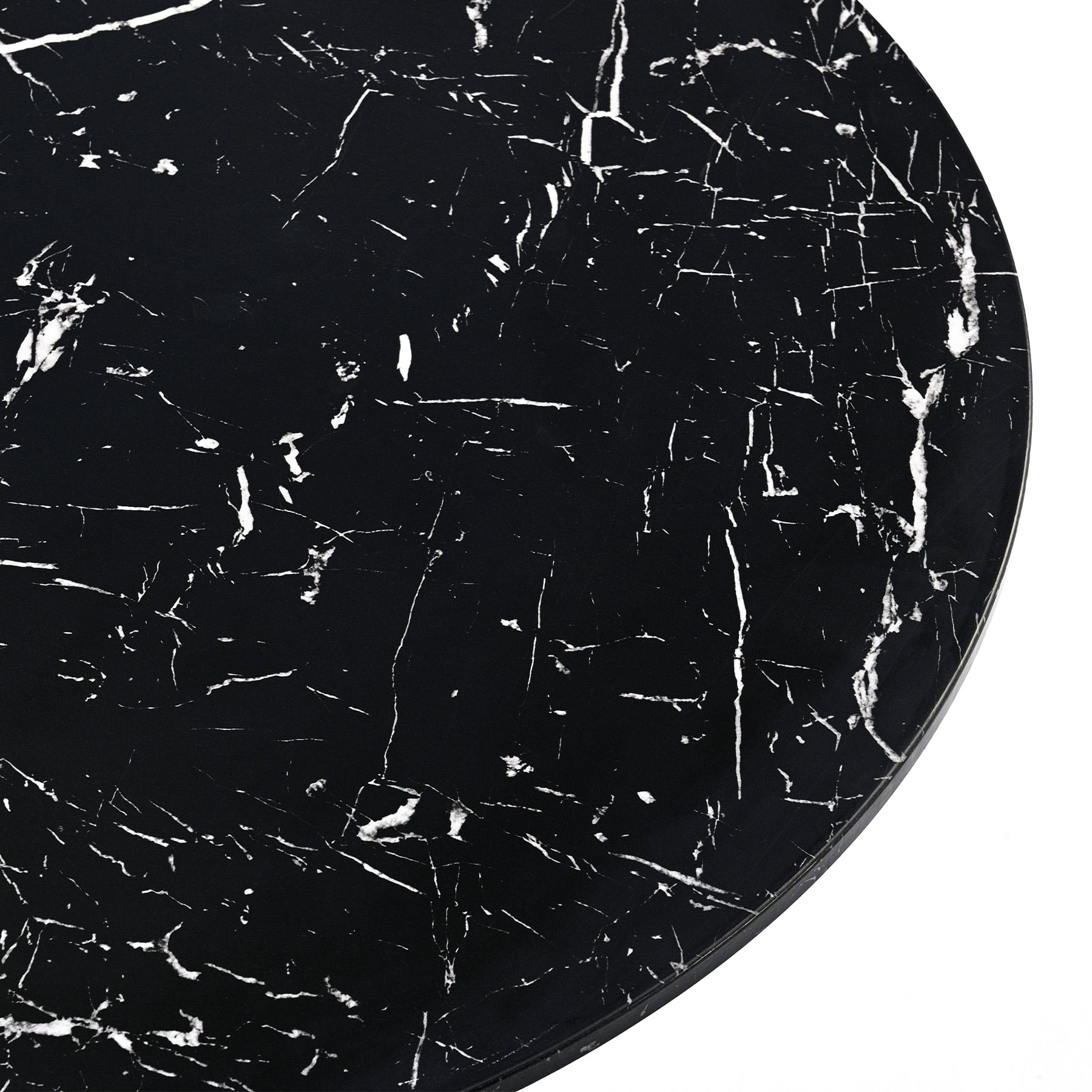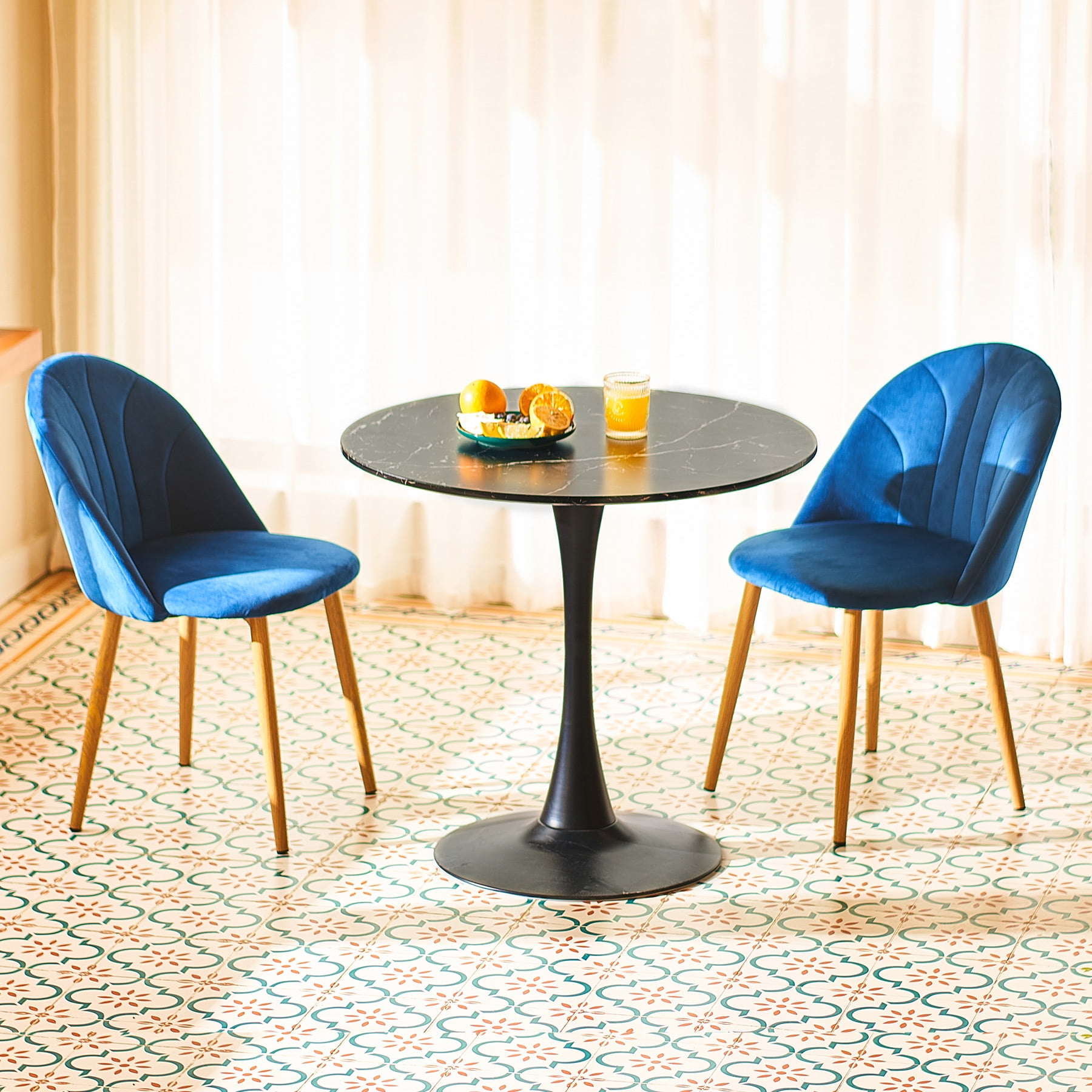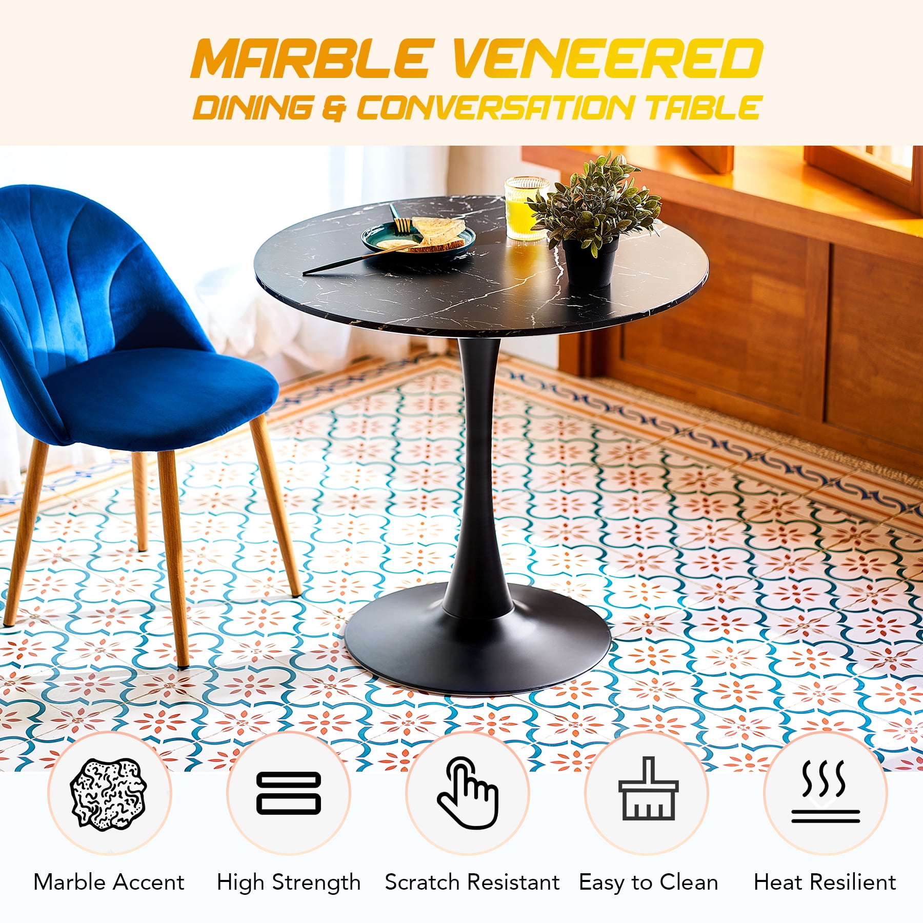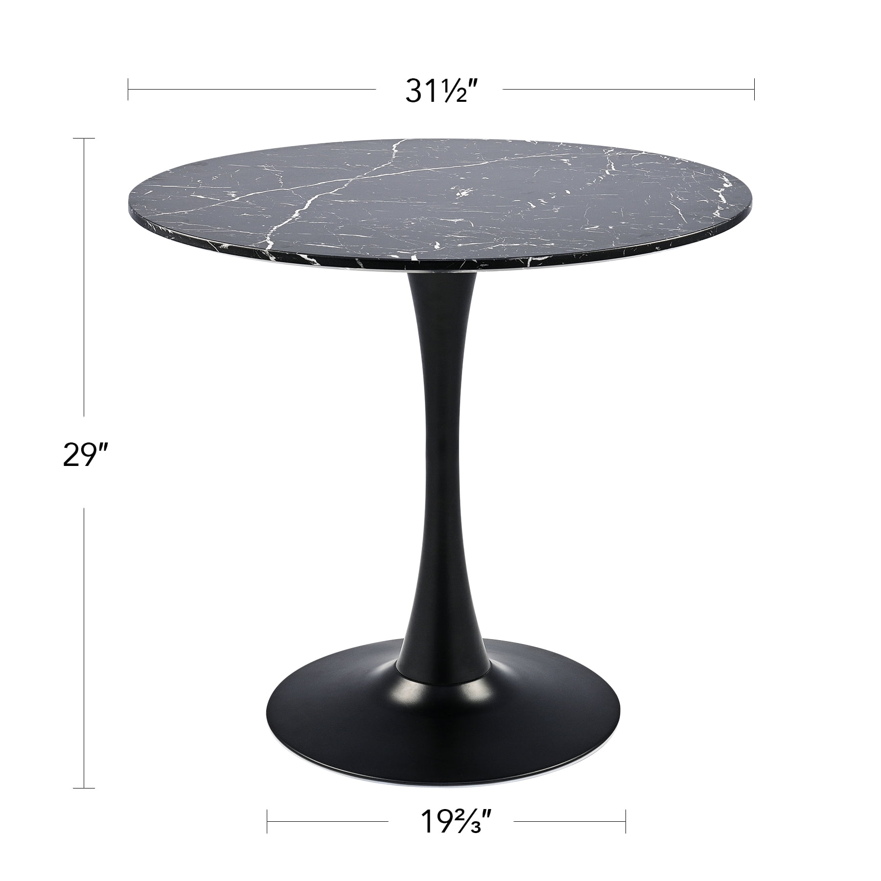NOOK FOR 2-4: Without defined edges and designated sides, this round dining table creates a romantic nook for two but also allows you to squeeze in another 2 chairs for a small family gathering or bestie party CONTEMPORARY STYLE: The slim footprint and the elegant marble accents of this round dining table make it an ingenious addition to any dining room or eat-in kitchen, seamlessly blending with room decors from modern minimalist to farmhouse boho MADE TO LAST: The beautiful marble veneer over the MDF tabletop is scratch-resistant and super easy to clean while the metal frame and base are sturdy enough to hold up to 165 pounds and are also lacquered to last through years of dinner parties EXCEPTIONALLY STABLE: The nearly 20-inch tulip pedestal is weighted to anchor your coffee table in place on any flooring but meanwhile does not invade your leg space, keeping things from getting wobbly or too crowded under the table SET UP IN MINUTES, LAST FOR YEARS: Predrilled holes underneath the tabletop guide quick and easy assembly, with all necessary tools included. You’ll be done in minutes: just align the legs, tighten their bolts, and enjoy! Round, rectangular, or square? If you’re looking for a dining table that takes up less space, creates a more intimate setting, and promotes easy-flow conversations, you should definitely go with the round one! This understated round dining table smartly combines a sleek shape and vintage marble accents, instantly bringing your dining and entertaining experience to a new level. Measuring 31.5 inches in diameter, our kitchen table has a small footprint but still works well in spaces both small and large. Perfect for everything from impromptu family parties to card games with friends, this dining room table carves out a relaxing dining nook for parties of 2-4. The MDF tabletop and sturdy metal frame strongly hold up to 165 pounds. Don’t be fooled by the beauty of the tulip base to assume this table is a delicate piece of furniture. The tulip metal pedestal not only makes it easy to gather chairs around but also makes the dreaded table-wobble a thing of the past. Easy to assemble, this functional yet elegant modern accent table is ready to welcome you into the minimalist world and certain to brighten your life for years to come. Specifications Material: MDF, Metal, Marble Veneer Color: Black Tabletop Diameter: 31.5 in. (80 cm) Height: 29 in. (74 cm) Base Diameter: 19.6 in. (50 cm) Seating Capacity: 2-4 Weight Capacity: 165 lb. (75 kg) Net Weight: 26.5 lb. (12 kg) Package List 1 x Round Dining Table 1 x Instructions