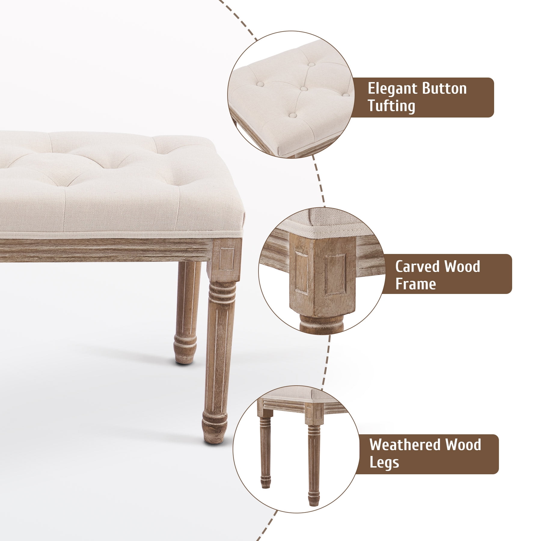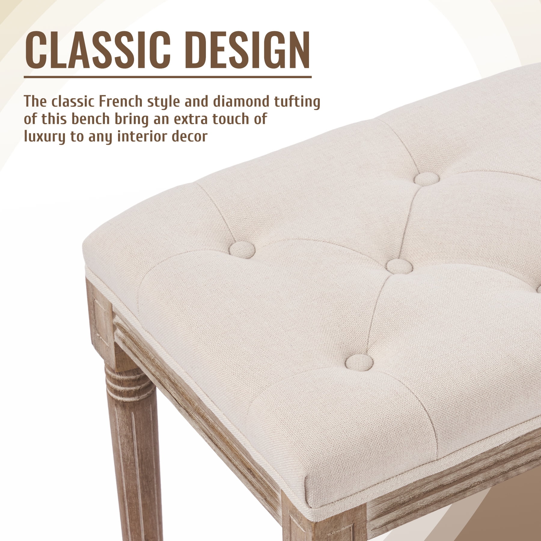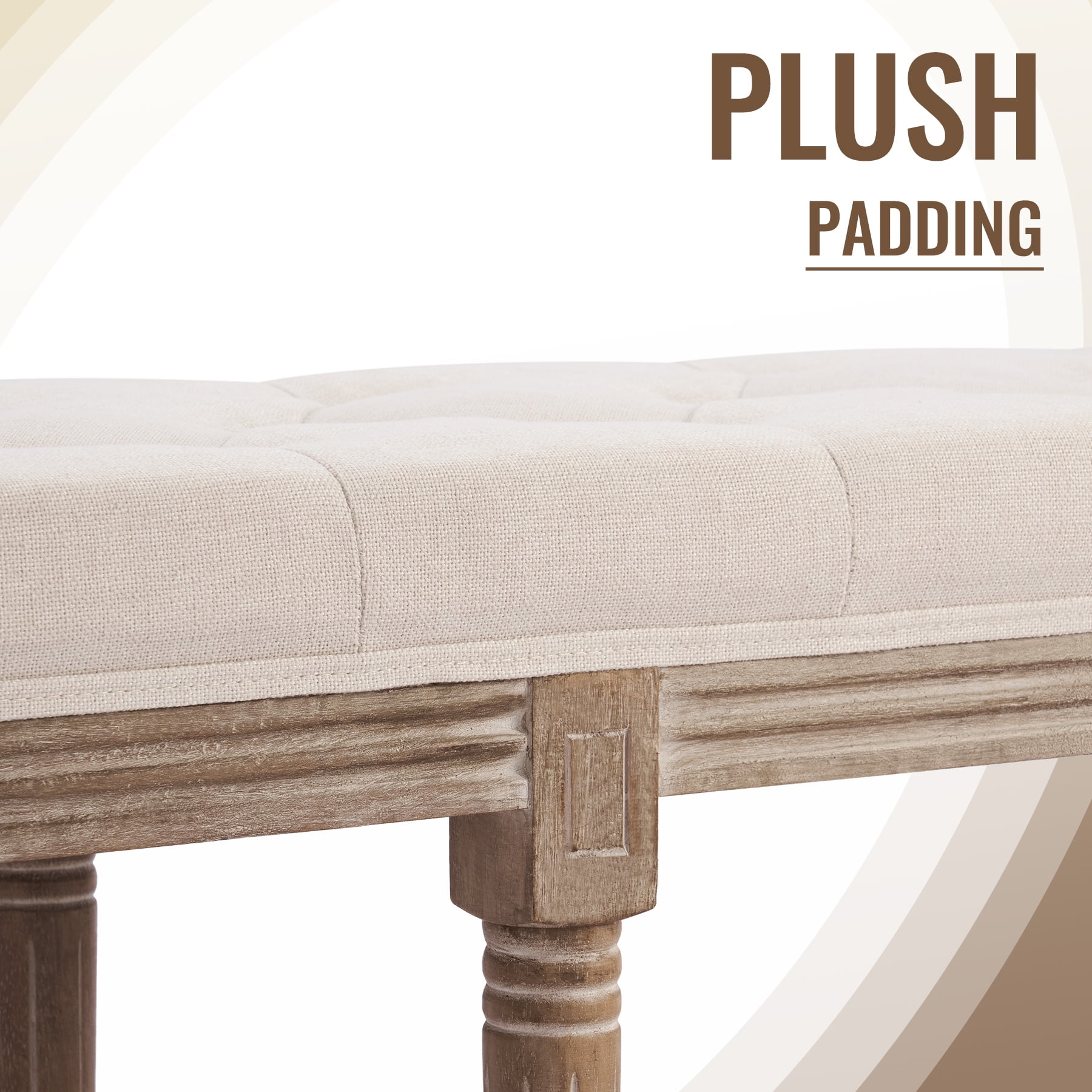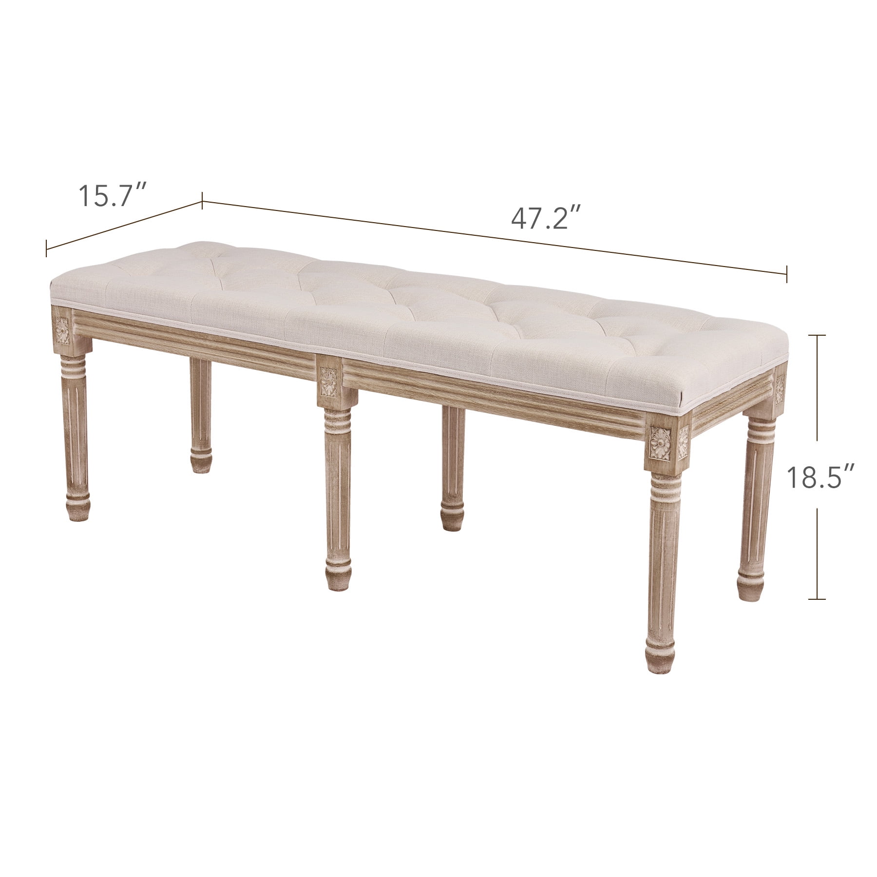 FUNCTIONAL ART: Enjoy all the panache of vintage French furniture with none of the discomfort or worry! This extra-long upholstered bench by Wayshire combines classic Old World style with modern materials and comfort suits any home decor from rustic farmhouse to mid-century to modern. SUPERIOR QUALITY: Our vintage bench’s birch frame and rubberwood legs come with a pleasing weathered finish but are themselves highly durable, boasting a 330-pound weight capacity and family-friendly upholstery. The floor-friendly rubber pads hold but protect any surface. GRACEFUL ACCENTS: The thick foam padding of this 48×16.7 inch bench incorporates diamond tufting, while the solid wooden legs are delicately carved with vintage patterns. HIGHLY VERSATILE: An easy fit in any space, this multipurpose bench works great in foyers and entryways but is just as suitable as a comfortable piano bench, as a handy bedroom bench, or as extra seating in your dining or living room. Want to enjoy classic Old World charm without sacrificing American strength or functionality? Wayshire ‘s plushly upholstered bench is here for you! Styled after vintage French furniture, this extra-long 48″ hallway or entryway bench has traditional carved ornamentation but offers modern comfort with its thick foam padding. The birch frame and rubberwood legs are weathered to an attractively lived-in look but will give you 330 pounds of capacity and years of dependable service. Functional pomo art with classic taste, this bench works in any space and decor from traditional farmhouse to contemporary minimalist. Whether cozied up to a piano or used as an end of bed bench, this excellent modern seating is sure to brighten your room and your life. Start enjoying a more comfortable and stylish life today with Wayshire ‘s graceful vintage furniture! Specifications Materials: Birch, Rubberwood, Linen, Cotton Foam Color: Beige Dimensions: 48 x 16.7 x 18.9 in. (122×42.5×48 cm) Weight Capacity: 330 lb. (150 kg) Net Weight: 20.7 lb. (9.4 kg) Package List 1 x Upholstered Bench 1 x Instruction Manual