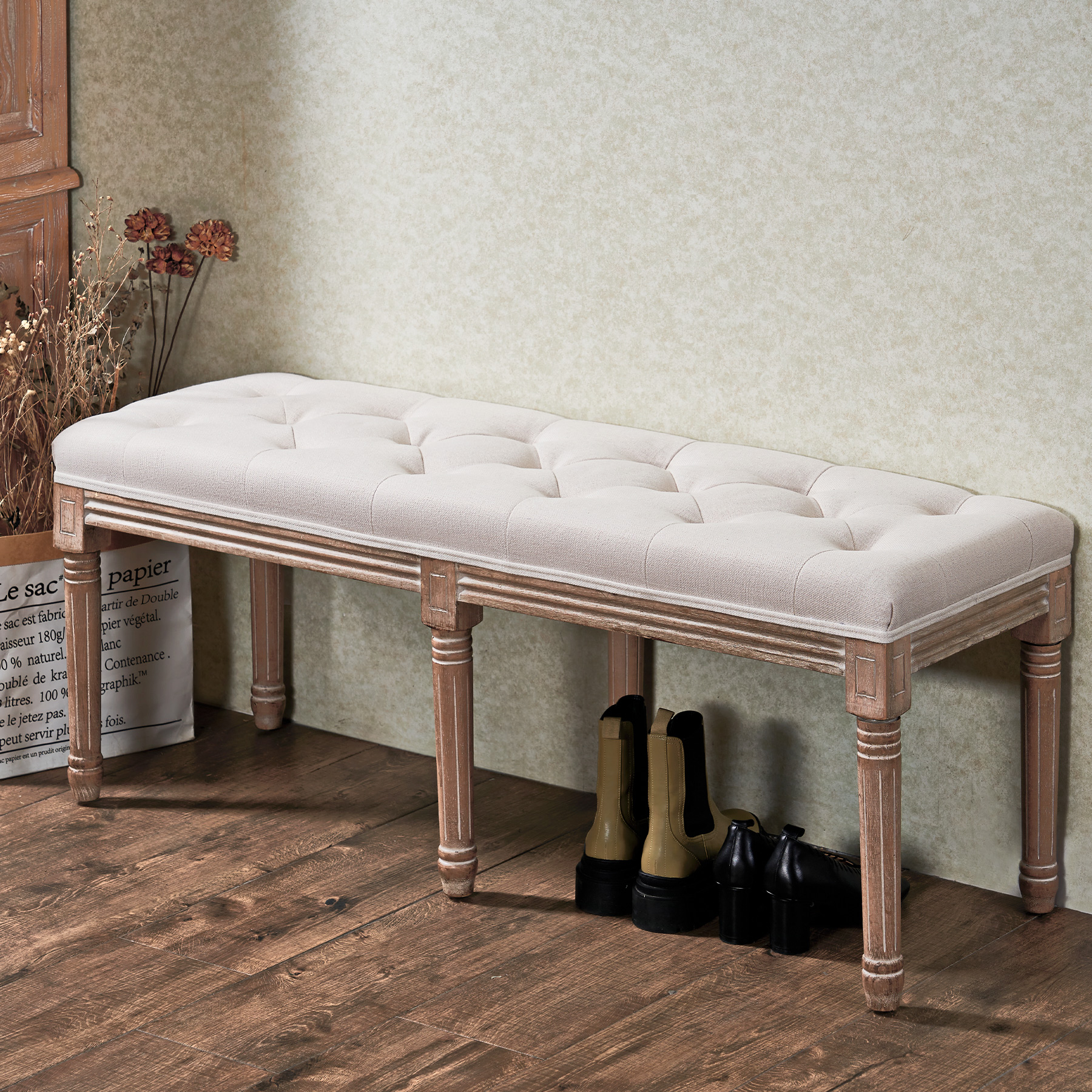 Wayshire 48″ French Vintage Tufted Bench, Birch & Rubberwood, Beige