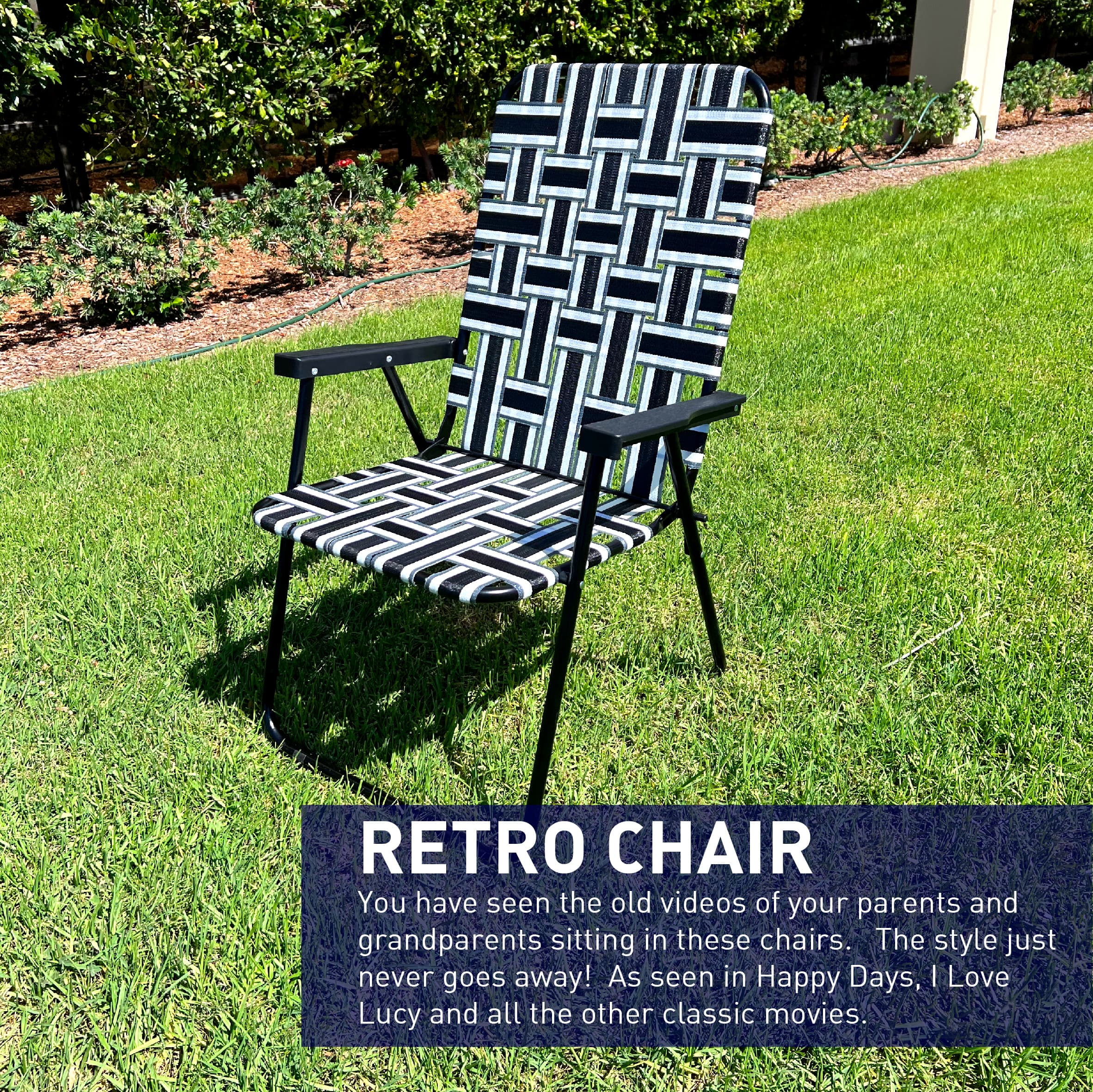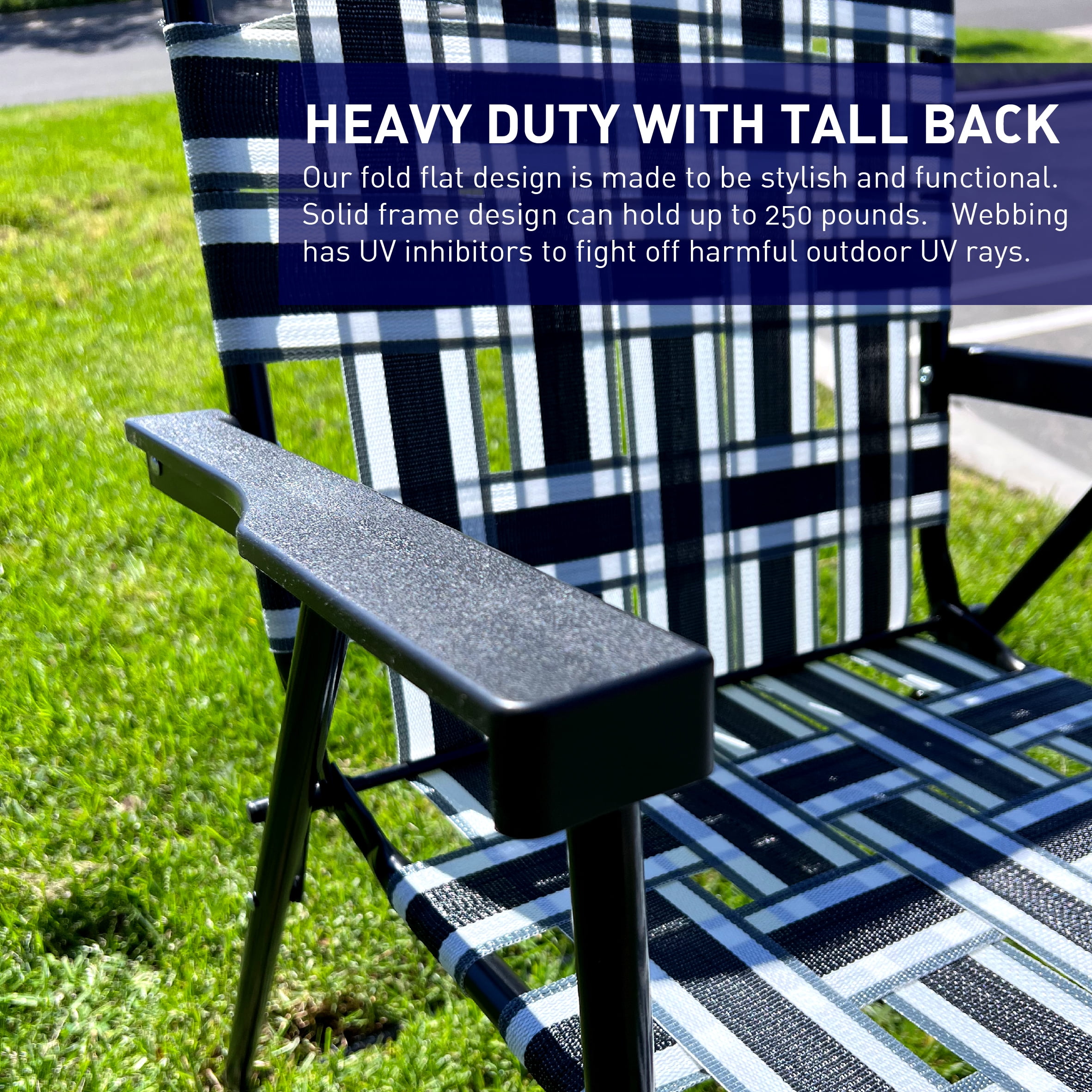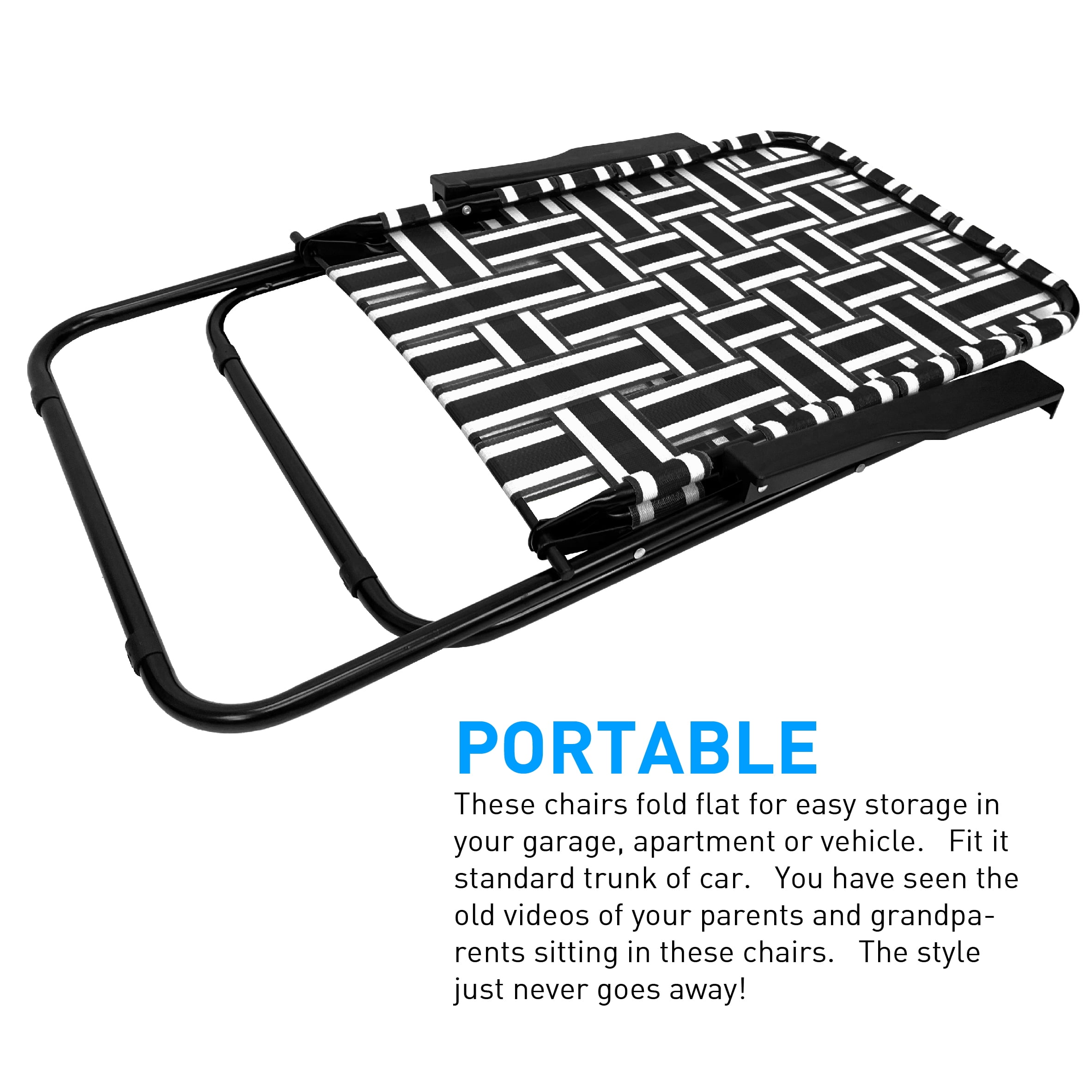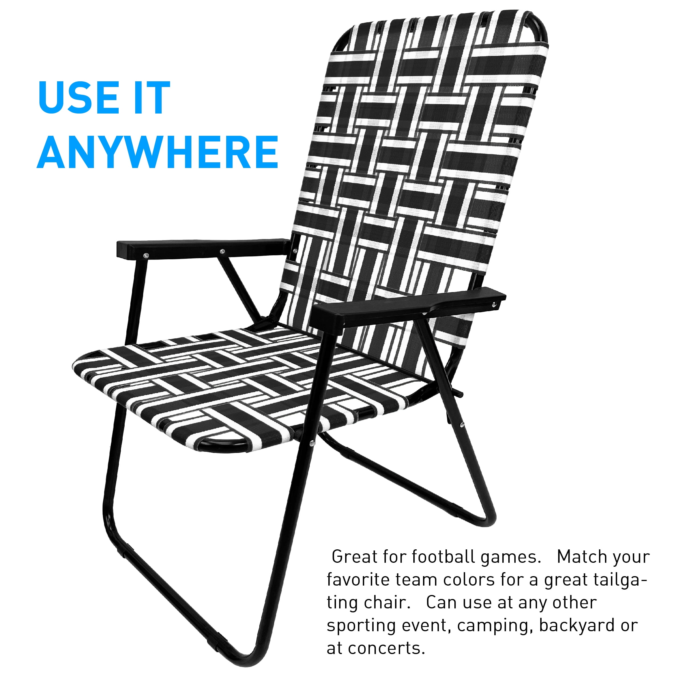 MULTIPLE COLOR COMBINATIONS – We offer multiple color combination so you can match to your favorite football, soccer or backyard. Great for theme parties and team building. Easy, lightweight and affordable. PORTABLE – These chairs fold flat for easy storage in your garage, apartment or vehicle. Fit it standard trunk of car. You have seen the old videos of your parents and grandparents sitting in these chairs. The style just never goes away! RETRO CHAIR – You have seen the old videos of your parents and grandparents sitting in these chairs. The style just never goes away! As seen in Happy Days, I Love Lucy and all the other classic movies. USE IT ANYWHERE – Great for football games. Match your favorite team colors for a great tailgating chair. Can use at any other sporting event, camping, backyard or at concerts. HEAVY DUTY WITH TALL BACK – Our fold flat design is made to be stylish and functional. Solid frame design can hold up to 250 pounds. Webbing has UV inhibitors to fight off harmful outdoor UV rays. PORTABLE – These chairs fold flat for easy storage in your garage, apartment or vehicle. Fit it standard trunk of car.|RETRO CHAIR – You have seen the old videos of your parents and grandparents sitting in these chairs. The style just never goes away! As seen in Happy Days, I Love Lucy and all the other classic movies.|USE IT ANYWHERE – Great for football games. Match your favorite team colors for a great tailgating chair. Can use at any other sporting event, camping, backyard or at concerts.|HEAVY DUTY WITH TALL BACK – Our fold flat design is made to be stylish and functional. Solid frame design can hold up to 250 pounds. Webbing has UV inhibitors to fight off harmful outdoor UV rays.