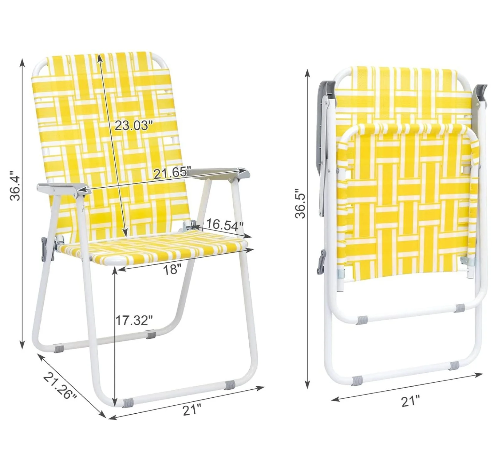 【UPGRADED COMFORT】Use of durable and fade resistant web and heavy duty powder coated steel, this foldable lawn chair can be long time used at outdoor. Breathable fabric helps dissipate heat and smooth plastic handrail for . Nice to use in each season 【STABLE DETAILS】Made of high quality steel A shape frame and wear-resistant web fabric, the folding beach chair is not easy to sink while seating. Special processing and foot sleeve design increases stability and reduces wear 【PORTABLE & LIGHTWEIGHT】The whole weight of webbing beach chair is 9 lb. After folding, the size is 22”x2.8”x34.5”(LxWxH). Weight Capacity: 265lbs. Perfect to store when no use or take out in the car for camping, beach or picnic 【NO ASSEMBLE】Comes with complete assembled lawn chairs. No assemble needed. One second to open or fold this beach chair. Easy to carry out for outdoor activities 【MULTIPURPOSE】Bright color schemes make beach chairs vibrant. Roomy seats are suitable for most people. Perfect for beach, camping, patio, lawn, concert, backyard, picnic, BBQ, festival sand, soccer games or outdoor activities