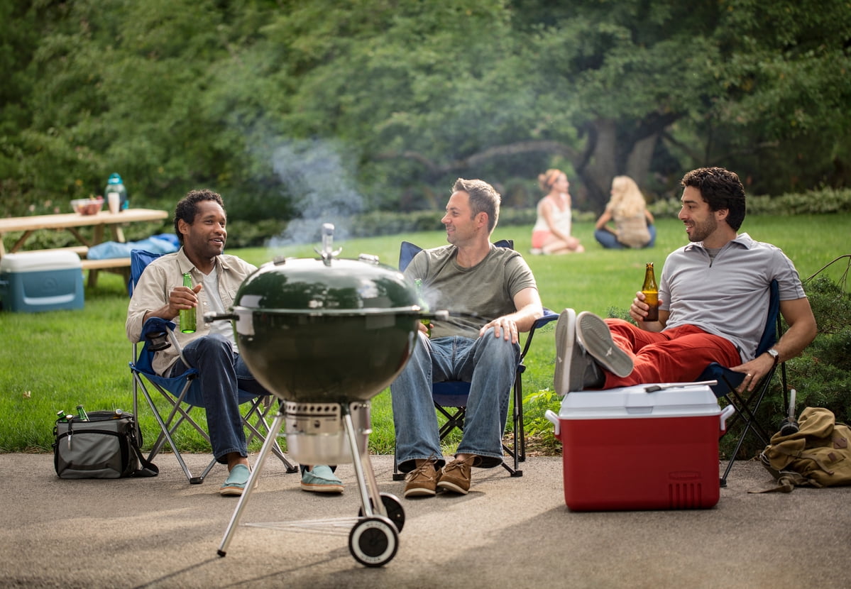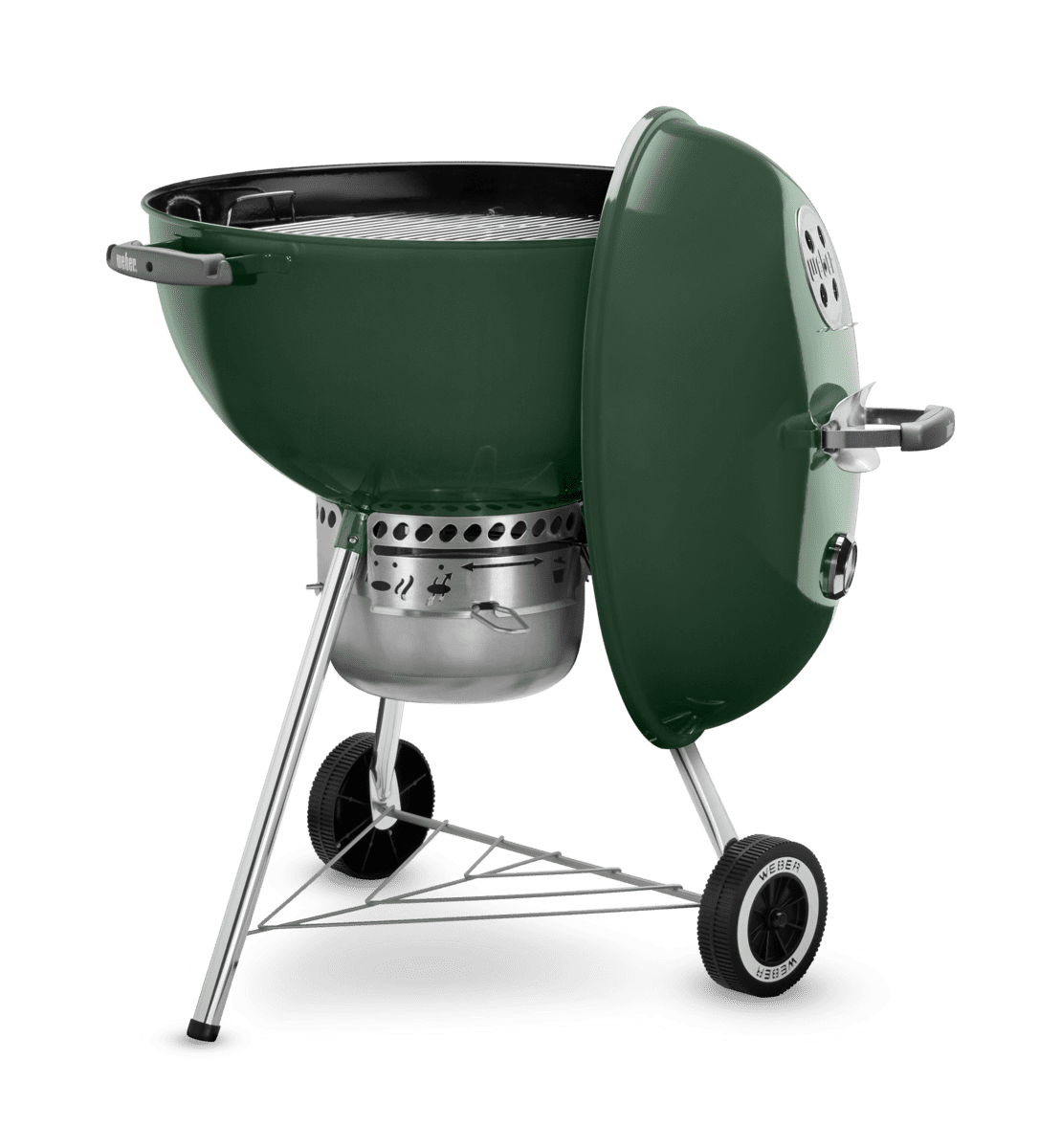 Weber Original Kettle Premium 22-Inch Charcoal Grill – Green – 14407001. 14407001. Charcoal BBQ Grills. Experience the charcoal revolution that started it all with a Weber kettle-style BBQ grill! Weber kettles combine traditional, iconic design with innovation in production and versatility. Made of premium-grade U. S. Steel coated with porcelain enamel inside and out, the bowl and lid of the Weber Original Premium charcoal grill are precisely formed to allow heat to circulate evenly inside the grill and across the 363 square inches of cooking area. The green porcelain-enamel coating is baked on, fusing the finish to the steel to prevent rusting and peeling through years of use. The aluminized steel One-Touch cleaning system makes clean-up hassle free. As you rotate the handle, three blades in the bowl move ash through the vents and down into the removable, high-capacity aluminum ash catcher below, which is enclosed to prevent ashes from blowing away and creating a mess. Only the unburned coals remain in the bowl and can be re-lit for your next barbecue, which helps you save money on fuel. The adjustable, no-rust aluminum top vent provides the proper airflow needed for perfect grilling and, along with the built-in thermometer, helps you to control the temperature inside the grill. Weber Original Premium grills also feature hinged plated steel cooking grates, for easily adding more charcoal, three glass-reinforced nylon handles that will withstand the elements for the life of the grill, two of which have built-in tool hooks, and a hook that conveniently allows you to hang the lid on the bowl while you grill. Aluminum legs elevate the grill to an ideal height for grilling and two durable all-weather wheels, that are virtually indestructible, make moving the grill easy. A classic, dependable design, the Weber Original Premium Kettle charcoal grill is engineered with the backyard griller in mind!…