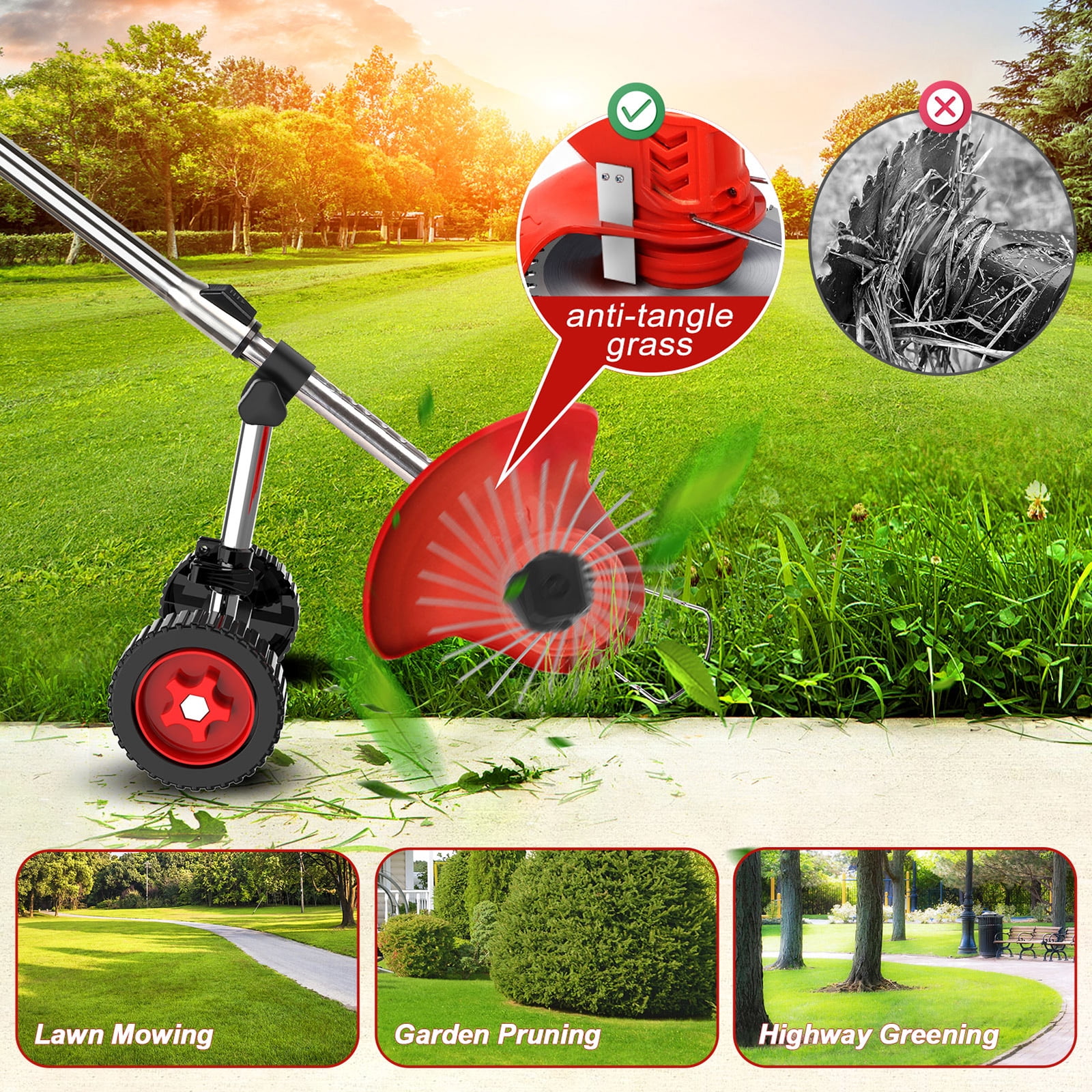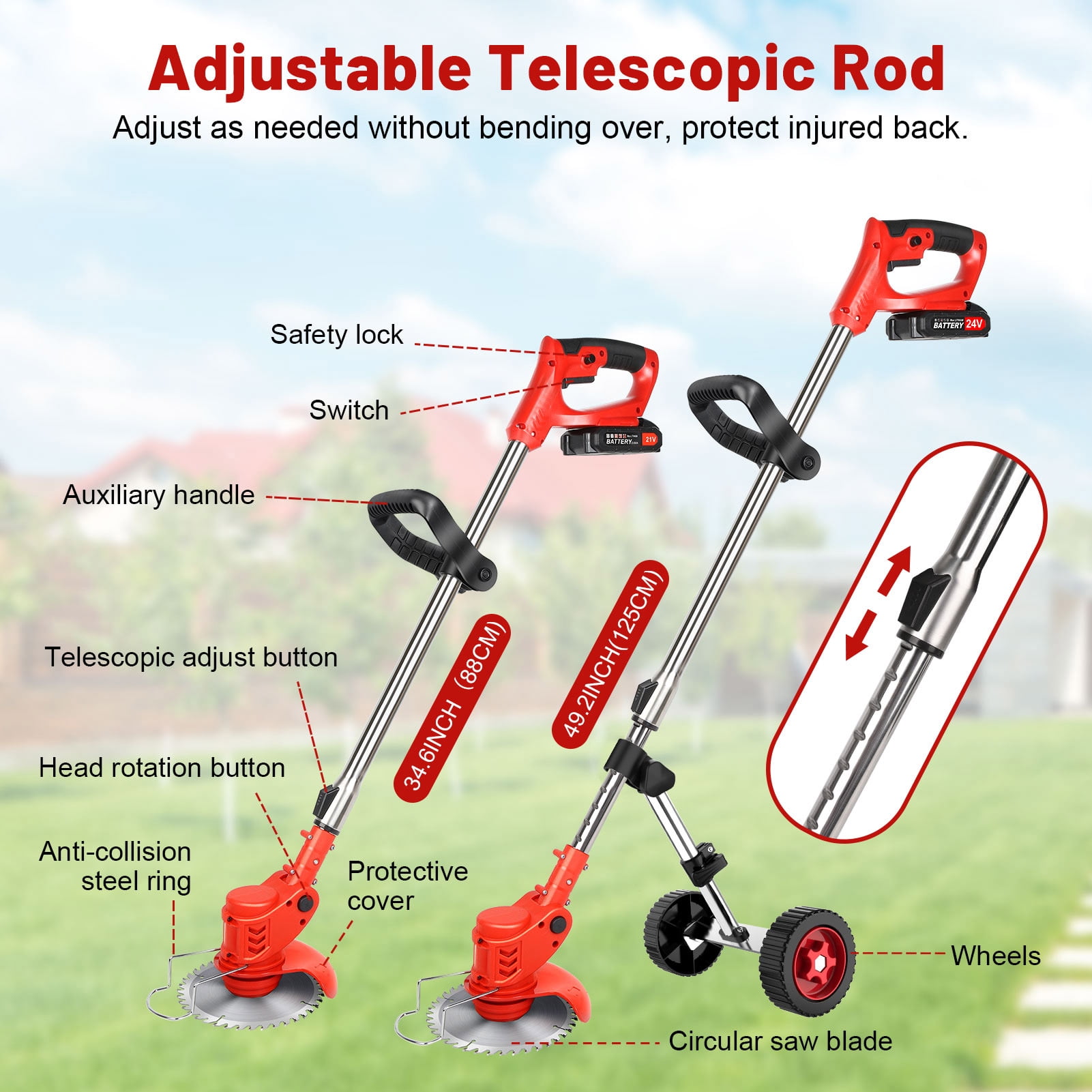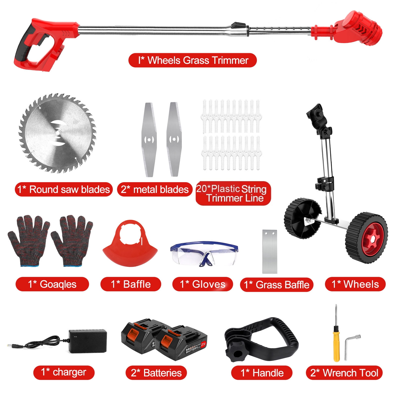 ☘️【Powful and Lightweight Cordless Weed Eater 】The electric weed eater battery powered use durable and reliable weed wacker cordless motor that provides excellent performance. ☘️【High-efficiency Battery】This electric brush cutter is equipped with TWO 2.0Ah Batteries, each one working time 40-60mins (depending on your working load) complete the weeding task in one go! ☘️【3-IN-1 edger lawn tool cordless】This battery operated weed wacker with charger is not only a grass trimmer but also a wheeled lawn edgers battery powered sidewalk edger ☘️【Mulitifunctional lawn edgers battery powered】Grass trimmer is equipped with 3 types of blades: 6 inches Saw Blades for trimming thick shrub branches/heavy bushes (a thickness of about 1-2 inches). ☘️【Version Upgrade with Side Cutting Blade】According to the customer’s experience, we upgrade a new version walk behind brush cutter with a side cutting blade. 🏆Product parameters: Motor: 800W No load speed: 21000 RPM Battery: 24V 2000 mAh Lithium Battery Charging time: around 2-3 hours/ per battery No loading time:120-150mins Working cutting time: 40 to 60 minutes 🏆UPGRADED WHEELS: 1.Adjust direction of small buckle to adjust the wheel angle 2.The triangular structure of the stand is more stable, ensuring that it can work in the most complex environments. 3.Wider tires allow you to push the weed eater more smoothly. 4.90°adjustable machine head for easy cutting at hard to reach areas. ⚡Package include: 1 * cordless grass trimmer 2 * stainless steel blades 1 * alloy saw blade 2 * metal string rope 2 * 24V batteries 1 * battery charger 1 * upgraded wheels 1 * goggles 1 * small rotating wrenches 1 * pair of gloves 1 * manual ⛔Tips: – Please fully charge the battery when using the electric weed wacker brush cutter edger for the first time. Charging before it runs out to extend the service life. Please unload the battery immediately after use to keep the power off. – About the Charger. Green Light: 100% fully charged; Red light: is charging; no light or always green: the charger is broken, pls feel free to contact our seller service, if any accessories are lost or damaged, and we will supply a free parts replacement. – Notice! ! ! Please pay attention to safety in using this cordless weed wacker battery powered, wear protective measures, stay away from the crowd and your body, and avoid being injured by the blade. It is forbidden to replace the blade when the power is on!