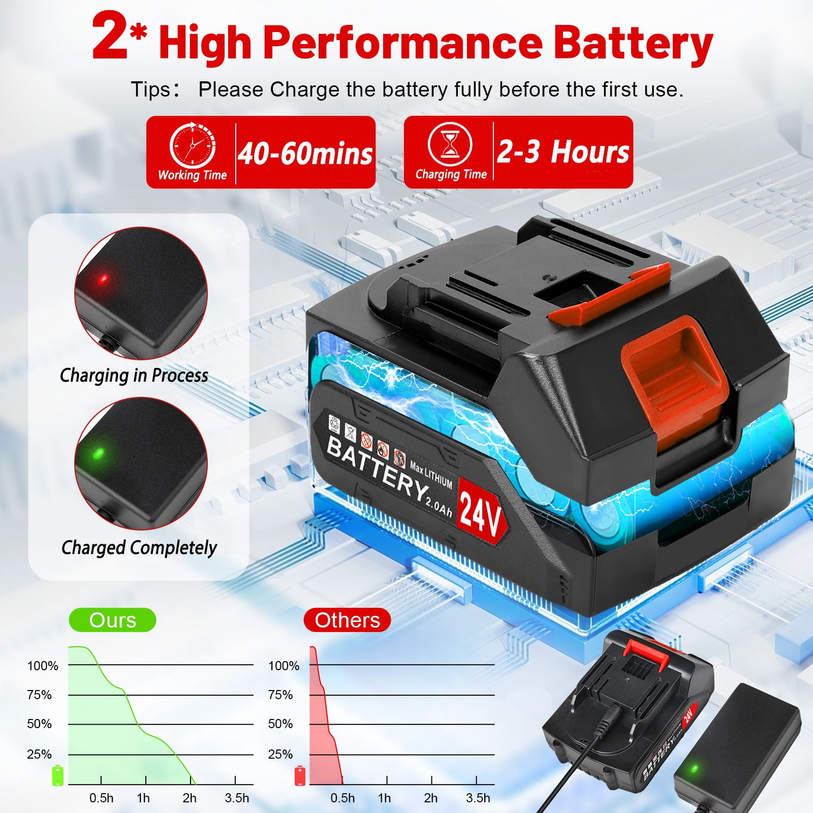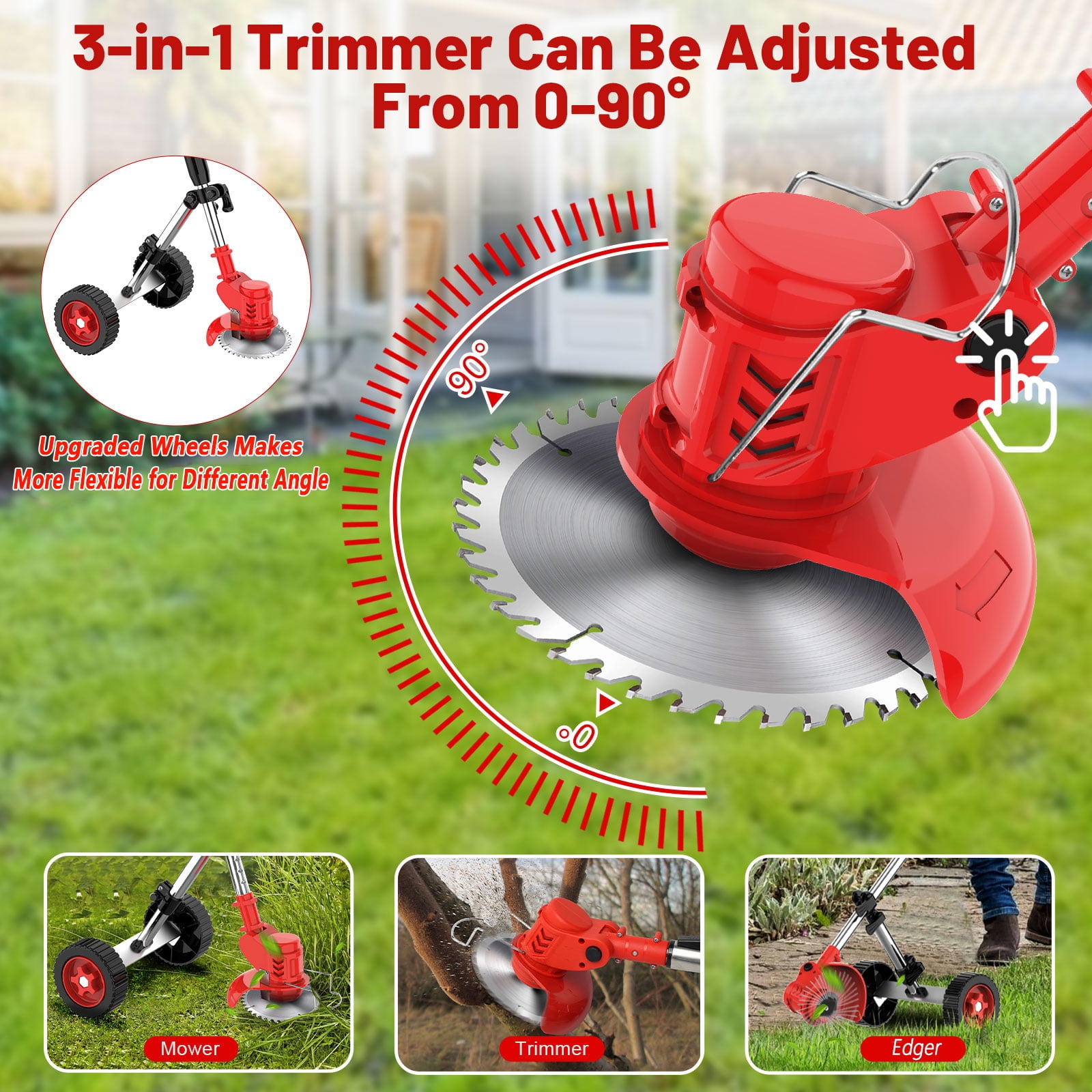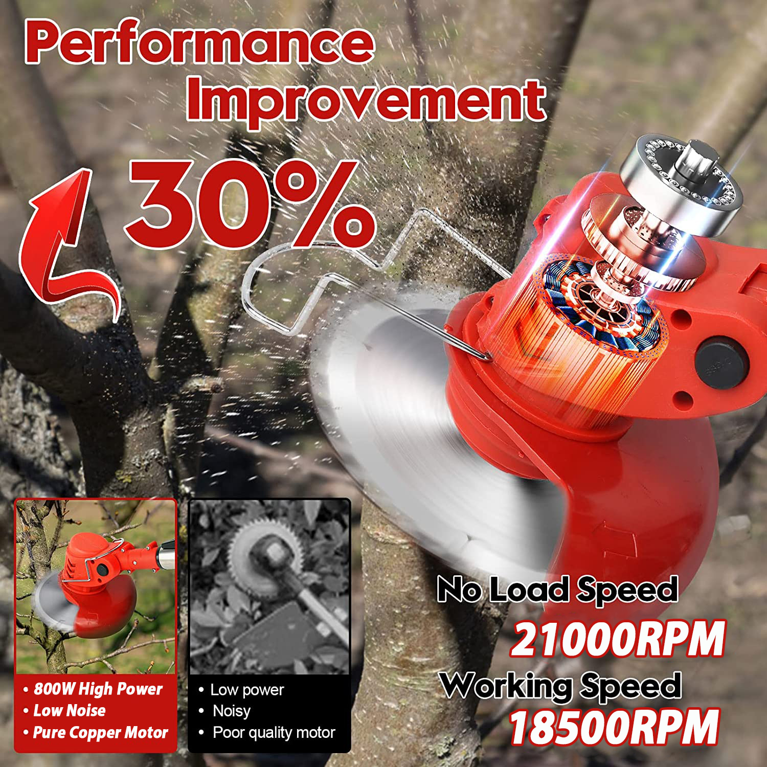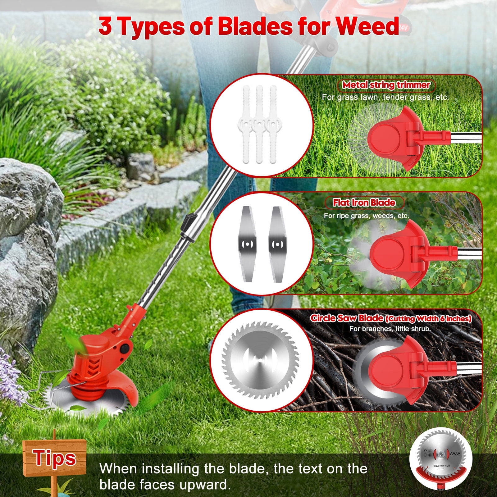 ☘️【Powful and Lightweight Cordless Weed Eater 】The electric weed eater battery powered use durable and reliable weed wacker cordless motor that provides excellent performance. ☘️【High-efficiency Battery】This electric brush cutter is equipped with TWO 2.0Ah Batteries, each one working time 40-60mins (depending on your working load) complete the weeding task in one go! ☘️【3-IN-1 edger lawn tool cordless】This battery operated weed wacker with charger is not only a grass trimmer but also a wheeled lawn edgers battery powered sidewalk edger ☘️【Mulitifunctional lawn edgers battery powered】Grass trimmer is equipped with 3 types of blades: 6 inches Saw Blades for trimming thick shrub branches/heavy bushes (a thickness of about 1-2 inches). ☘️【Version Upgrade with Side Cutting Blade】According to the customer’s experience, we upgrade a new version walk behind brush cutter with a side cutting blade. 🏆Product parameters: Motor: 800W No load speed: 21000 RPM Battery: 24V 2000 mAh Lithium Battery Charging time: around 2-3 hours/ per battery No loading time:120-150mins Working cutting time: 40 to 60 minutes 🏆UPGRADED WHEELS: 1.Adjust direction of small buckle to adjust the wheel angle 2.The triangular structure of the stand is more stable, ensuring that it can work in the most complex environments. 3.Wider tires allow you to push the weed eater more smoothly. 4.90°adjustable machine head for easy cutting at hard to reach areas. ⚡Package include: 1 * cordless grass trimmer 2 * stainless steel blades 1 * alloy saw blade 2 * metal string rope 2 * 24V batteries 1 * battery charger 1 * upgraded wheels 1 * goggles 1 * small rotating wrenches 1 * pair of gloves 1 * manual ⛔Tips: – Please fully charge the battery when using the electric weed wacker brush cutter edger for the first time. Charging before it runs out to extend the service life. Please unload the battery immediately after use to keep the power off. – About the Charger. Green Light: 100% fully charged; Red light: is charging; no light or always green: the charger is broken, pls feel free to contact our seller service, if any accessories are lost or damaged, and we will supply a free parts replacement. – Notice! ! ! Please pay attention to safety in using this cordless weed wacker battery powered, wear protective measures, stay away from the crowd and your body, and avoid being injured by the blade. It is forbidden to replace the blade when the power is on!