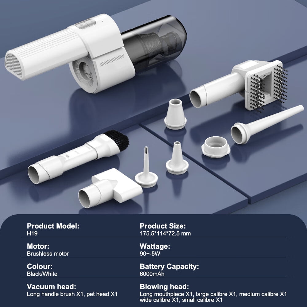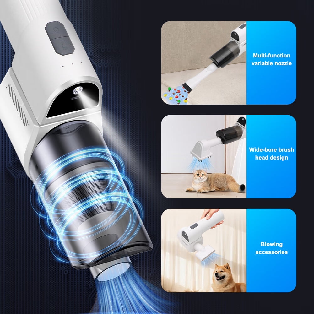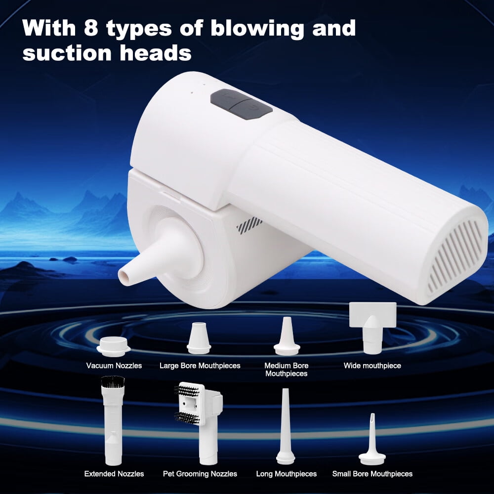 Handheld Electric Vacuum Cleaner Multifunctional – Blowing/Vacuuming/Pumping for Inside/Outside Strong Suction power to clean everywhere pass by Portable and lightweight, no-burden use Suitable for most situation, including car/home/office, keyboard and pet hairs