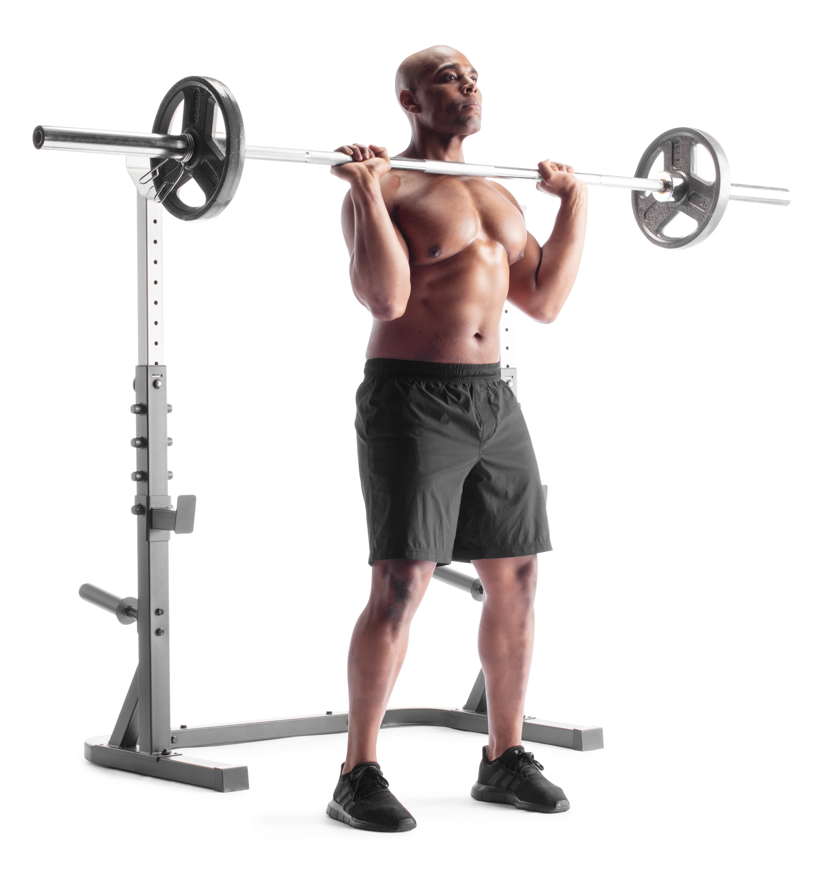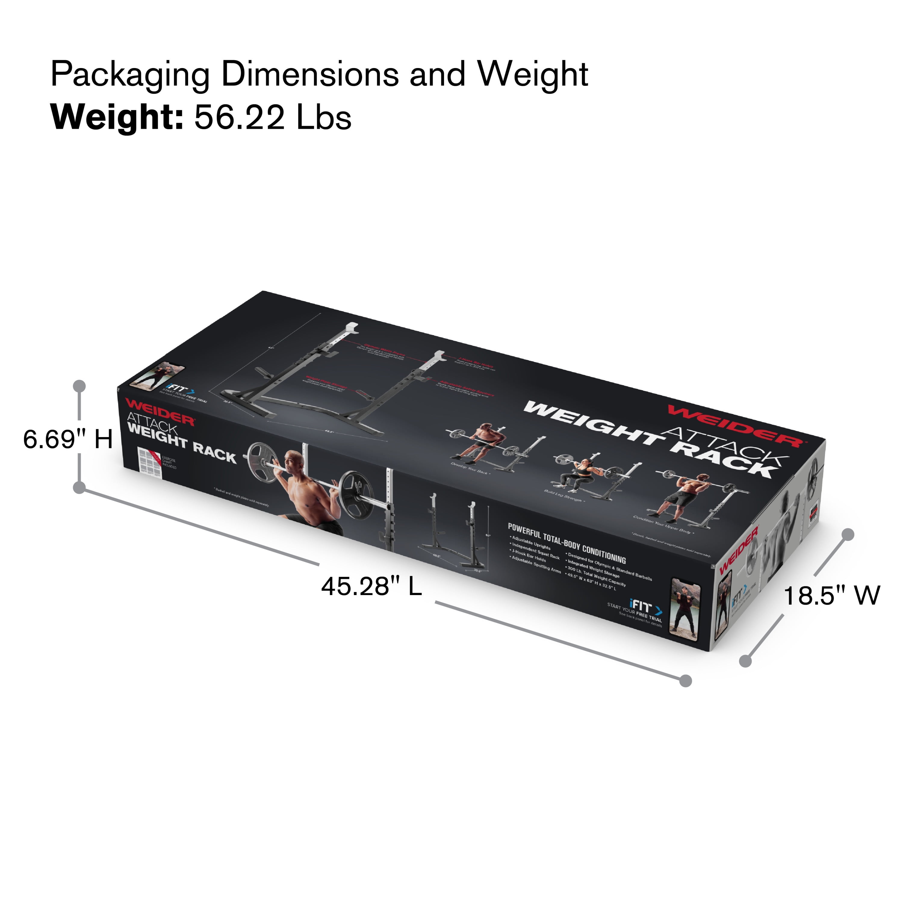 Independent Squat Rack Perform squats, rack pulls, deadlifts, and a variety of other compound exercises with this powerful steel squat rack Use with the Attack Olympic Bench (sold separately) to engage your chest with a variety of other compound exercises Adjustable Spotting Arms Prioritize your safety, especially when lifting alone. These long spotting arms are designed to adjust to your needs and catch any weight that might slip out of your hands or off of your shoulders mid-set Olympic-Sized Uprights Modify the Weider Attack weight rack to fit your frame, lifting style, and exercise preferences for a comfortable and secure workout in your home gym These durable steel uprights can support up to 310 pounds of Olympic weight, which is sold separately Integrated Weight Plate Storage The Attack Olympic Squat Rack features two rear-facing storage pegs for your 2″ Olympic weight plates, which are sold separately 310 Lb. Total Weight Capacity Weight Plates Sold Separately 90-Day Parts & Labor Warranty Visit for more warranty information Footprint: 41 in. H x 25.5 in. W x 70 in. L Model #: WEBE29120