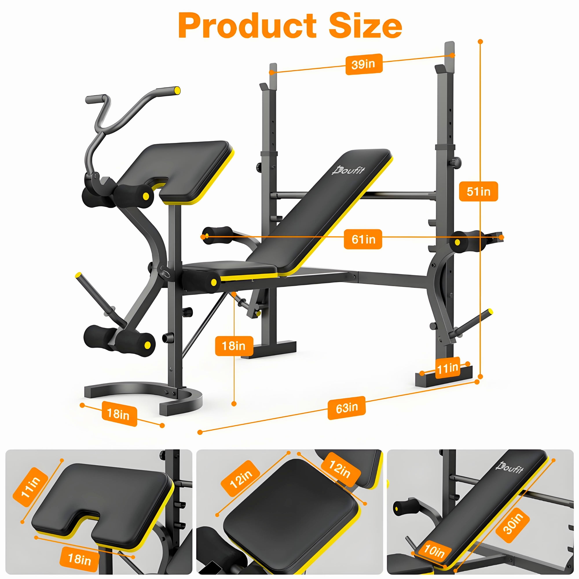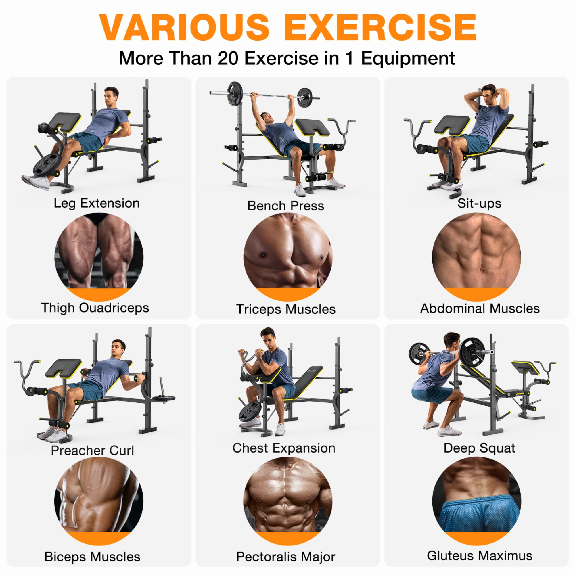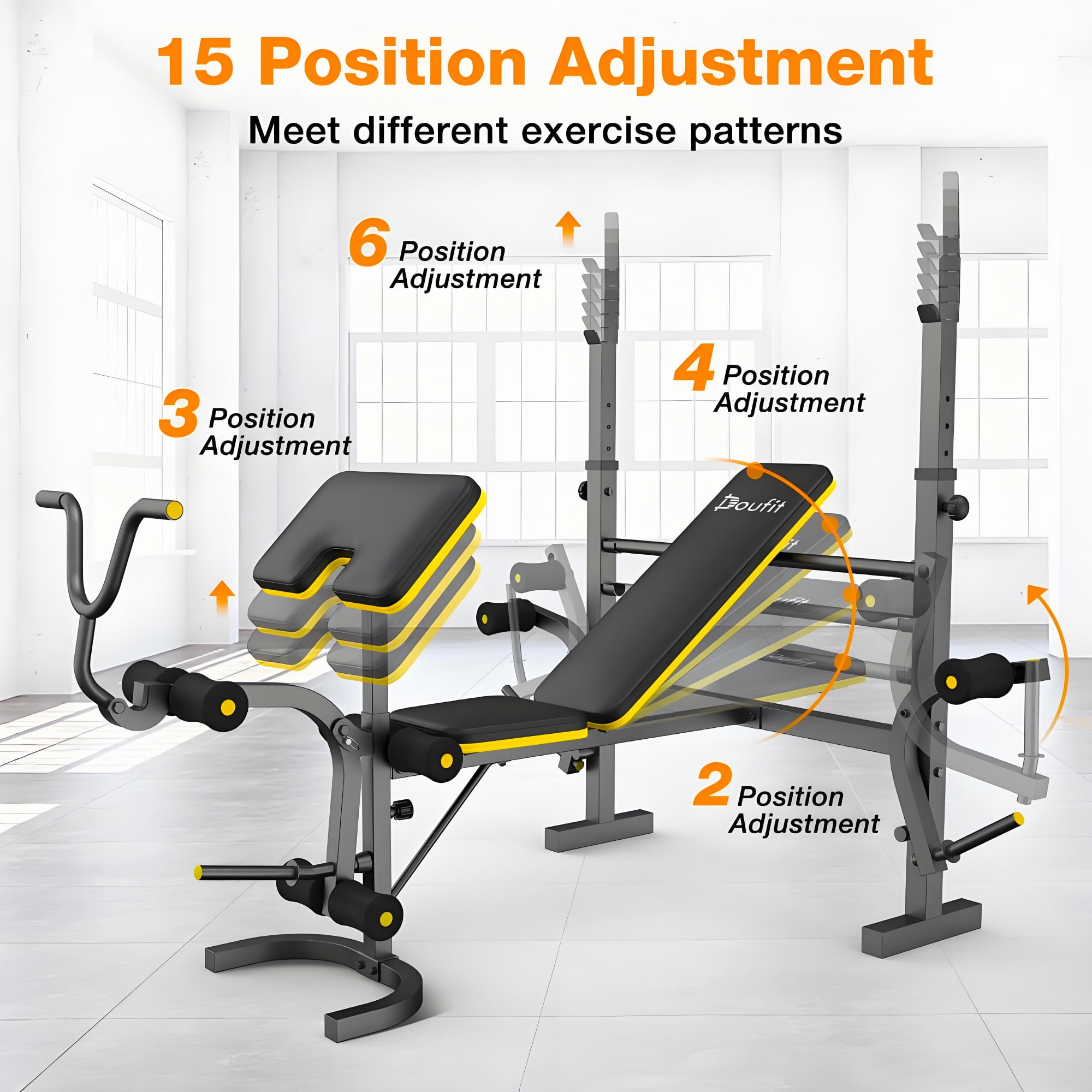 🏋🏻♀️【900lbs Heavy-duty Construction】 Doufit Training Bench is set up by heavy duty stainless steel frame. The thickness of the steel frame is up to 1.5MM. It make this bench set safer and more enduring. The Max capacity is 900 lbs. U-shape rear foot pipe makes the bench set more steady. Heavy duty performance gives you a safe and steady fitness experience. 💪【15 Multi-Adjustable for Full Range Workout】 Doufit adjustable Workout Bench Set designed with 6 barbell rack adjustments, 4 back Adjustments, 3 preacher curl pad adjustments, 2 butterfly arm grips adjustment. You can perform a variety of exercises to fully work out your legs, back, chest, abs, shoulders and arms with Doufit standard weight bench. 🏋【6 in 1 workout bench】 Doufit Multifunctional Gym Bench is designed to leg extension, bench press, sit-ups, preacher curl, chest expansion, deep squat. Equipped with squat rack, leg extension, preacher curl and butterfly arms. Fully exercise legs, back, chest, abs, shoulders, arms by 1 machine, meets all fitness needs. 💪【Antiskid Foot Pads】 Weight benches for home gym with antiskid Foot Pads is more sturdy and stable than others. After repeated testing, it will not move easily during exercise. Stable Design for Safe Training. Bring a safe and stable workout experience. 👍【Comfortable Padding and Foam】 The leather Leg Foam, High density foam cushion, back cushions of Weight Bench Set are firm and soft to deliver maximum comfortable support. Reduces muscle fatigue during workout, makes exercise more comfortable. Soft, wear-resistant, sweat-proof leather, easy to clean.