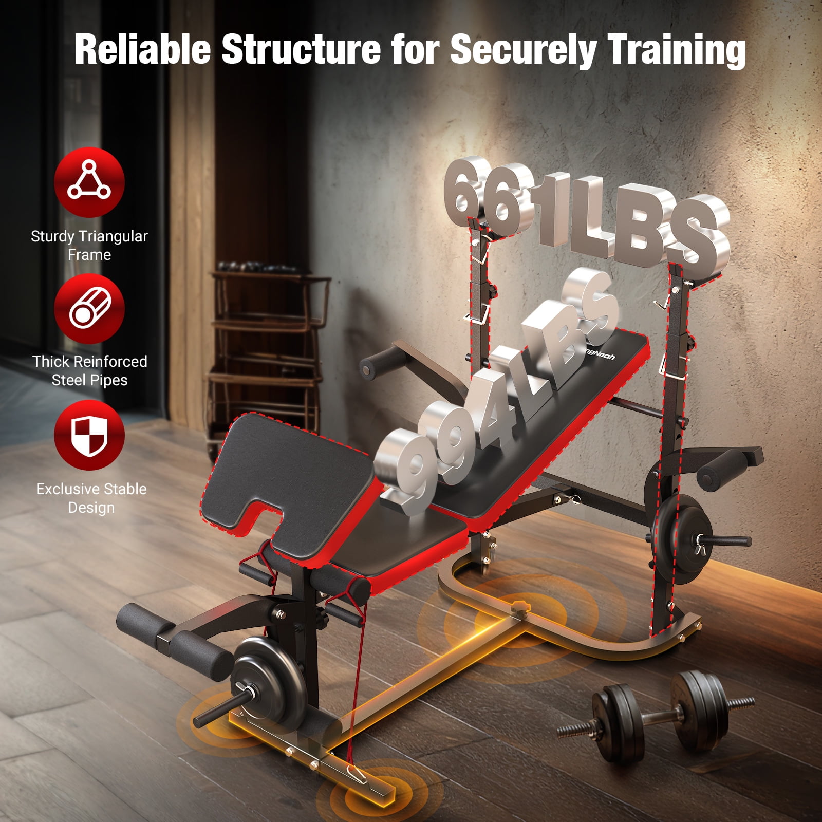 🏋【880 LBS Weight Capacity】 Built with 1.5MM heavy-duty commercial quality steel and unique triangular support structure, a wider base, 4 anti-slip silicone feet, ensure the safety of users while making the product life more enduring. At the same time , it also means that the product is more stable and will not shake easily. 💪【13 Adjustable Workout Bench】 Our adjustable workout bench designed with 7 back Adjustments & 3 seat Adjustments & 3 foot Adjustments. Adjustments for full body workout where you just pull the FAST BOLT, adjust the position that fits you with an automatic lock safely! 🏋🏻♀️【Foldable Design, Space-Saving】 Don’t need to loose a lot of screws, pull out 4 pins and lay down the pad then you can finish the folding, folded size:31.9″x12.6″x9.8″, you can put it against the wall or under the bed. Save space and easy to store. 💪【3-Min Fast Set Up】 The average time from unpacking to completion of assembly is only 3 minutes. All you need to do is to open the product and tighten a few screws according to the instructions. Convenient and easy to use at home. 🏋【2 In Soft Foam Padding】 11.8” Upgraded backrest and 12.6” seat made of pu leather and filled with soft foam padding. Allow you do any exercise with a very comfortable feeling. PU leather has three major advantages: easy maintenance textured, soft to touch and easy to clean.