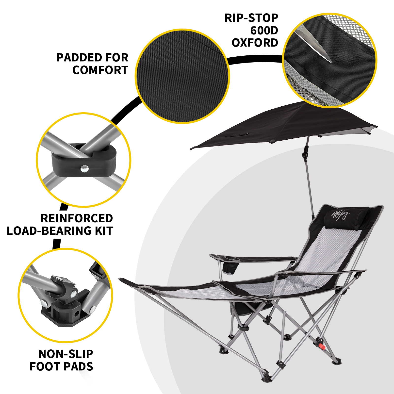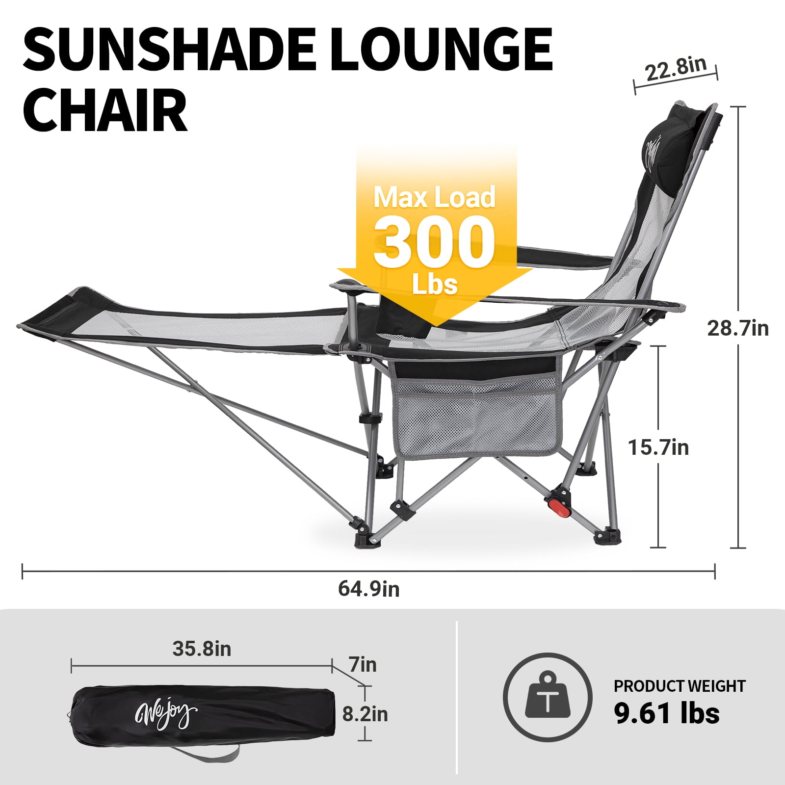 #Wejoy folding lawn chair with sunshade canopy for adult Unfold size: 64.9X22.8X15.7/28.7in Packed size: 8.2X7X35.8in Weight: 9.61lbs Maximum load: 264lbs Frame: Q195 steel pipe Mesh: 100% polyester Fabric: 100% polyester 600D Oxford fabric Sunshade canopy size: Unfold size:47.2X39.4in Packed size:35.43in Weight:1.54lbs The footrest of the camping chair for adult is retractable and can be used as a camping chair or a lounge chair. The backrest can be adjusted in three angles. Made of breathable mesh material paired with 600D Oxford fabric, the beach chair is both durable and breathable.