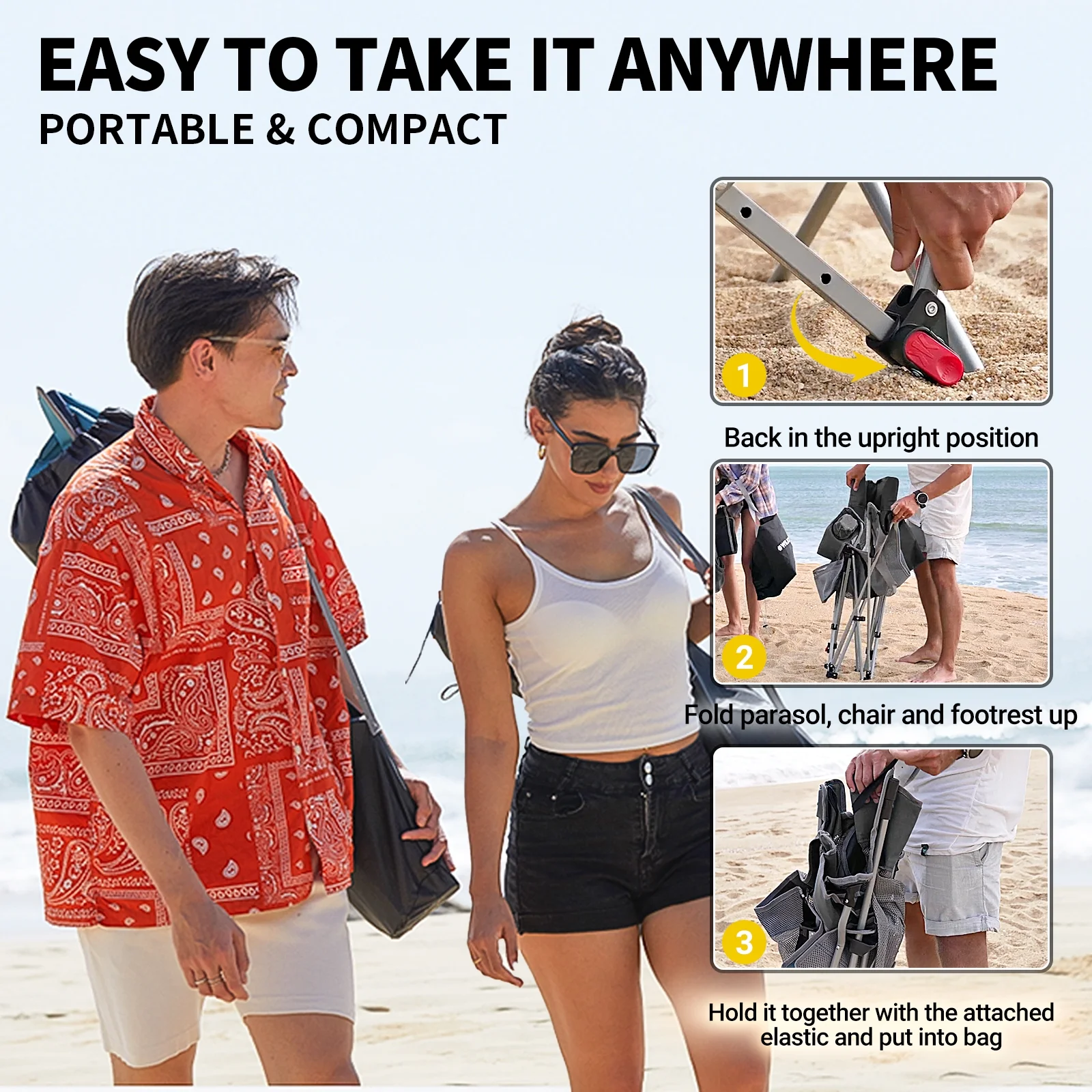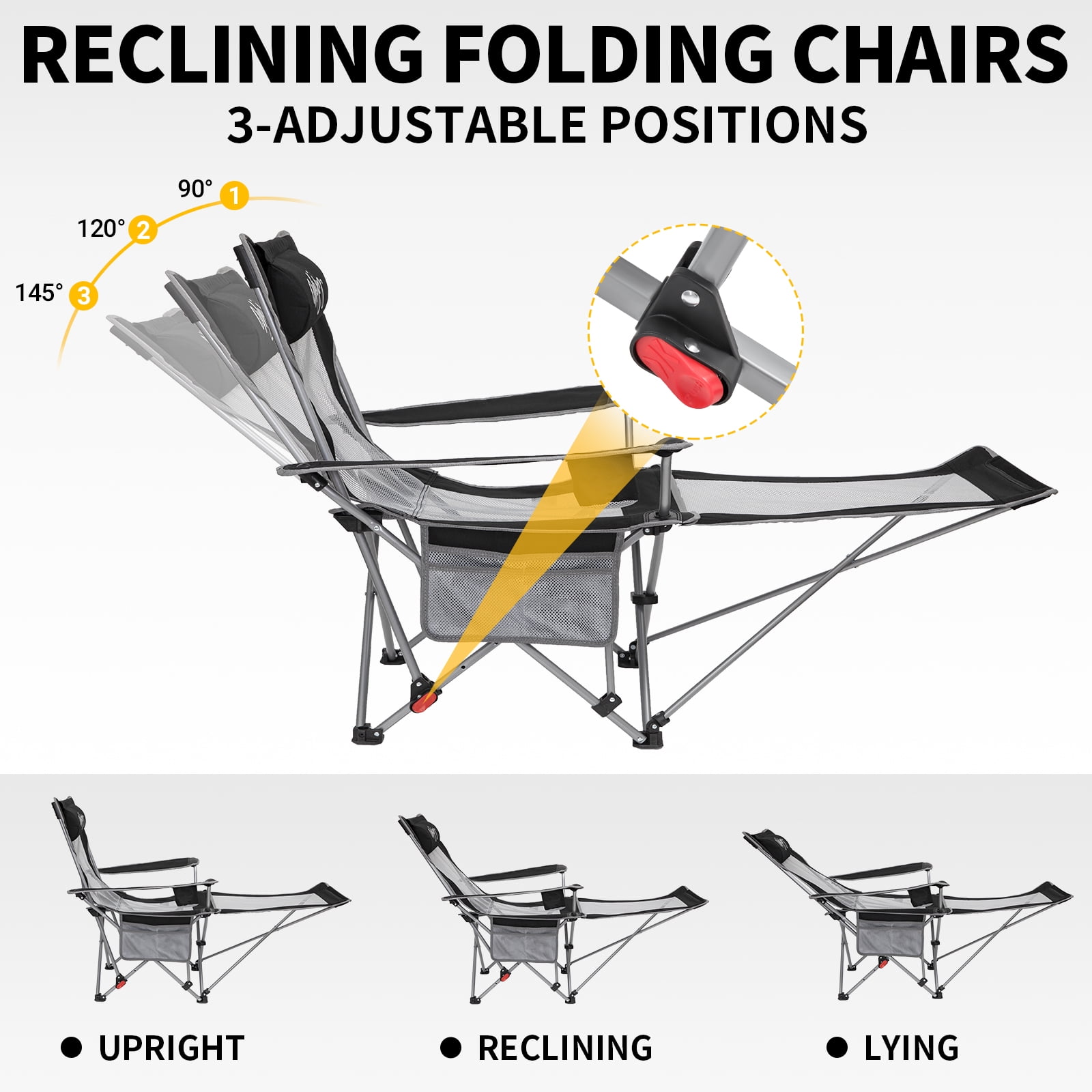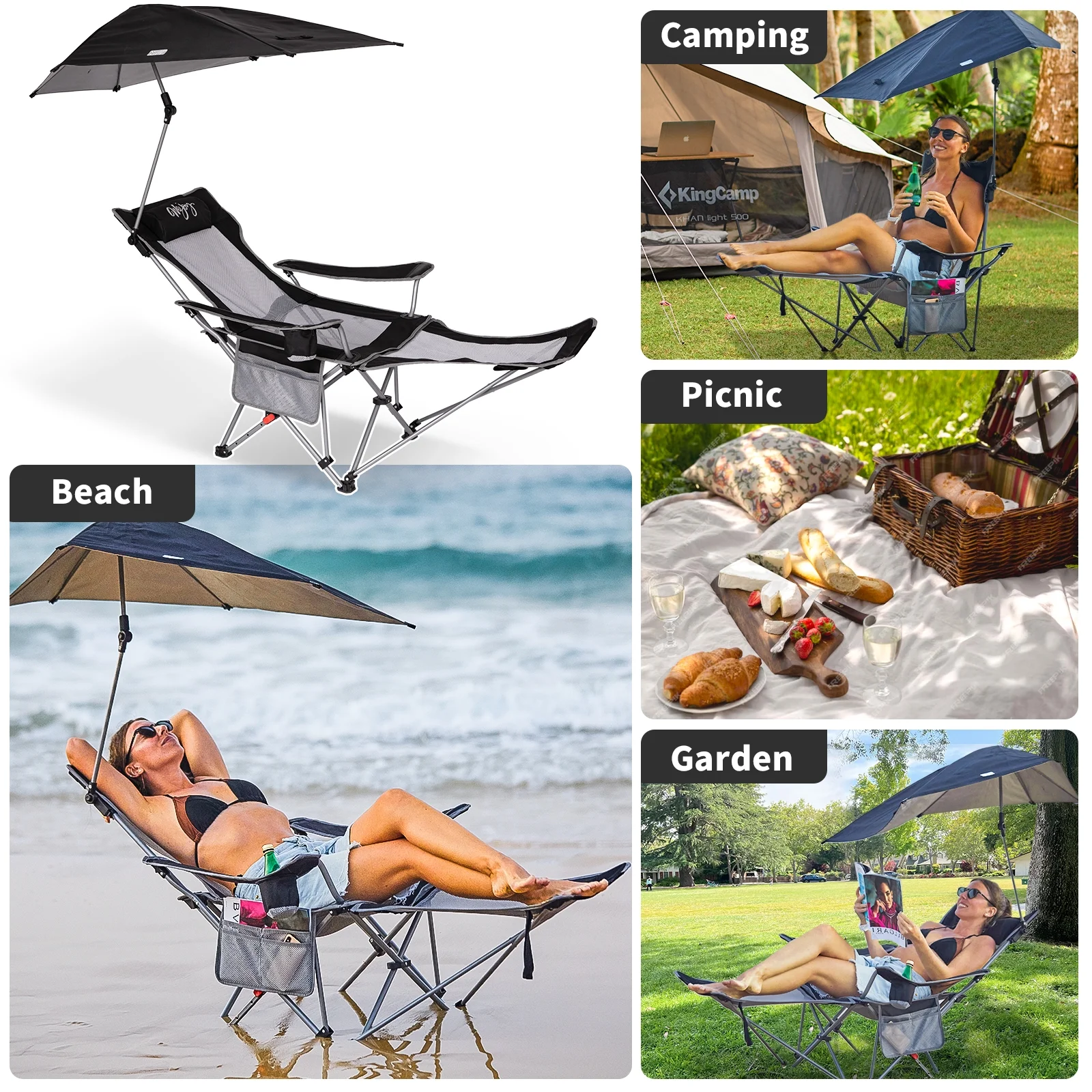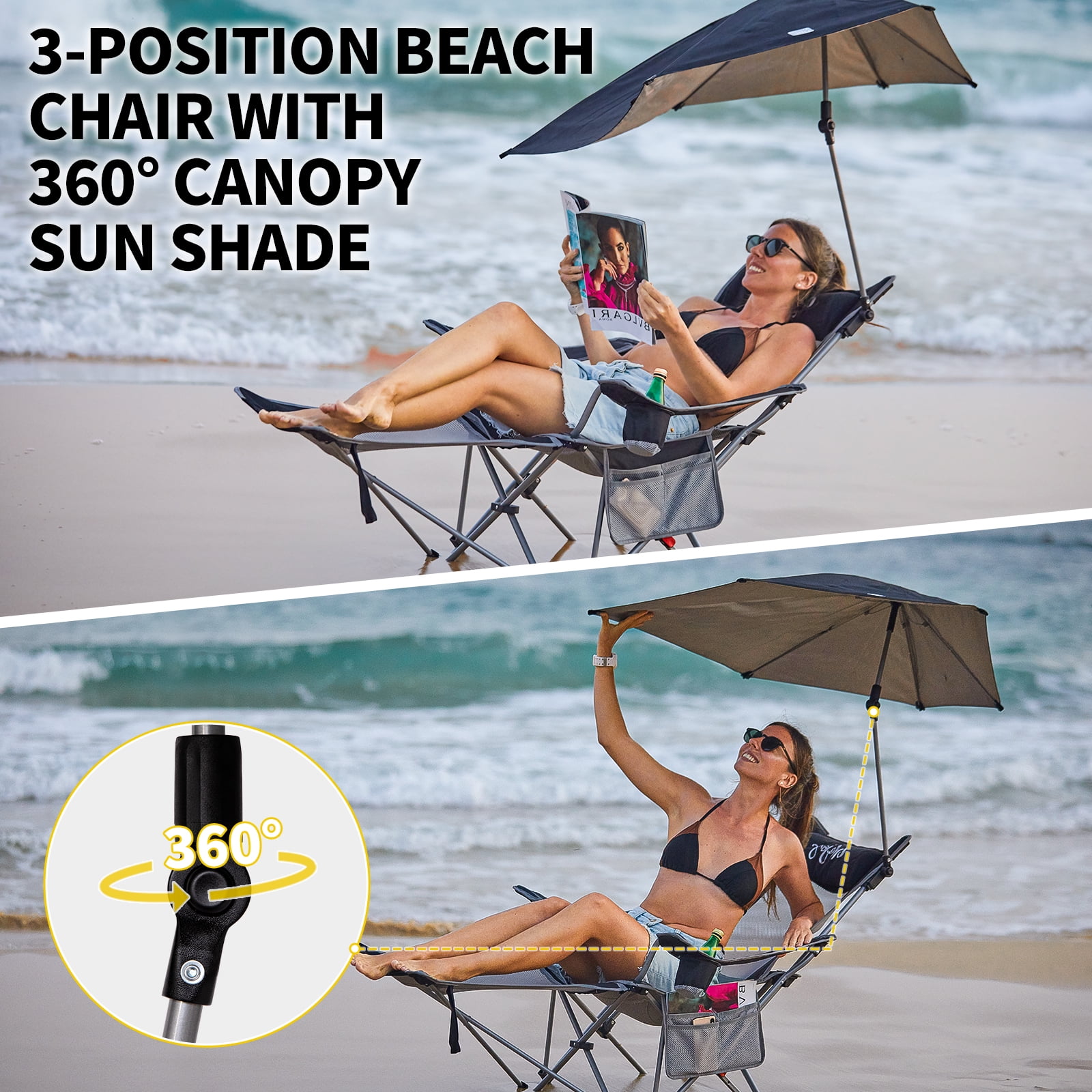 【2 in1 Camping Chair】The footrest of the camping chair for adult is retractable and can be used as a camping chair or a lounge chair. And the backrest can be adjusted in three angles. This folding chair features an adjustable 360° canopy which can protect your face and eyes from the sun 【Comfortable & Durable】Made of breathable mesh material paired with 600D Oxford fabric, the beach chair is both durable and breathable. 【Portable】The camping chair can be quickly and easily unfolded and stored, with a storage bag for easy transport. 【Unique Design】The chair comes with a pillow for a more comfortable headrest. You can choose whether you want to use it or not.With storage pockets and drink holders, it is convenient to store small items such as mobile phones and cups 【Customer Guarantee】This chair comes with 12-monthes warranty, and a 100% satisfaction guarantee. If you have any questions, please contact us directly.