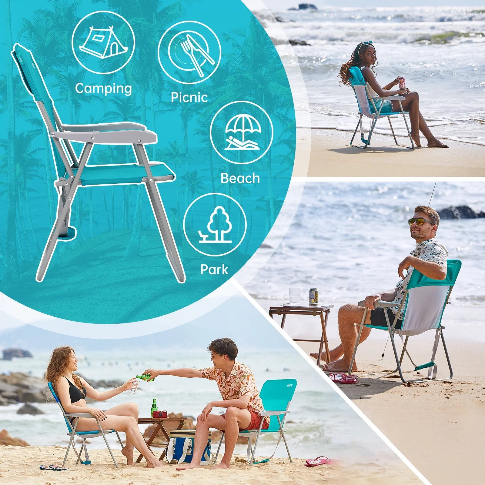 WEJOY Beach Chair Lawn Chair Product details: Color:Red/Blue;Blue;Cyan;Red/Blue/Green Unfold size: 23.4×18.1/21.8×15.7/33.8in Packed size: 30.9×21.8×2.1in Weight: 7lbs Maximum load: 300lbs Frame: Q195 steel pipe Fabric: 100% polyester 600D Oxford fabric This folding beach chair adopts the design of leaning back, which can support the shoulder and back effectively , reduce muscle pressure. The beach chairs high off ground design relax the legs and increase comfort.