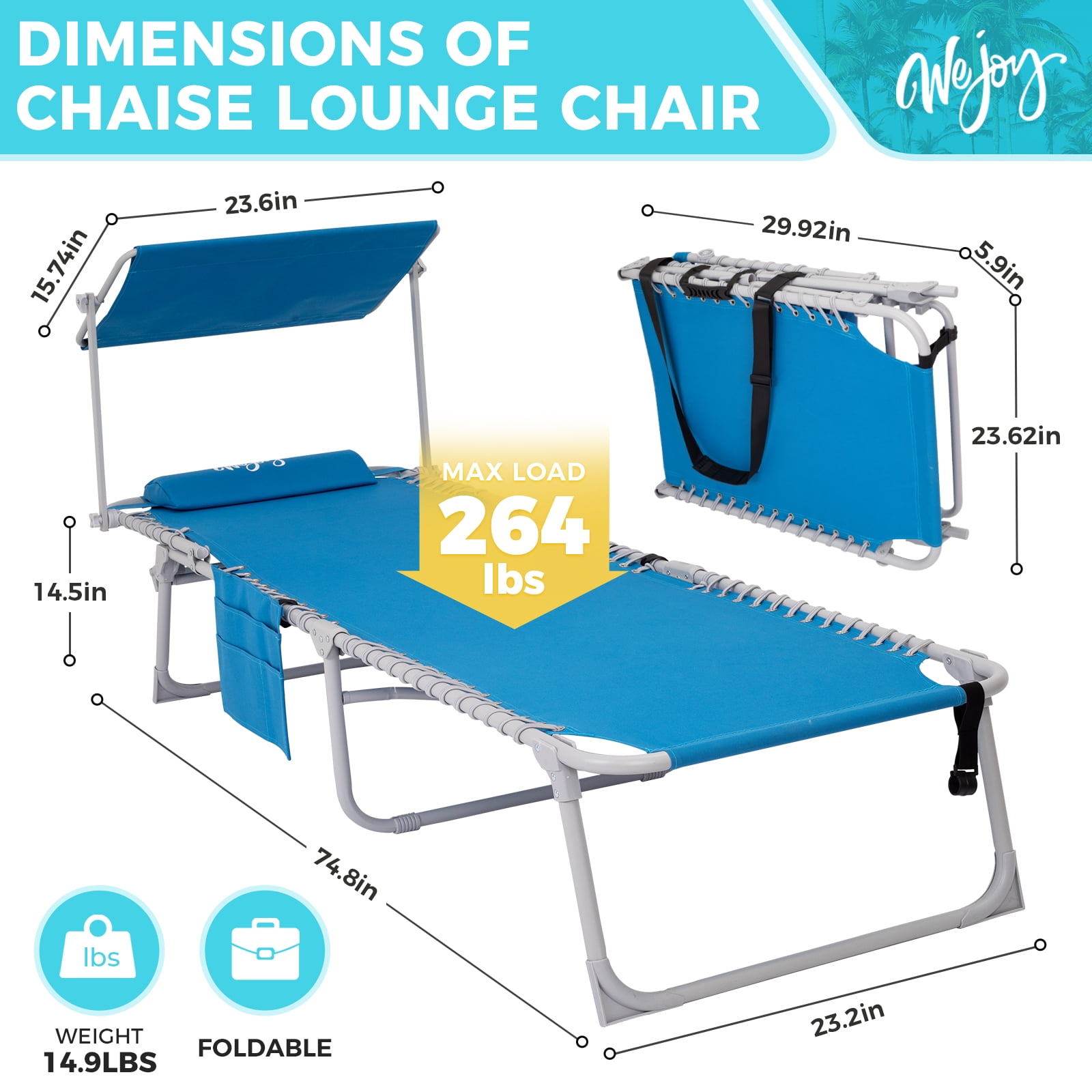【5-Position Adjustable Chaise Lounge】The back of this beach lounge chair can be adjusted to 5 fixed positions. The chaise lounge chair leg supports can be placed in two different ways. Whether you are sunbathing, sleeping, eating and drinking, or just chatting with friends, this sun lounge chair can meet your leisure needs easily. 【Comfortable Sunshade & Face Down Tanning Chair】The 360°canopy sunshade provides shade over your head, protecting your eyes and allowing you to read while enjoying sunbathing. This WEJOY foldable chaise recliner for adults is equipped with a removable pillow. 【Portable & Foldable】No tools are required, the patio lounge chair is ready to use with just one step: open and lock the backrest at the angle you like. The unfolded size of this lawn chair is 74.8×23.2×13.3/14.5 inches, and the packed size is 29.92×5.9×23.62 inches. This 14.9 lbs lightweight outdoor lawn chair is effortless to take outside. 【Durable & Stable】The cloth is made of wear-resistant and durable Textilene fabric, which can bear weight up to 264 lbs. The durable, rust-resistant lightweight Q195 Steel pipe frame ensures durability over a long period. The 3-in-1 pocket is more convenient for you. 【Customer Guarantee】This lounge chair comes with a 12-month warranty and a 100% satisfaction guarantee. If you have any questions, please contact us directly.