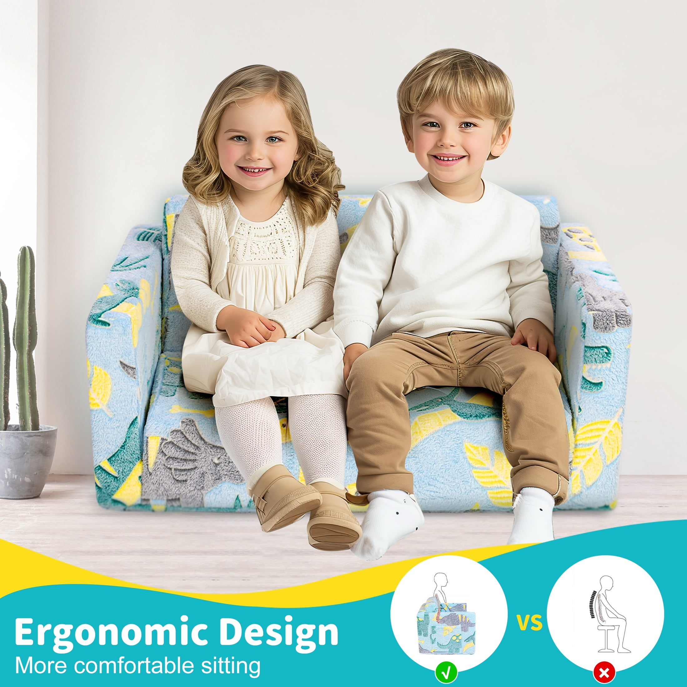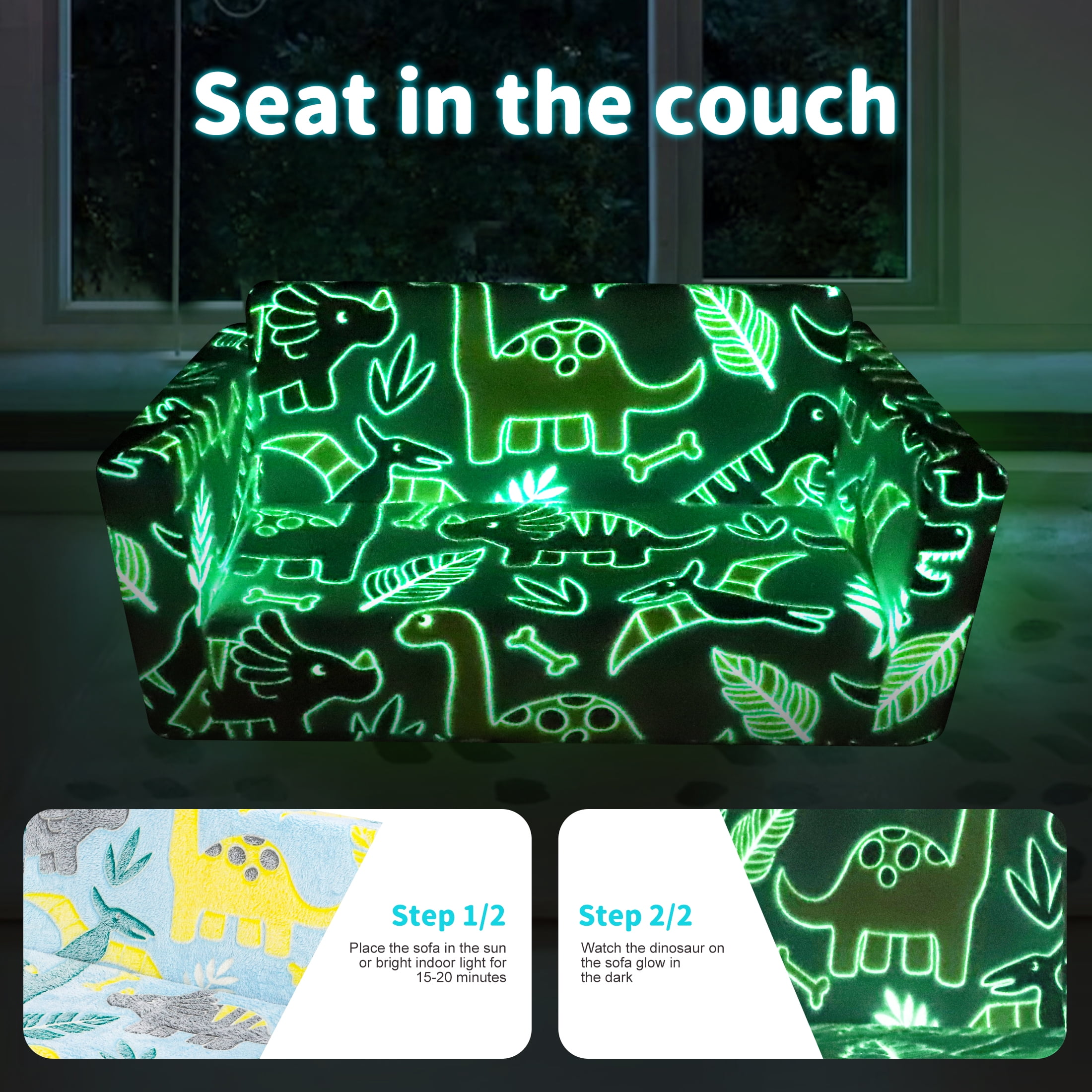 This 2-in-1 foldable kids sofa is designed for children. It can be used as a kids couch and can be converts to a kids recliner after being spread out. It is suitable for children to play and take a nap. It is filled with 25D high sponge and can support the weight of 2 children, making it less likely to deform. The dinosaur fluorescent design makes the toddler chair glow at night, bringing a different entertainment experience and visual feast to your children.