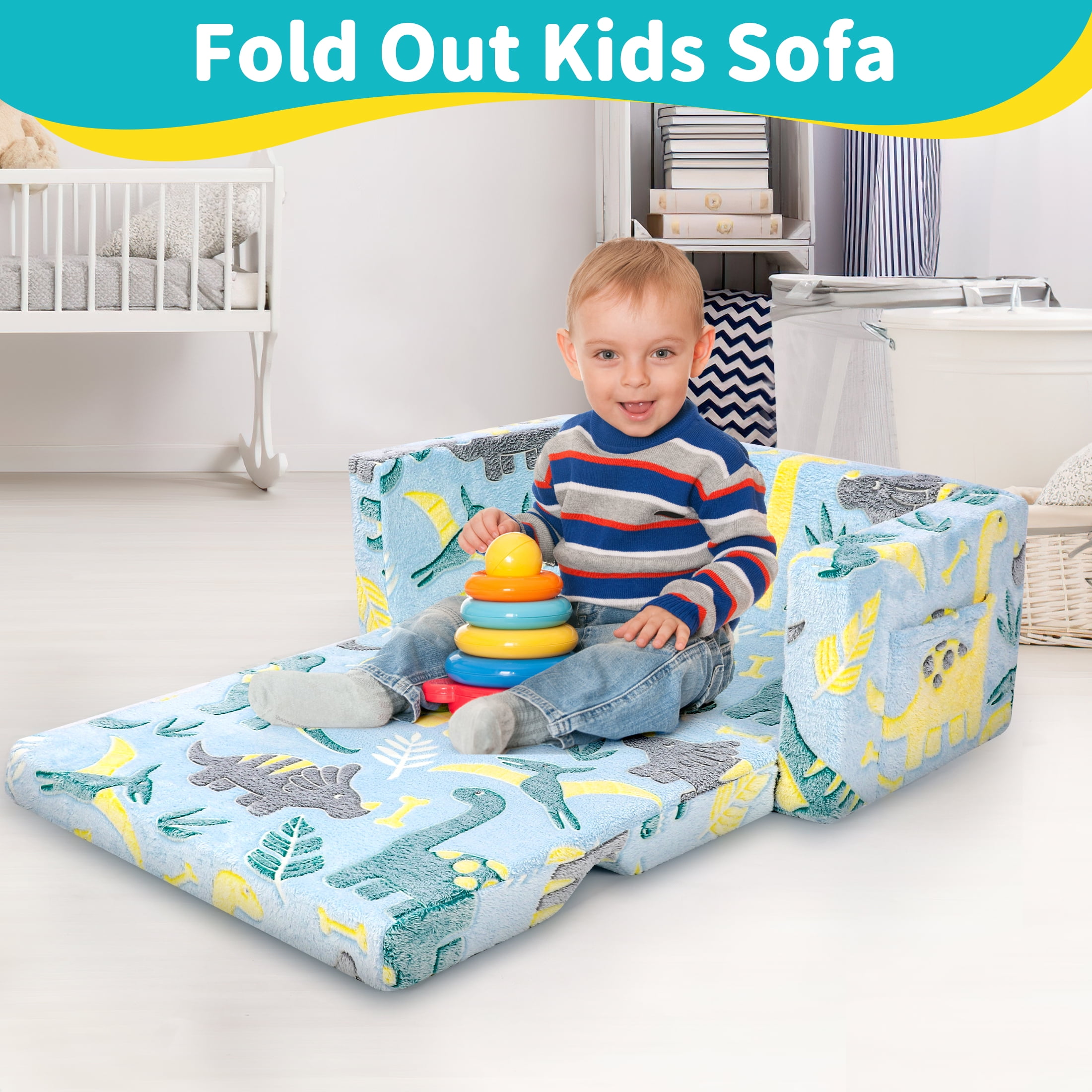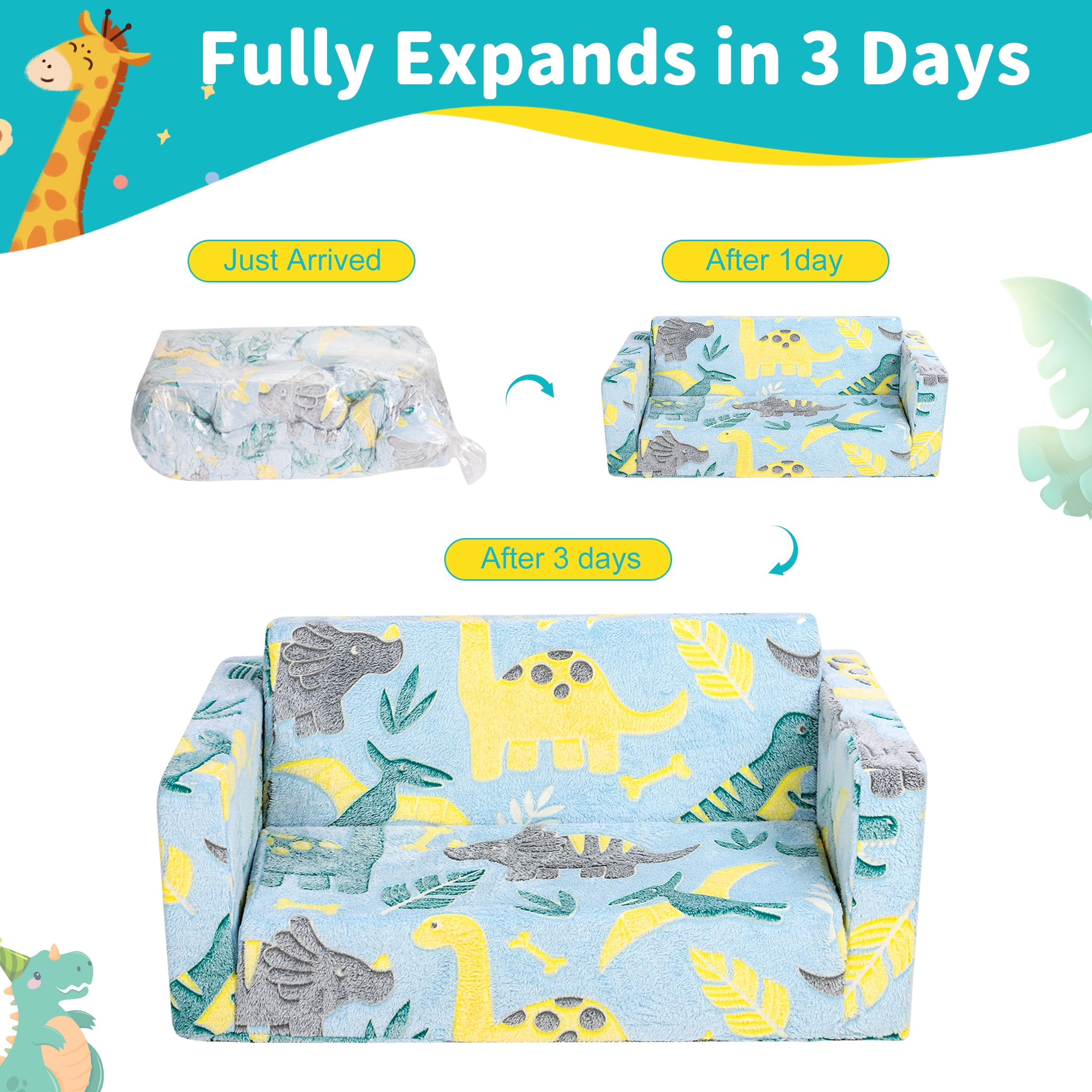 【2-in-1 Kids Couch Design】This kids sofa have a convertible design. Pull out the folding chair and it can be easily turned into a toddler recliner sofa.The baby sofa size is 30″x16″x12″,the kids couch Flipped Open is size at: 40″x31″ x12″,Comfortably fits 2 small children. Suitable for boys and girls to play toys and take naps indoors. 【Glow in the Dark Feature】The unique and bright fluorescent dinosaur pattern can attract children’s attention and stimulate their imagination and creativity. To witness the magic shine, simply set the toddler chair in bright light or sunlight for 10 to 15 minutes. The strength of a light’s glow in the dark increases with its brightness. This foldout kids couch is the ideal present for a birthday, Christmas, or baby shower. 【Child Friendly Design】This toddler chair filled with high-quality 25D soft foam padding to support 1-2 children and enjoy their time on toddler chair.The kids pull-out kids recliner is designed with safety in mind, with no sharp corners and hard edges. 【Ready for Fun Right Away】Our kids chair sofa is vacuum sealed and requires no assembly, when you receive the product, open the bag and allow 3-5 days for the kids sofa to return to its original shape.You’ll be amazed to witness a kids couch that’s five times larger than the initial packaging. 【Service &Care Instructions】The folding toddler chair can be removed and cleaned in the machine. It can also resist fading, shrinking and falling off. After washing, make sure that kids chairs are always in a good state. any questions about the product, please feel free to contact the customer support team. ✅How to Glow at Night: simply set the toddler sofa in bright light or sunlight for 10 to 15 minutes. The strength of a light’s glow in the dark increases with its brightness. ✅Kids Sofa Specifications: Net Weight: 2.8 kg/6.17 lbs Weight Limit:18KG/39.6lbs Seating Capacity:1-2 Child Style:glowing dinosaur Toddler Chair Size: 30″x16″x12″ Kids Couch (fully extended) Size: 40″x31″ x12″ Materials:25D sponge,luminous fabric Special Feature:foldable kids couch,convertible sofa to toddler recliner Recommended Uses For Product:reading,sleeping Product Care Instructions:cold water,gentle cycle,no bleach,no Ironing,regular detergent,tumble dry low heat or air dry ✅Products You May Also Like : click here ✈ for 13pcs modular toddler sofa only $118.98