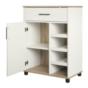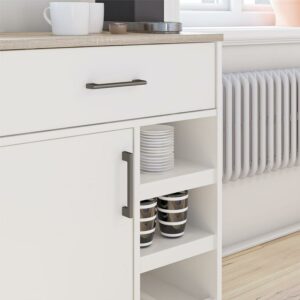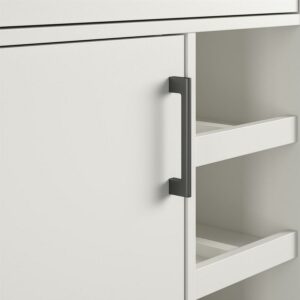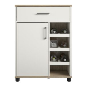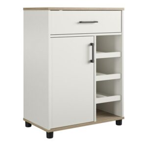 Finally, a multifunctional piece that blends clean lines with rustic flair. The Whitmore Bar Cabinet by Systembuild Evolution showcases a smooth white on oak finish paired with matte black modern farmhouse hardware. This unique bar cabinet boasts of 3 interchangeable beverage shelves with middle dividers that allow you to safely and stylishly store up to six bottles of spirits, wine, or mixers for easy access. Flip the shelves over for a flat surface to put on display glassware, bottles of bitters or shakers. The cabinet with adjustable shelf is perfect for all sizes of bar accessories, from small to tall. House remaining go-to bar gadgets and utensils in the spacious drawer provided. Who says you can’t have it all Assembled unit measures 26.69″W x 15.55″D x 35.8″H Drawer measures 26.69″W x 15.55″D x 6.7″H. Assembled weight 69 lbs.