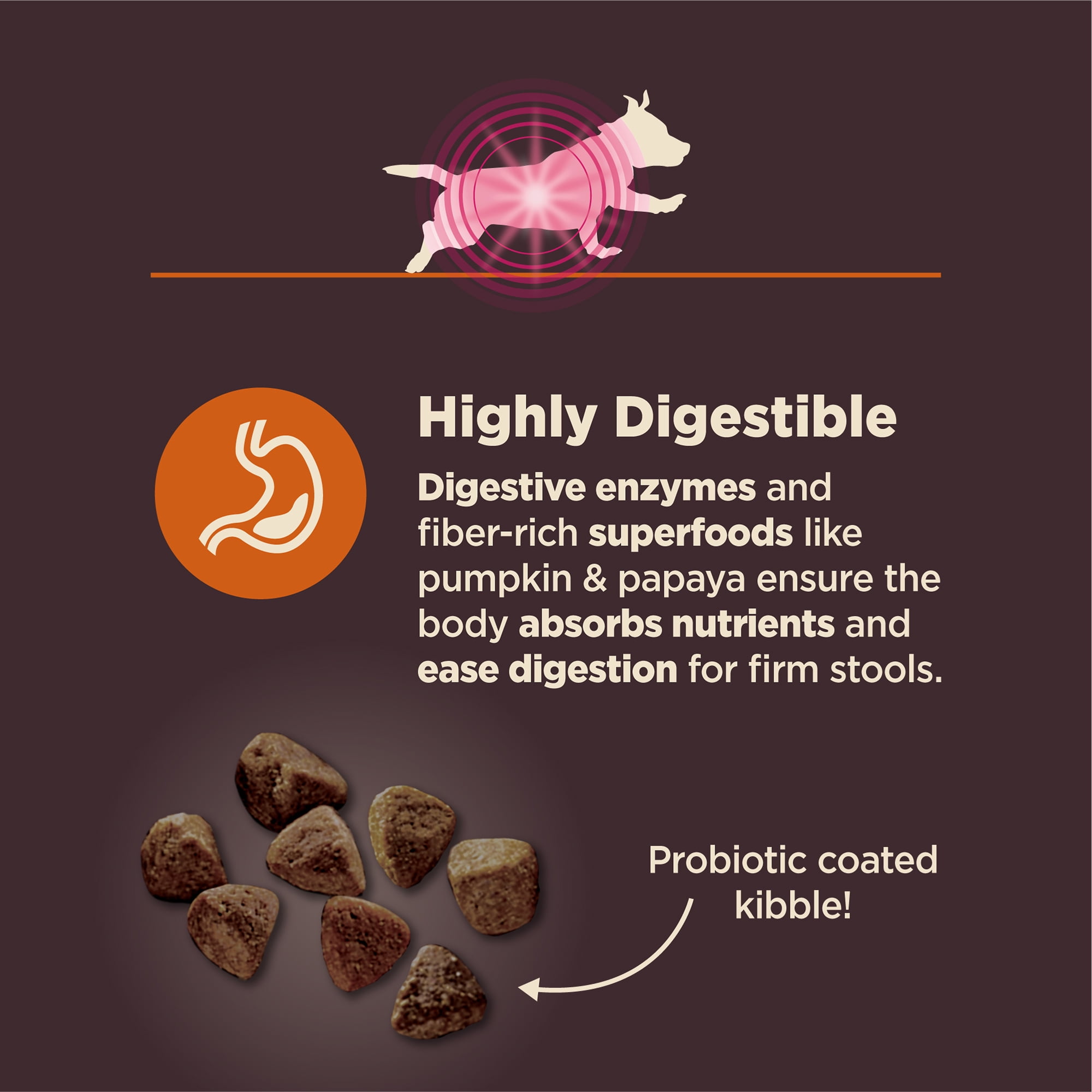 DIGESTIVE HEALTH SMALL BREED ADULT DRY DOG FOOD: This highly digestible, probiotic-coated dog kibble is made with digestive enzymes, a blend of prebiotic fibers, and guaranteed levels of probiotics to support gut health for overall wellbeing and vitality. OPTIMAL DIGESTION AND NUTRIENT ABSORPTION: High quality protein from chicken and whole grains from brown rice help optimize nutrient absorption and support high digestibility. SUPPORTS IMMUNE HEALTH AND A HEALTHY MICROBIOME: 70% of your pet’s immune system is location within their digestive system so having a healthy microbiome is essential to ensure their immune system functions at its best. SUPPORTS HEALTHY SKIN AND COAT: Keeping the microbiome in a healthy balance helps protect against excessive inflammation or itchy skin. The inclusion of protein and omega fatty acids in the kibble ensure your dog’s coat stays lustrous and soft. NO CORN, WHEAT, OR SOY: Contains only premium, all natural ingredients with no poultry by-products, wheat, wheat gluten, corn, soy, artificial colors, or preservatives. Available Product Sizes: 4 Pound Bag, 12 Pound Bag