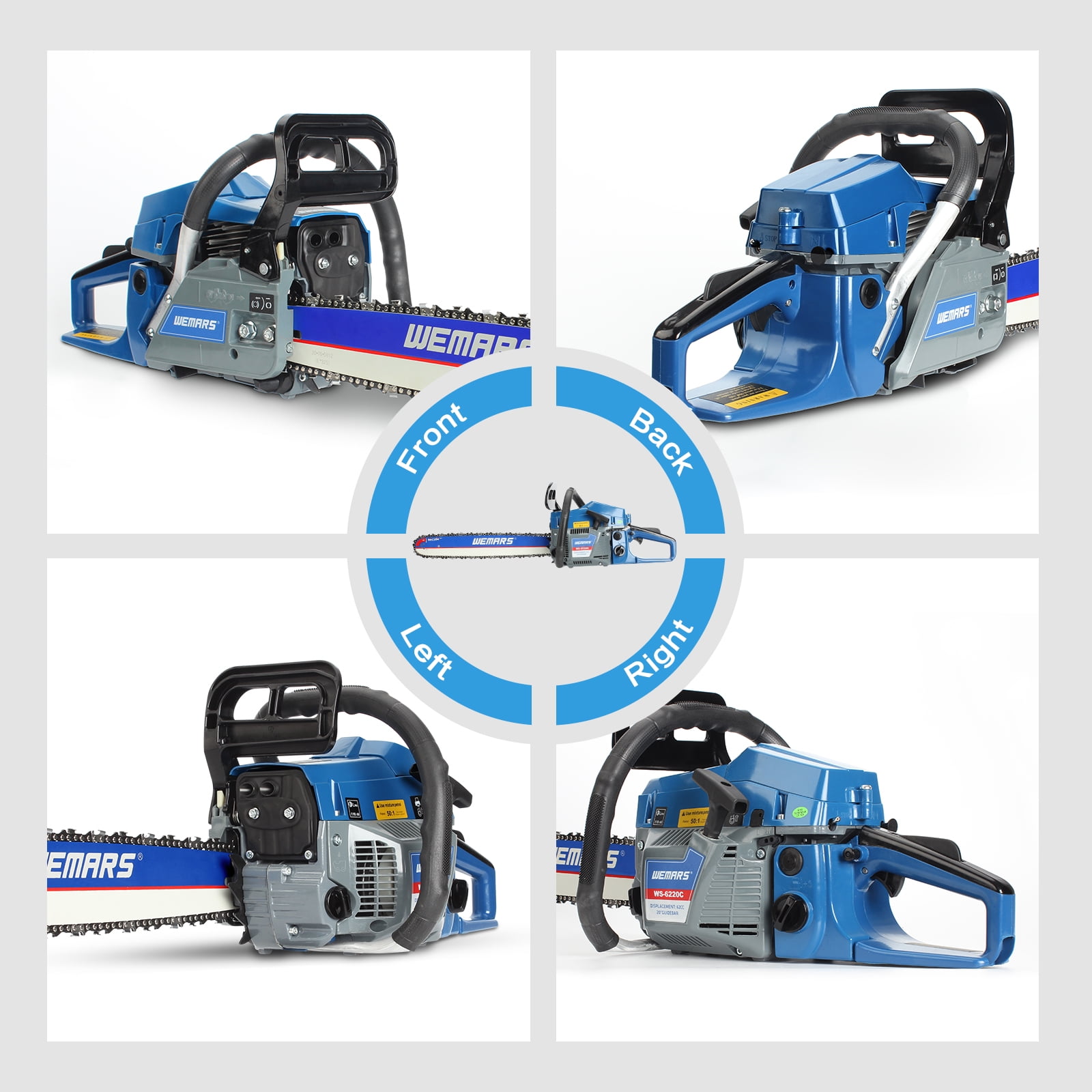 WEMARS power chain saws quickly cut a cord of wood, or used to trim medium to large-size branches with the simple push of a button. 62cc 20-inch Bar Gas chainsaw Engine 2 Cycle Chain Saw is the ideal tool for farm, garden and home use. The built-in safety switch prevents accidental activation Note: Please read this handbook carefully before using the tool Intended use Specifiction: Displacement: 62cc Output power: 2.5kw 3.4hp 8500rpm Bar Length: 20″ Saw Chain Pitch: 0.325(inch) Saw Chain Gauge: 0.325(inch) Fuel: Mixture(Gasoline25:Two-cycle oil 1) Fuel Mix: 25:1 (25 parts fuel to 1 part two stroke oil) Tips How to use the chainsaw: 1.Pull the Throttle Control Drawbars to Close the Throttle 2.Push the Fflameout Switch to the Starting Position (I) 3.Pull the starting handlebar outward several times until there’s ignition sounds. Reset the throttle control drawbars and open the choke and start the handle repeatedly until the engine starts 4.Press the Trigger and Release the Engine to Idle 5.Place the Flameout Switch at (o) to Turn Off the Engine Note: After the first ignition sound, closing the choke and repeatedly pulling on the start handle will suck in too much fuel and prevent the engine from starting How to Install Chain: 1. Open the side cover 2. Check the saw blades, which are fixed with a cover on the clutch 3. Installation saw chain, Pay attention to the direction of the knife 4. A brake shoe moves to the side. Carefully watch the grooves that create the tension of the chain part 5. Close the side cover and adjust the tightness of the chain saw, which is about 0.4-0.6 inch 6. Locking side cover Included Components: 1 X 20″ 325”76DL Guide bar 1 X 20″325” Saw chain 1 X Tool kit 1 X 2L Fuel Mixing bottle 1 X Instruction Manual 1 X Chain saw installation step 1 X Guide for start-up of chain saw