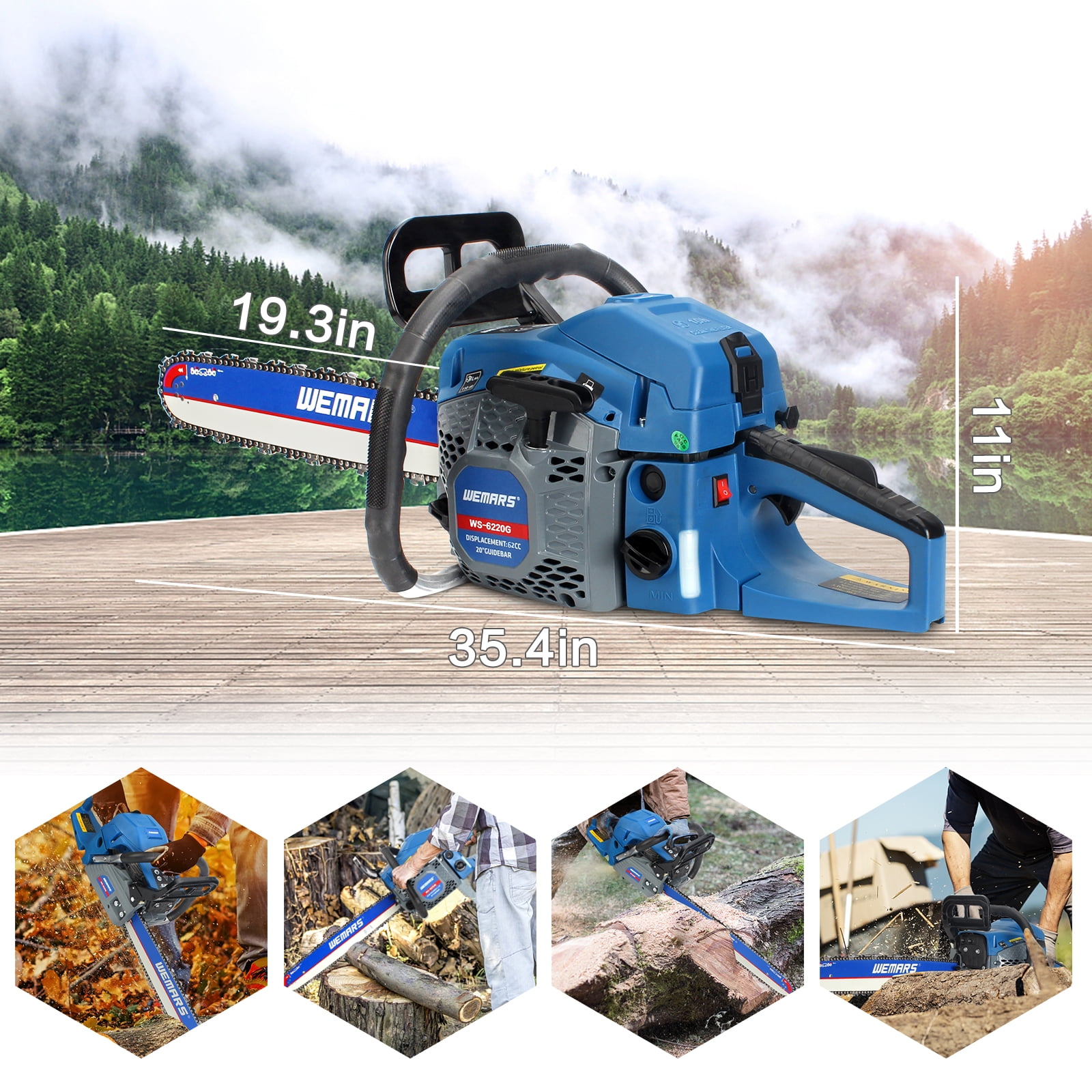 WEMARS power chain saws quickly cut a cord of wood, or used to trim medium to large-size branches with the simple push of a button. 62cc 20-inch Bar Gas chainsaw Engine 2 Cycle Chain Saw is the ideal tool for farm, garden and home use. The built-in safety switch prevents accidental activation Note: Please read this handbook carefully before using the tool Intended use Specifiction: Displacement: 62cc Output power: 2.5kw 3.4hp 8500rpm Bar Length: 20″ Saw Chain Pitch: 0.325(inch) Saw Chain Gauge: 0.325(inch) Fuel: Mixture(Gasoline25:Two-cycle oil 1) Fuel Mix: 25:1 (25 parts fuel to 1 part two stroke oil) Tips How to use the chainsaw: 1.Pull the Throttle Control Drawbars to Close the Throttle 2.Push the Fflameout Switch to the Starting Position (I) 3.Pull the starting handlebar outward several times until there’s ignition sounds. Reset the throttle control drawbars and open the choke and start the handle repeatedly until the engine starts 4.Press the Trigger and Release the Engine to Idle 5.Place the Flameout Switch at (o) to Turn Off the Engine Note: After the first ignition sound, closing the choke and repeatedly pulling on the start handle will suck in too much fuel and prevent the engine from starting How to Install Chain: 1. Open the side cover 2. Check the saw blades, which are fixed with a cover on the clutch 3. Installation saw chain, Pay attention to the direction of the knife 4. A brake shoe moves to the side. Carefully watch the grooves that create the tension of the chain part 5. Close the side cover and adjust the tightness of the chain saw, which is about 0.4-0.6 inch 6. Locking side cover Included Components: 1 X 20″ 325”76DL Guide bar 1 X 20″325” Saw chain 1 X Tool kit 1 X 2L Fuel Mixing bottle 1 X Instruction Manual 1 X Chain saw installation step 1 X Guide for start-up of chain saw