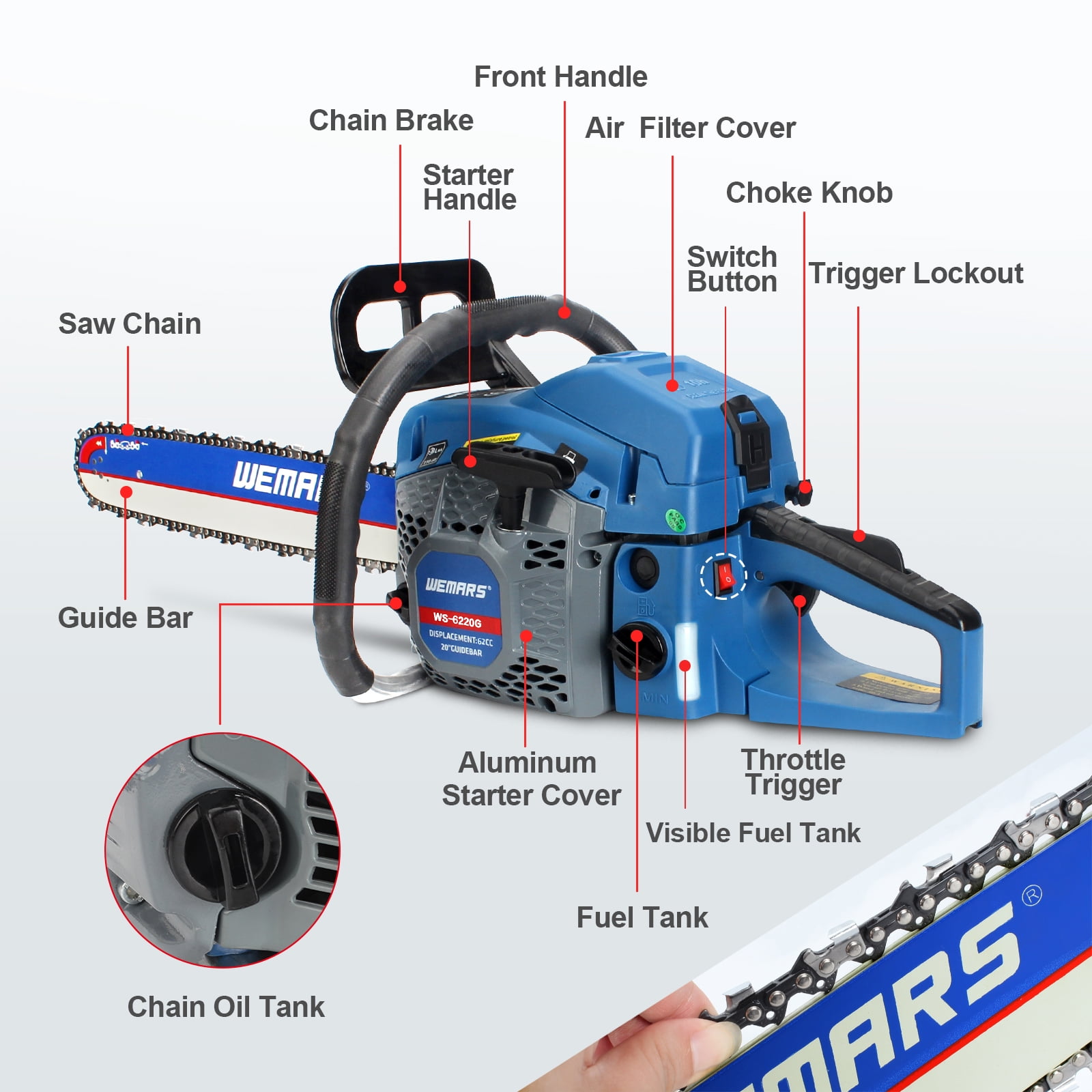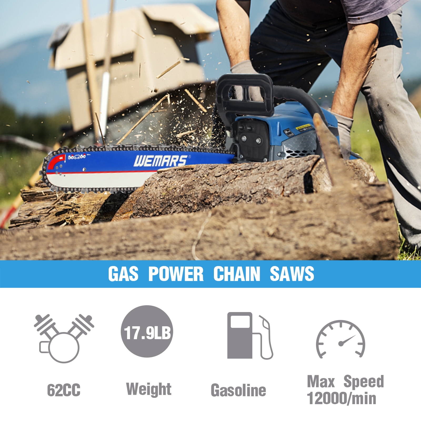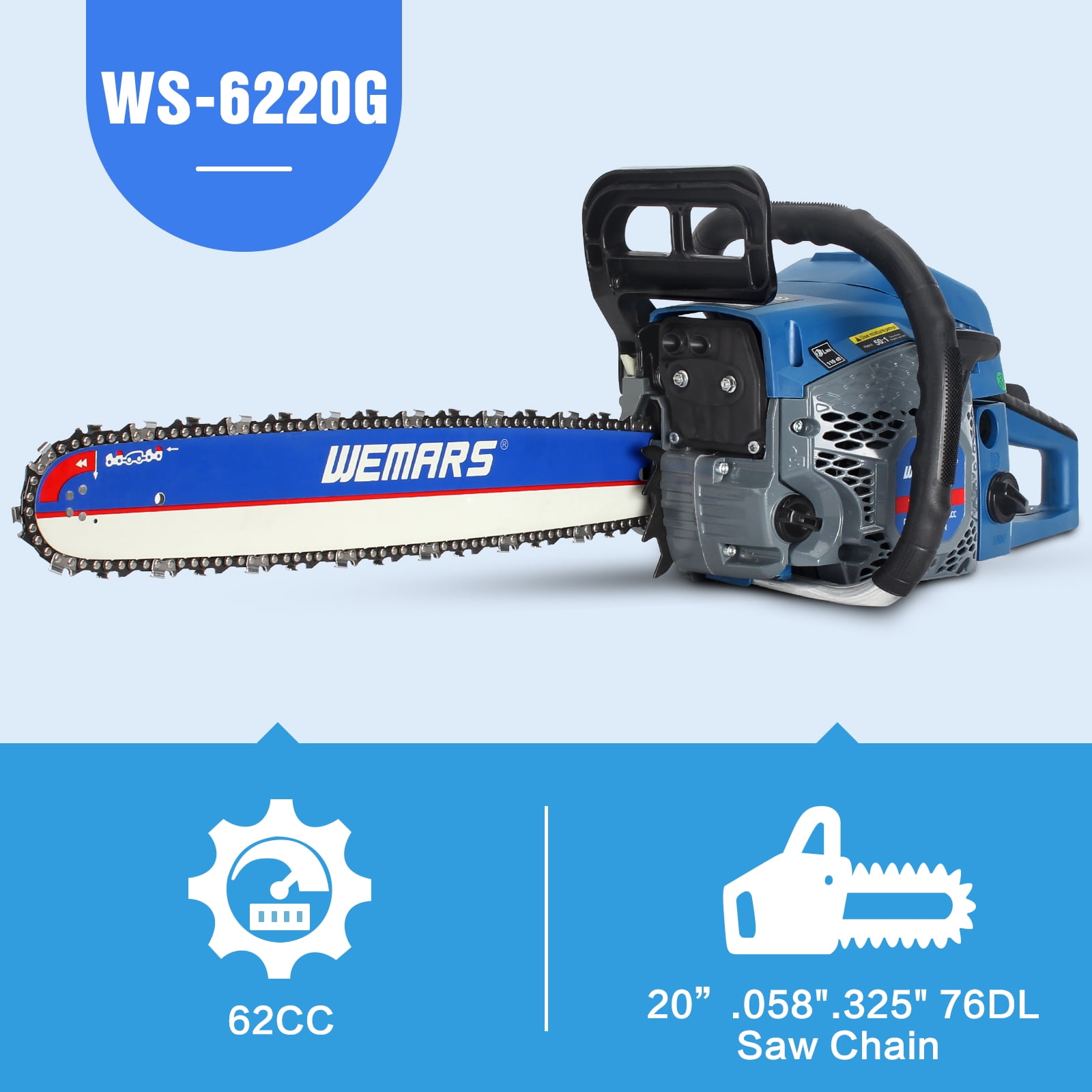 WEMARS 20″ 62cc 2-Cycle Gas Powered Handheld Chainsaw