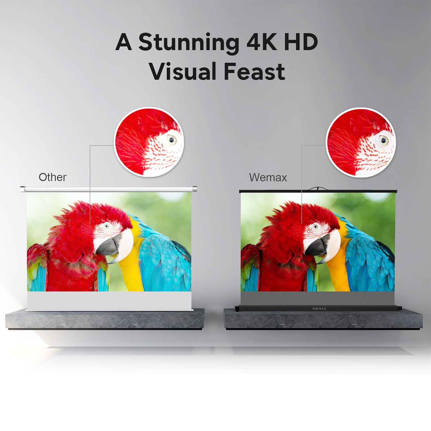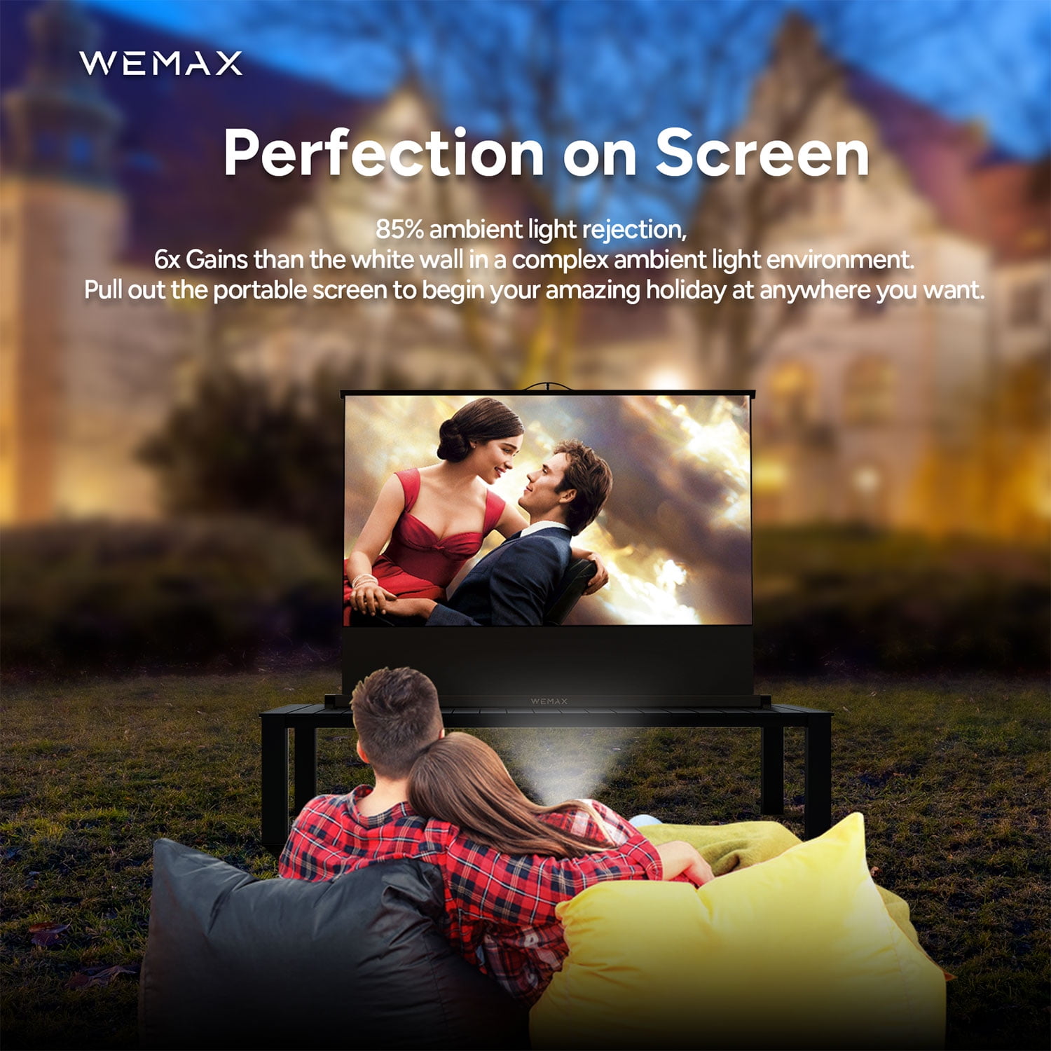 WEMAX P50 PRO 50 inch ALR Portable Projector Screen See clear, vibrant picture on the WEMAX 50″ ALR Pull Up Projection Screen. Simply place the case on the floor and pull the screen up and begin your thrilling movie time. The screen provides a 6 gains lumens in ambient light and has 85% ambient occlusion, you will have a bright and vibrant image regardless of the environment light. Enhance the stunning visual effect of your projector to perfection with the 16:9, 4K ready ALR projector screen from WEMAX. Open up Your Home Theater in Seconds The Thinnest Screen That Can Be Transported Anywhere 85% Ambient Light Rejecting A Stunning 4K HD Visual Feast ALFA Technology Projection Screen Nanostructures for Enhanced Light Absorption WEMAX 50 inch ALR Portable Projector Screen, Small Mobile Tabletop Ambient Light Rejecting Screen, 16:9 HD Pull Up Retractable Projection Screen for Travel Camping Indoor Outdoor Movie Use Perfection on Screen 85% Ambinent Light Rejection, 6 Gains Projection in Ambinent Light Plasmat Light Refelection, Pull out the Portale screen to begin your amazing holiday at anywhere you want