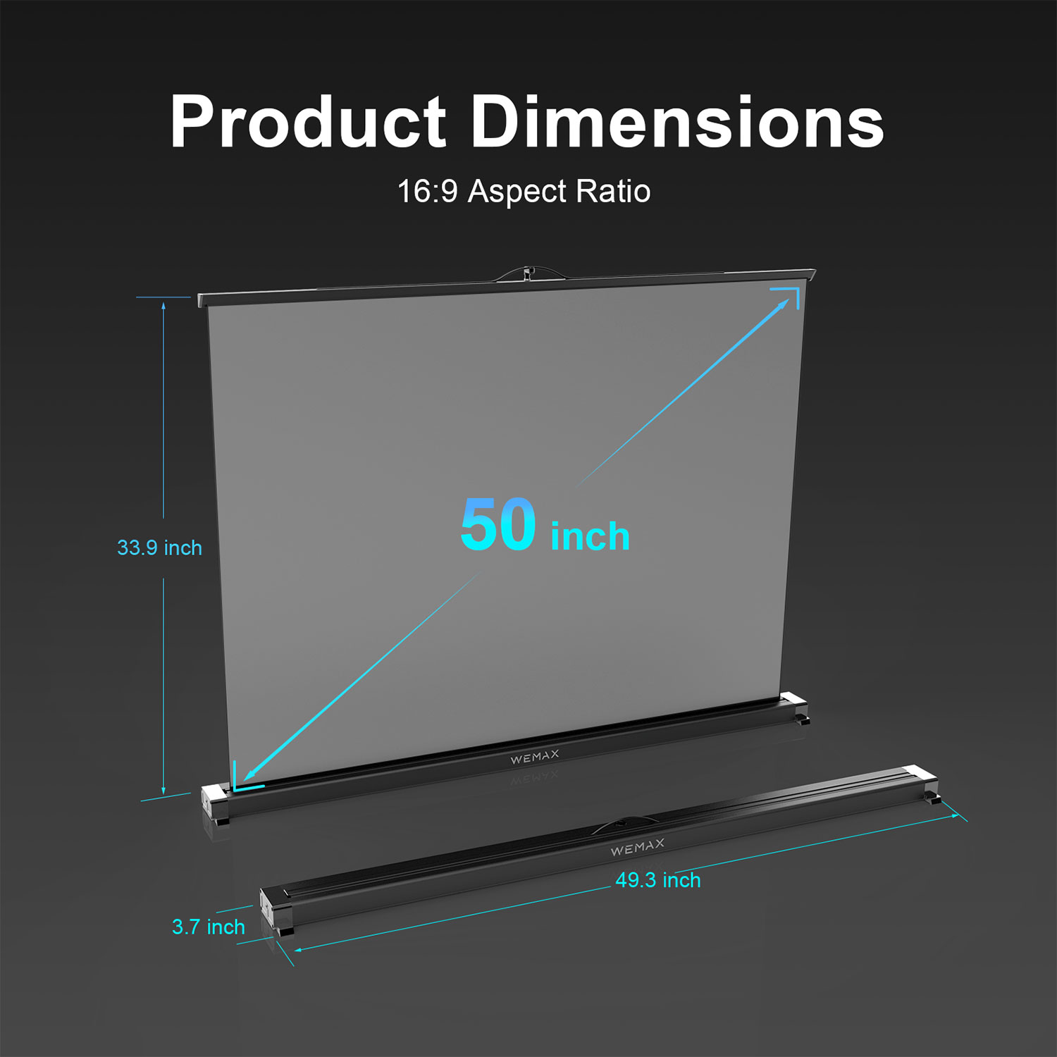 【Portable & Mobile Projection】Ultra light and compact free-standing projection screen, which is designed for portable tabletop projection. The perfect Projector Pal for traveling, camping, business presentations, school meetings, and on the go. 【Fabulous Viewing Experience】 ALR screen provides 6 gains lumens in ambient light, which enables your viewing experience to level up 6 times with the same projector. 100 ANSI Lumens level up to 600 ANSI Lumens by using the ALR portable projector. 【85% Rejecting Ambient Light】ALR portable projector screen absorbs 95% ambient light and effectively rejects 85% ambient light, which enables your projector to cast in daytime freely without a dark curtain at all. 【4K Display Support】ALR portable projector screen applies advanced PET material which gets rid of the rough texture, perfect cast 4K projection, and 3D projection without details loss compared to the white wall or white fabric texture. 【Latest Advanced Material】Applying the latest ALFA advanced technology with a 7-layer optics precision structure, which draws experience from Semiconductor technology, provides a vivid, faithful, and uniform brightness image projection. Description: Screen Material: Advanced ALR PET Screen Frame Material: Aluminum Diagonal: 50″” / 125 cm x 86 cm Aspect Ratio: 16:9 Screen Resolution: 4K HD 3D Viewing Angle: 55 Degrees Gain: 6 Gains in ambient light environment Ambient Light Rejection: 80% Screen Area: 24.5″” x 43.5″” / 62.3L x 110.7H cm Shipping Dimensions: 42″” x 5.3″” x 3.9″” / 107L x 13.5W x 10H cm Product Weight: 4.65 lbs/2.11 kg What’s in the Box: WEMAX P50 Pro Projection Screen * 1