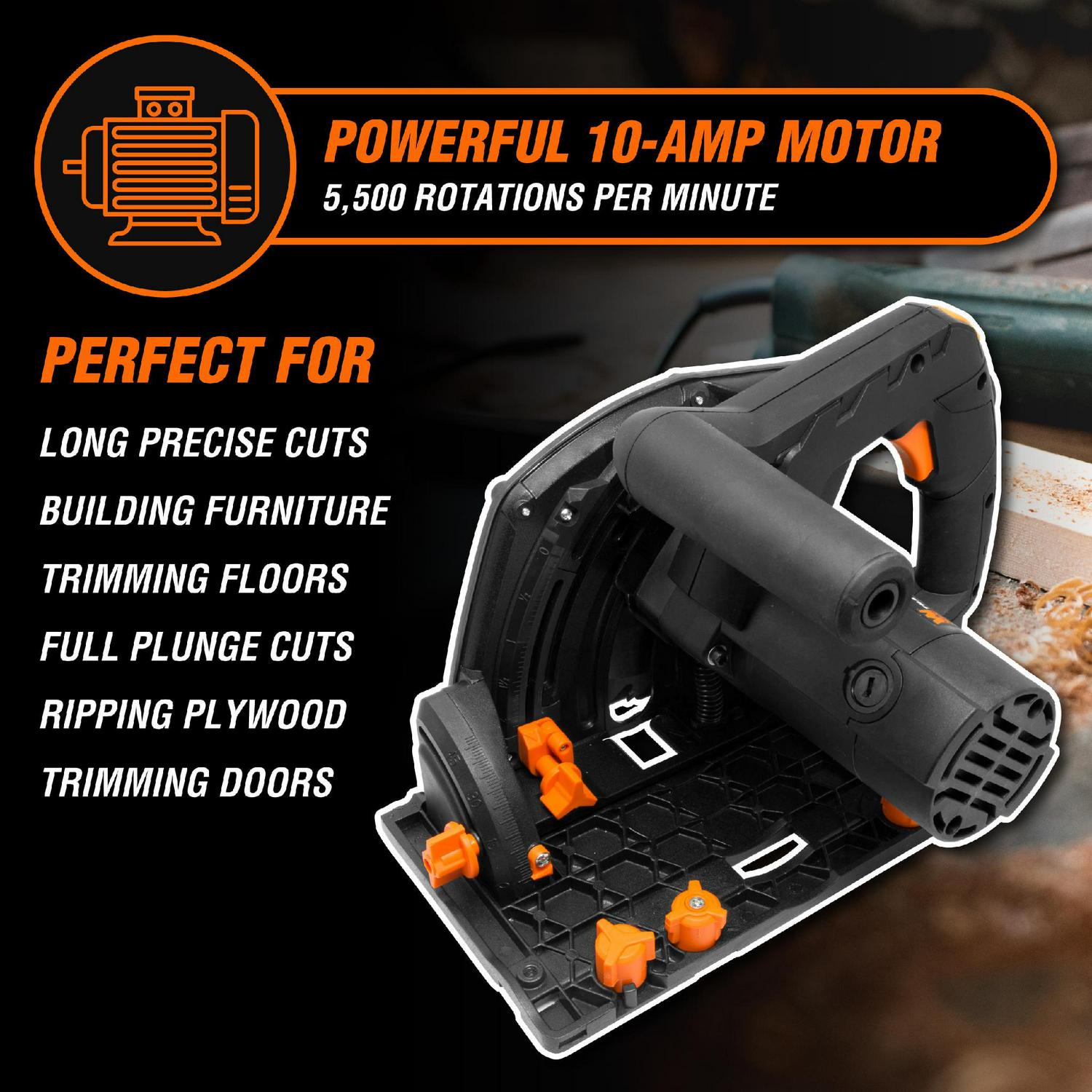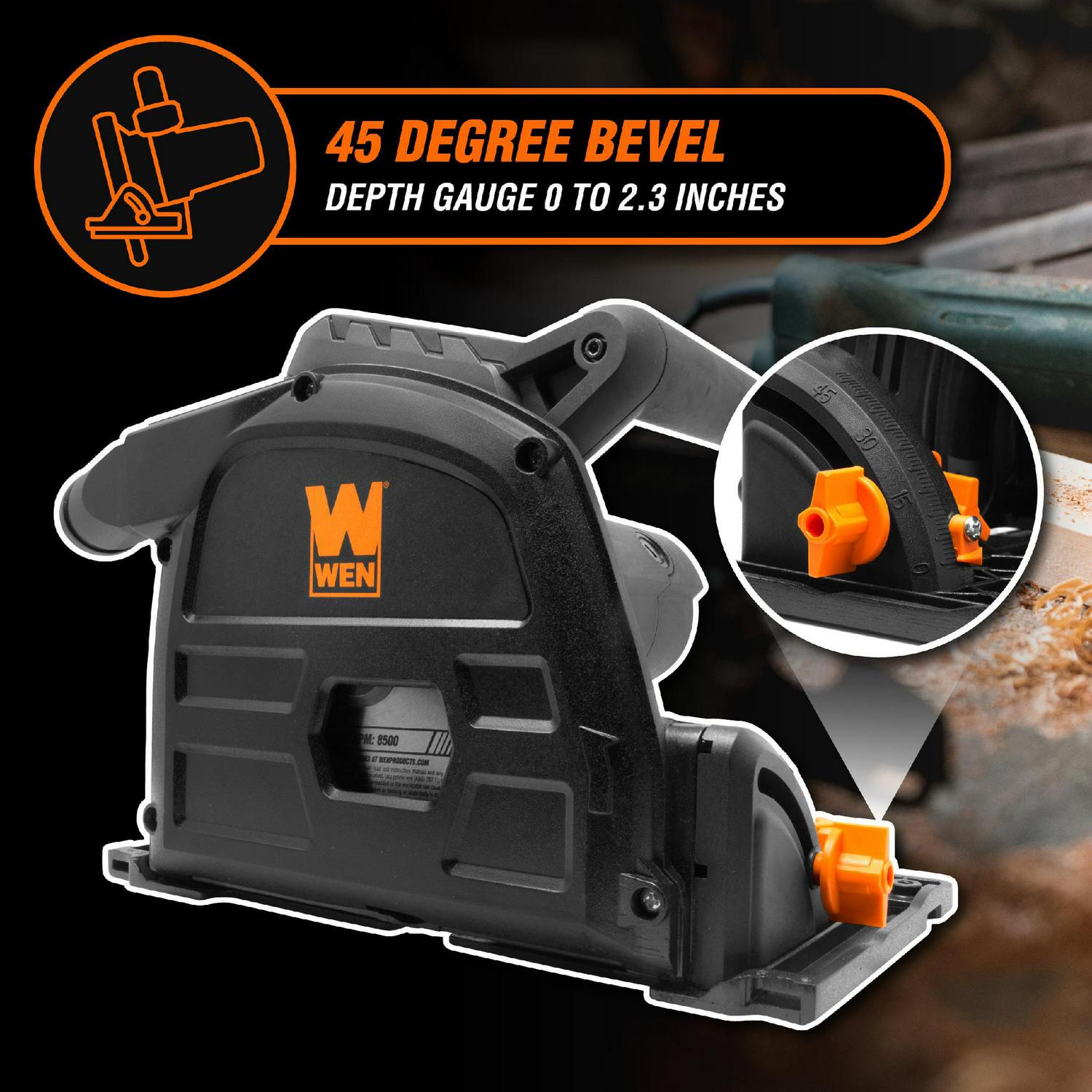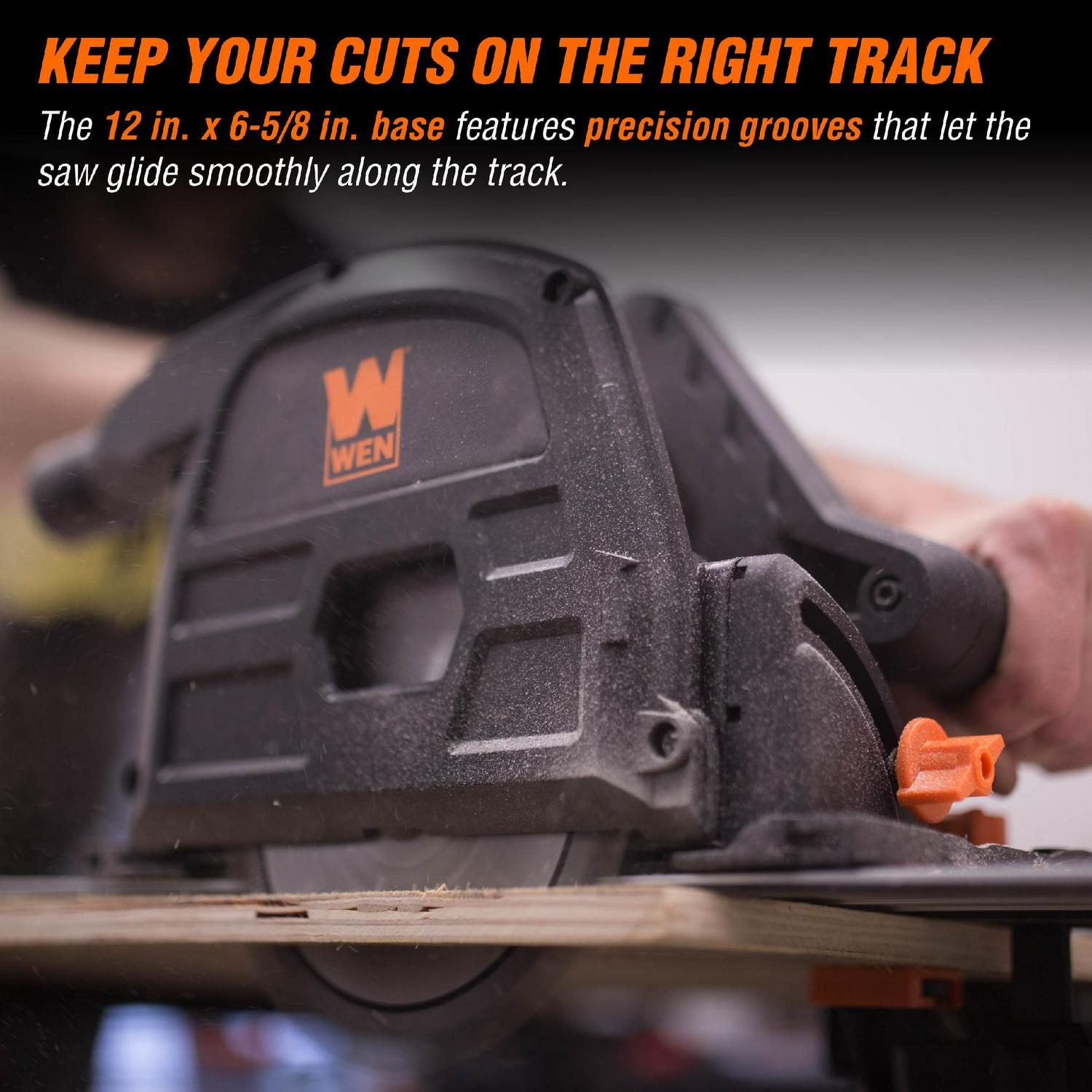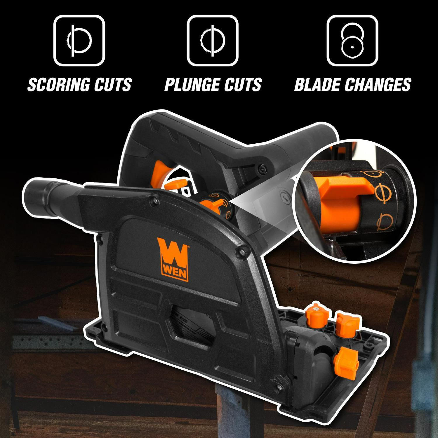 Remember when your saw stayed on the right track. Keep your cuts on the straight and narrow with the WEN 10-Amp Sidewinder Plunge Cut Track Saw. The WEN Track Saw provides users the same results as a table or panel saw in a compact and portable package. Simply lay the track (not included – model CT9502) along the desired surface for a clean and smooth cut. The WEN Track Saw is the perfect companion for ripping plywood, trimming doors, building furniture, and any other application needing long, precise cuts. Our powerful 10-amp motor rotates the 6-1/2-inch blade up to 5500 times per minute, letting you power through even the hardest of woods. Bevel the saw 45 degrees to the left to create angled cuts in boards up to 1-5/8 inches thick. Set the depth gauge anywhere from 0 to 2-1/3 inches to control how deep the saw plunges. The 12 x 6-5/8-inch base features precision grooves that let the saw glide smoothly along the track. However, the saw can also exist on its own as a plunge saw, relying on its flat base for maximum stability and precision. Easily switch between three different blade settings: one for scoring cuts that go 1/8-inch deep, one for full plunge cuts, and one to simplify blade changes. The non-slip base cams reduce pinching and minimizes kickback. The back-mounted dust port allows for attachment to your favourite dust collection system to control sawdust and limit clean up. Simply attach your dust collection device of choice and start sawing. And, because it s a WEN product, your WEN 10-Amp Plunge Cut Circular Track Saw, a nationwide network of skilled service technicians, and a friendly customer helpline, all to make sure you remember WEN.