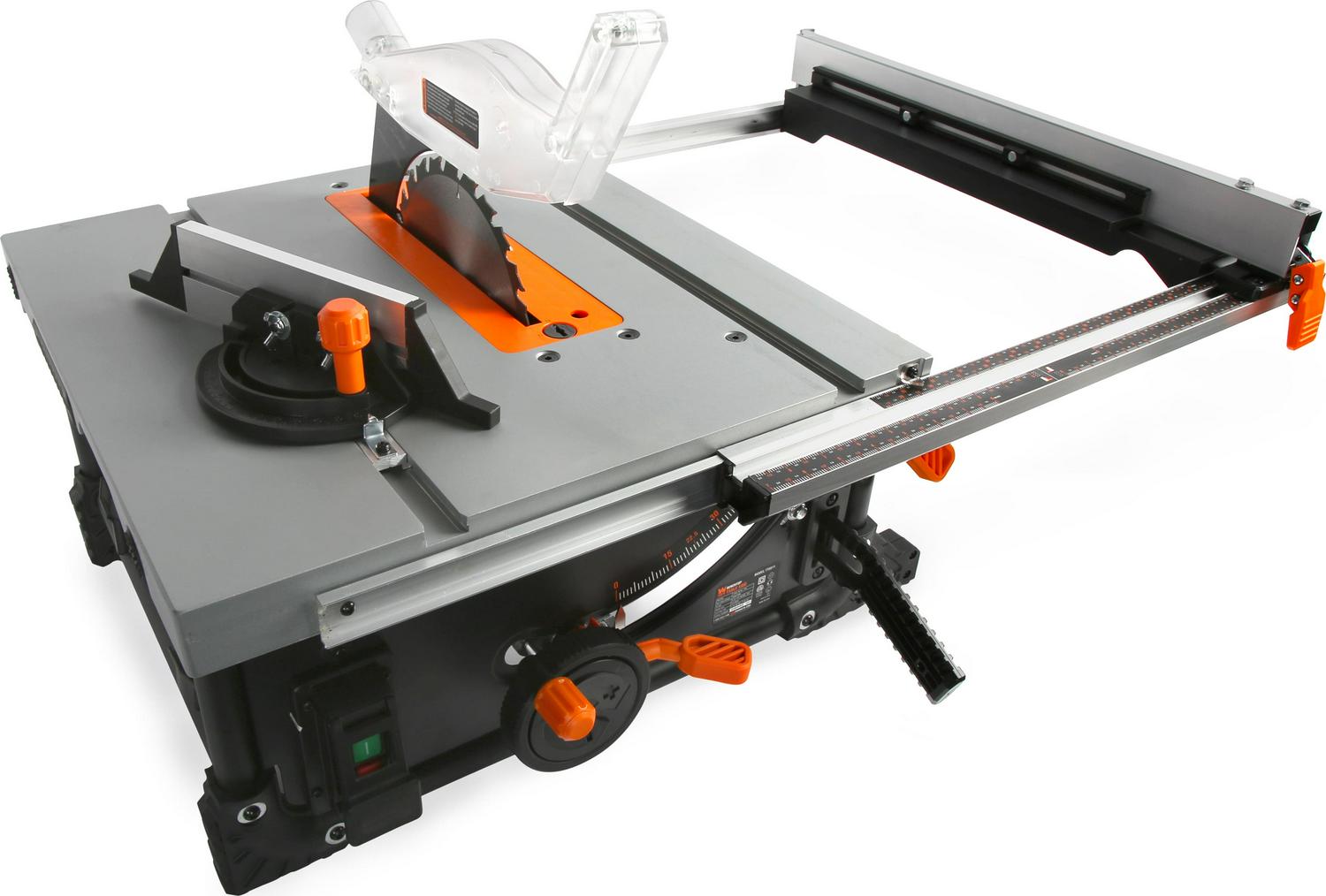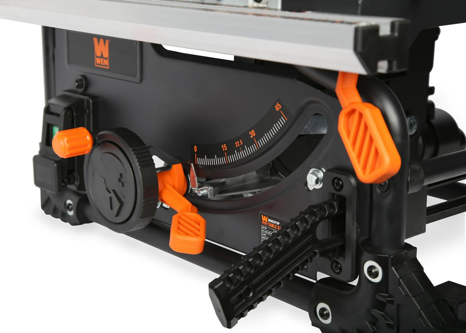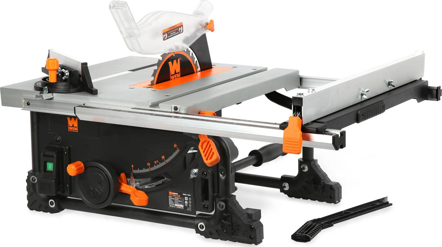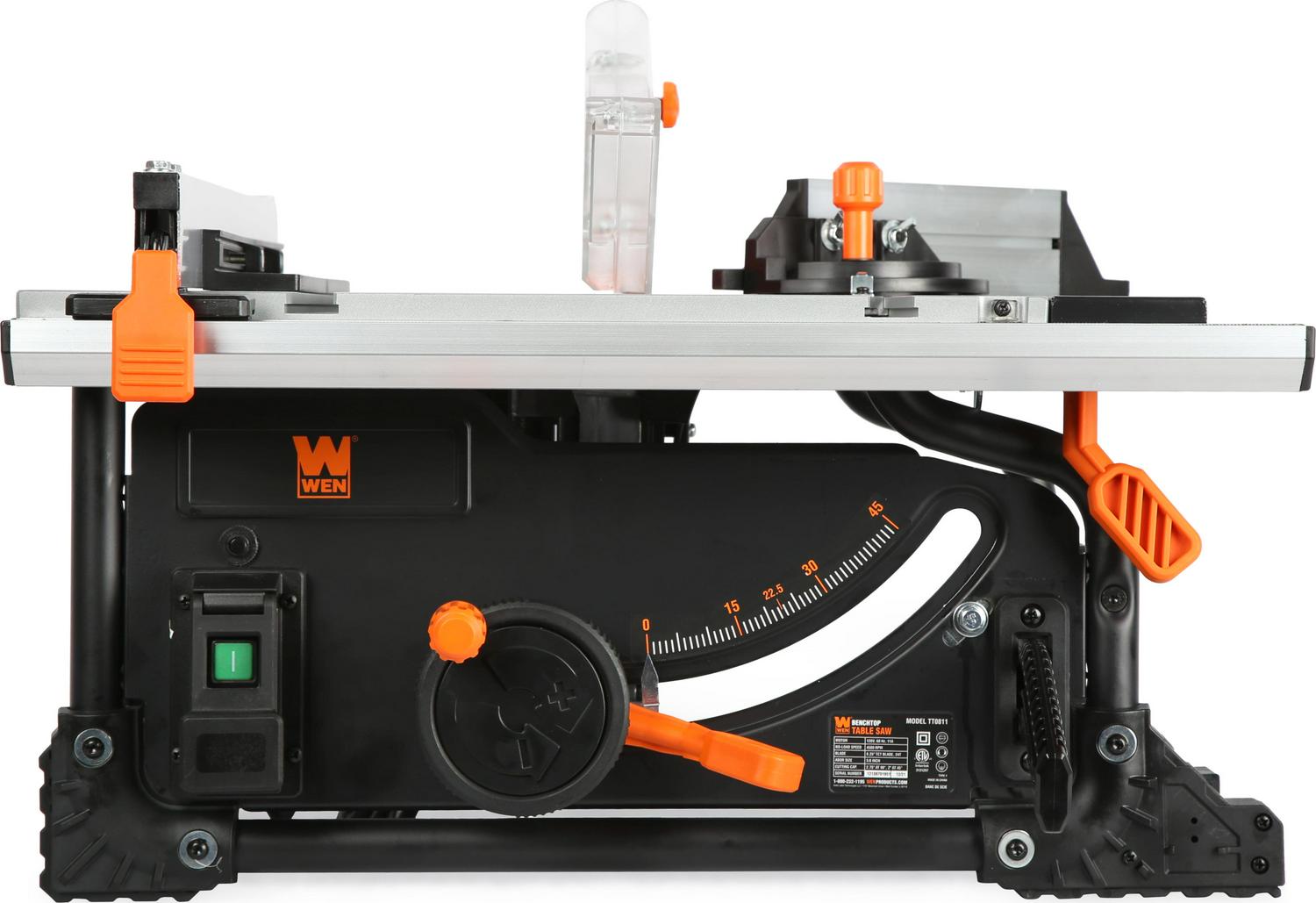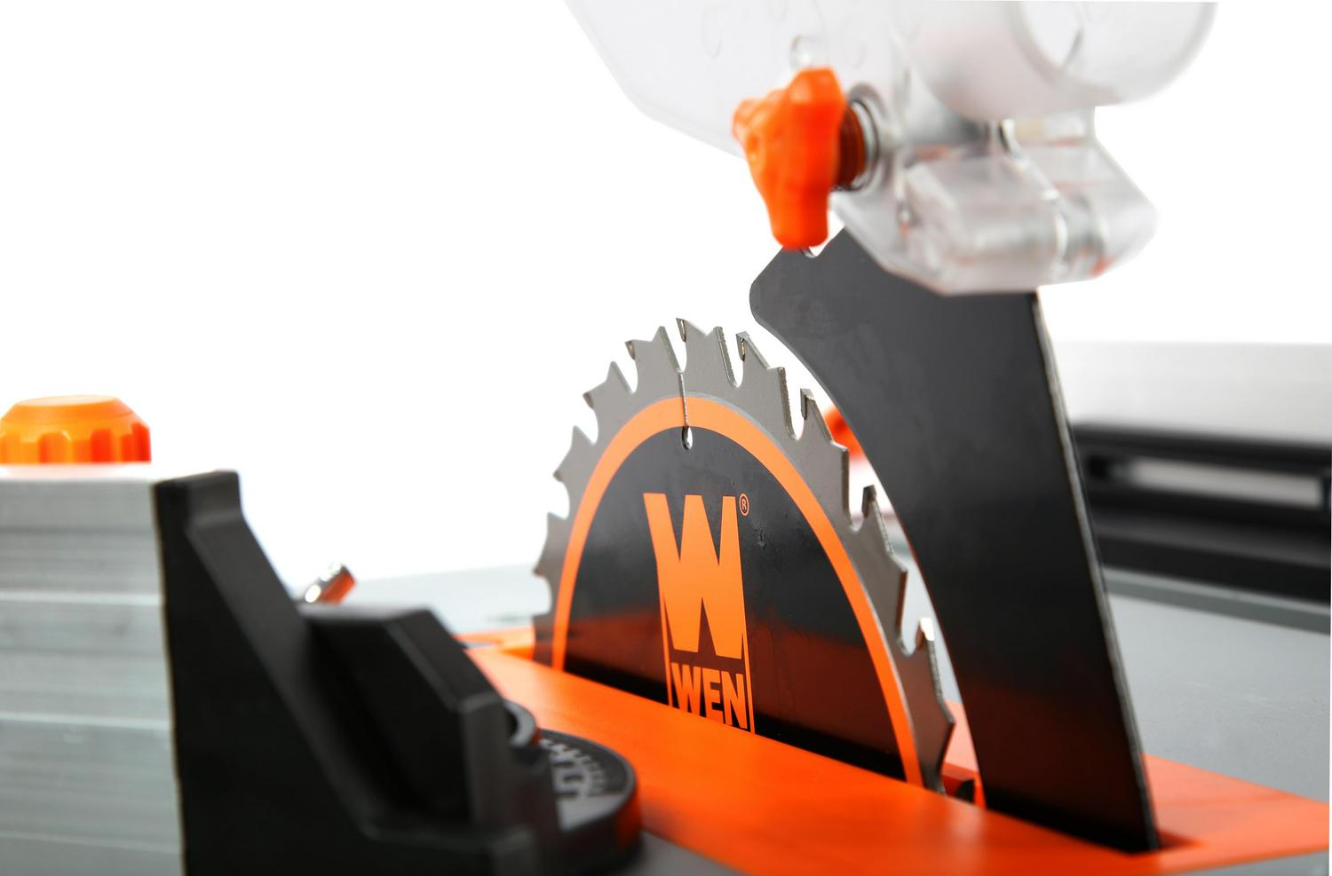 Remember when you had the power of a table saw whenever and wherever you needed it The WEN 11-Amp 8.25-Inch Benchtop Table Saw provides a compact and portable solution for sawing straight, long cuts on larger workpieces. Our spacious table extends out for a rip-cut capacity of up to 25 inches, perfect for ripping 4×8 plywood or OSB sheets. The height adjustment wheel easily adjusts the height of the exposed blade anywhere from 0 to 2.75 inches. The angle of the blade can also be adjusted for bevel cuts up to 2 inches thick at 45 degrees. The tool-free blade guard can be easily installed or removed as needed, while the extension arm increases the 18.9-by-18.4-inch table all the way out to 18.9 by 36 inches in size. The compact housing measures in with a footprint of a mere 15.5 by 23 inches, and includes a side carrying handle for easy transportation and storage between uses. The WEN Benchtop Table Saw also includes an 8.25-inch TCT 24T blade with 5/8-inch arbor, an adjustable rip fence, an auxiliary fence for workpieces less than 1/10 of an inch thick, a miter gauge, a push stick, a dust port adapter, a riving knife to limit kickback, and onboard storage for easy organization. And because it s a WEN product, your table saw also comes backed by a two-year warranty, a helpful customer phone line, and a stocked inventory of replacement parts. Remember when you had a saw that could really rip Remember WEN.