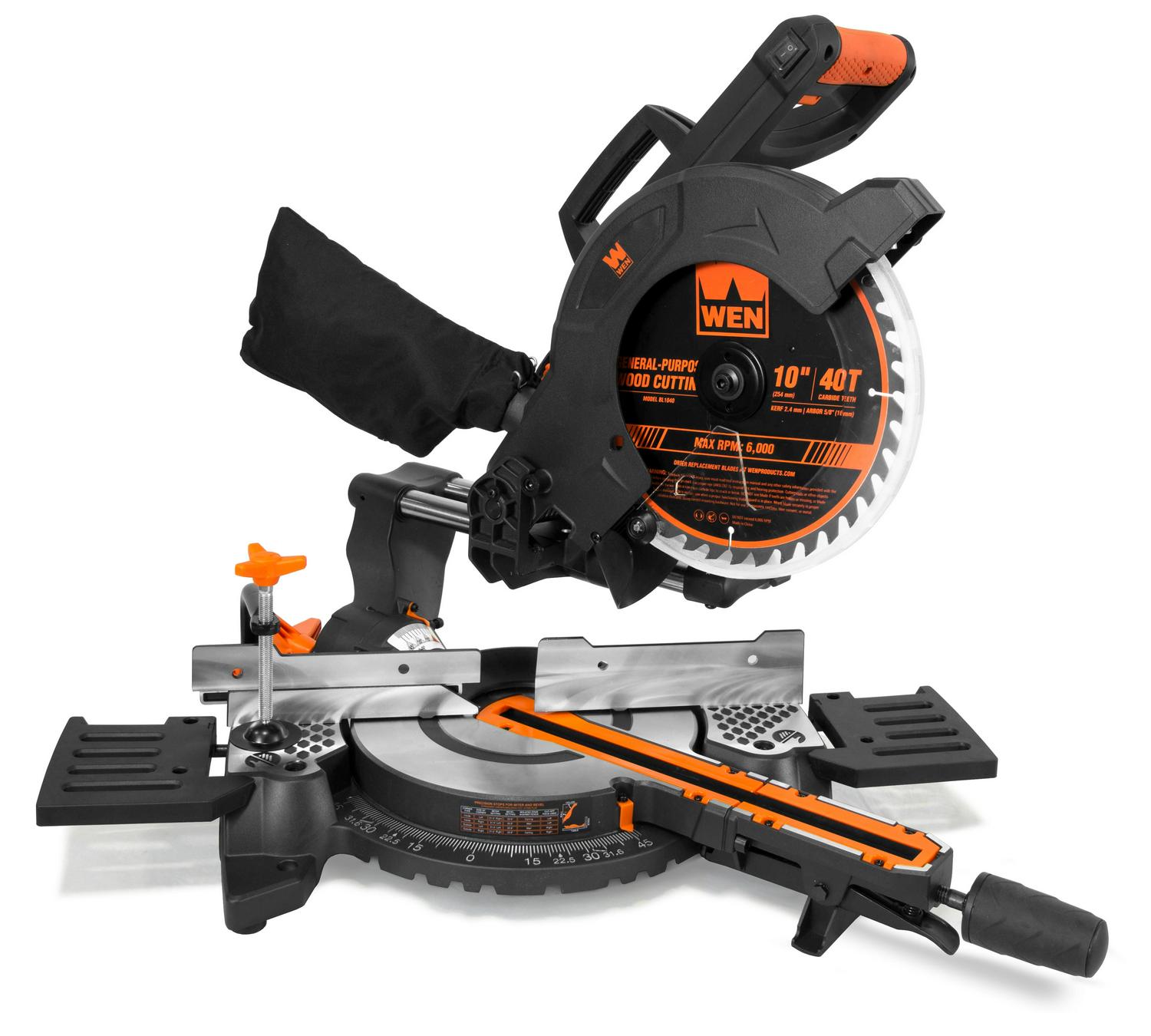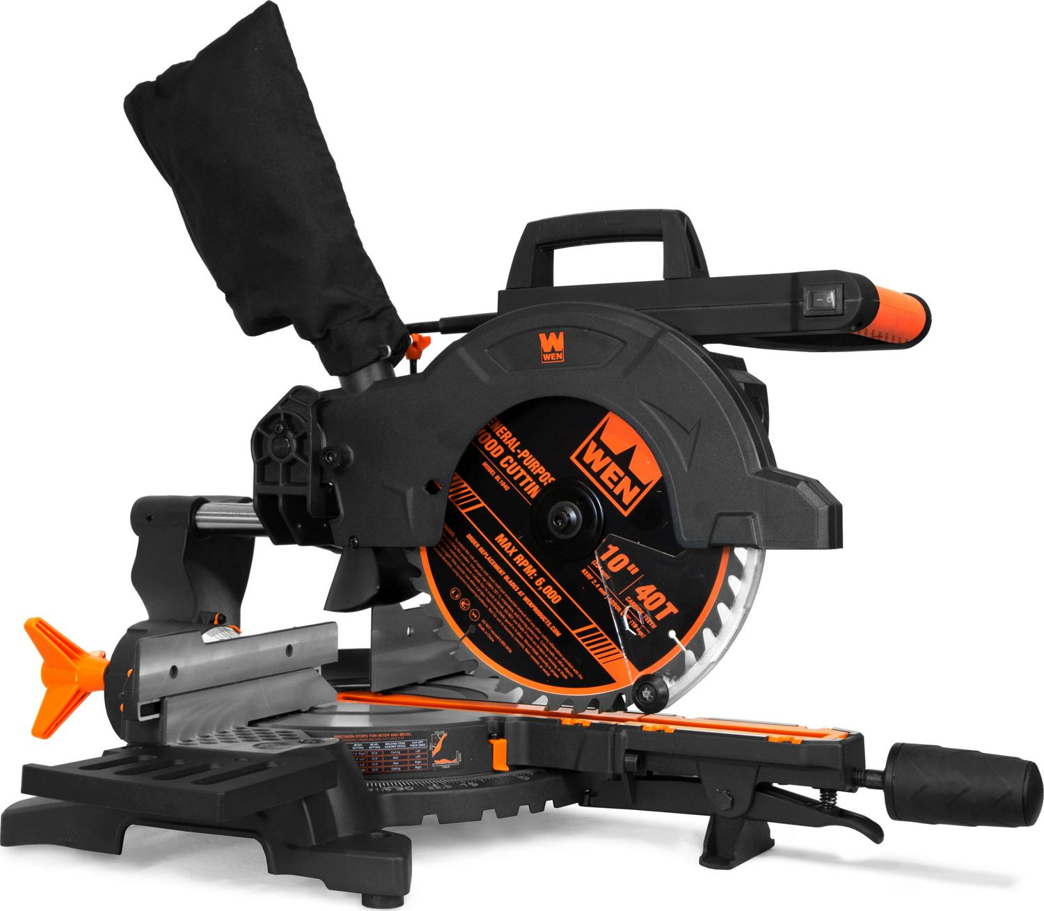 Remember when your miter saw could do it all Create cuts at any angle with the WEN 10-Inch Single Bevel Sliding Compound Miter Saw. Our powerful 15-amp motor slices through even the hardest of woods, rotating the blade up to 4500 times per minute. This versatile saw miters up to 45 degrees in either direction and bevels up to 45 degrees to the left. Cut boards up to 12 inches wide and 3-1/2 inches thick or make compound cuts (45-degree bevel and 45-degree miter) in boards 8-1/4 inches wide and 2-1/5 inches thick. The saw features 9 positive miter stops: two at 15 degrees, two at 22.5 degrees, two at 30 degrees, two at 45 degrees and one at 0. However, if a more unique angle is preferred, the miter lock still allows the saw to lock at any angle between those stops. This spacious saw also features a 7-1/2-inch crown molding nested capacity and a 6-3/4-inch base board vertical capacity. The compact design makes for great portability and storage between uses. Measuring in at 17.5 by 28 by 16.5 inches, you ll never have to worry about your rail system interfering with your wall again. This package also includes a 10-inch 40-tooth carbide-tipped blade (w/ 5/8-inch arbor), two table extensions, one clamp assembly, a class II laser guide, a dust port adapter, and a dust bag. The onboard laser illuminates the line of cut for maximum accuracy while the dust collection port allows for connection to either the included dust bag or your dust collection device of choice. And, because it s a WEN product, your miter saw comes backed by a two-year warranty, a stocked inventory of replacement parts, and a friendly customer help line, all to make sure you remember WEN.