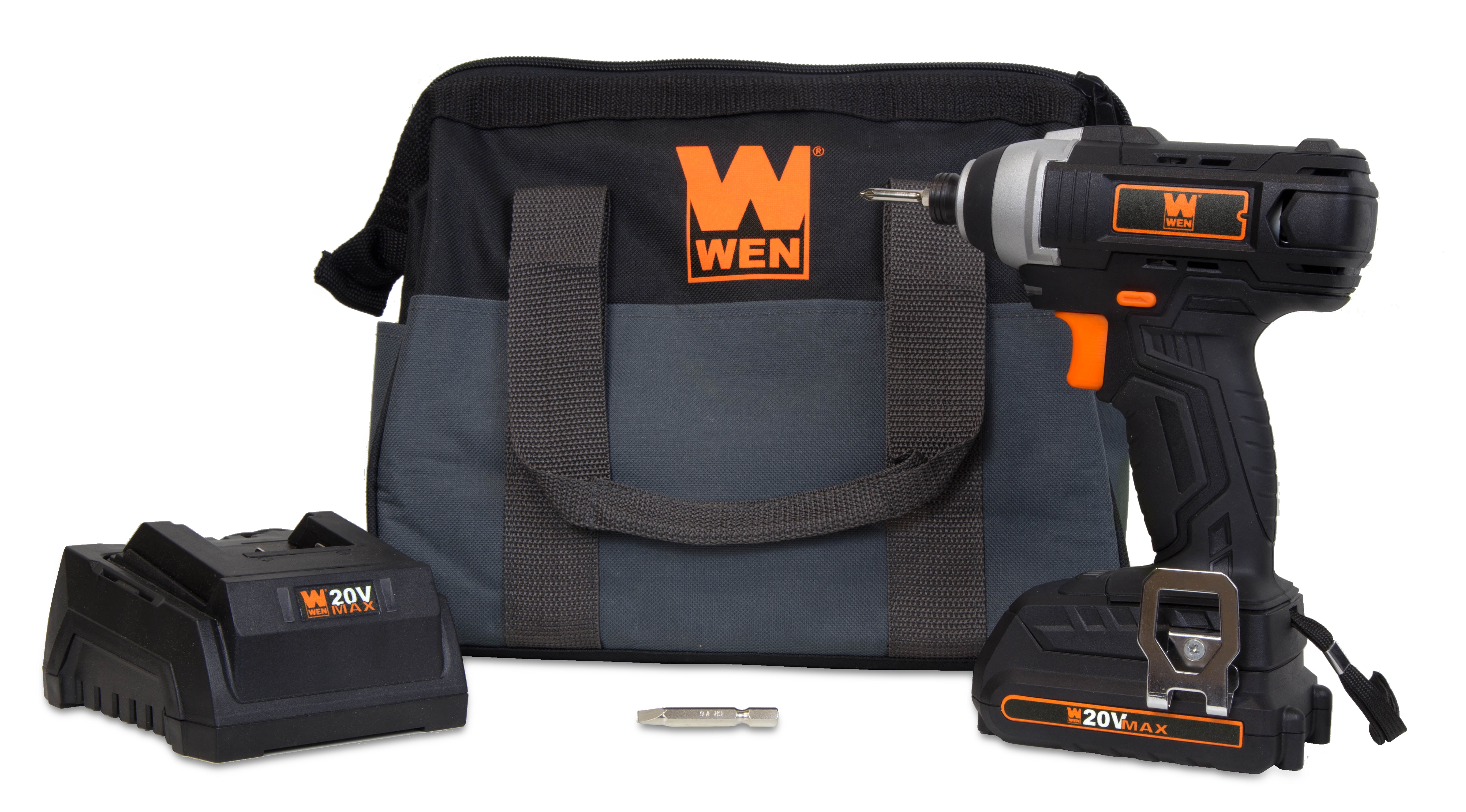 WEN 20-Volt MAX Lithium-Ion Cordless 1/4-Inch Impact Driver w/ Battery, Bits, Charger and Carrying Bag: Pressure sensitive trigger allows for variable speed anywhere from 0 to 2,600 RPM Powerful motor provides up to 950 inch-pounds worth of torque and up to 3,400 taps per minute Quick-release keyless hex chuck accepts hex bits 1/4 of an inch in diameter Lightweight design weighs in at a mere 2.7 pounds for both the drill and the battery combined Includes a 20V max cordless impact driver, onboard LED light, belt clip, lithium-ion battery, charger, two bits, and contractor bag