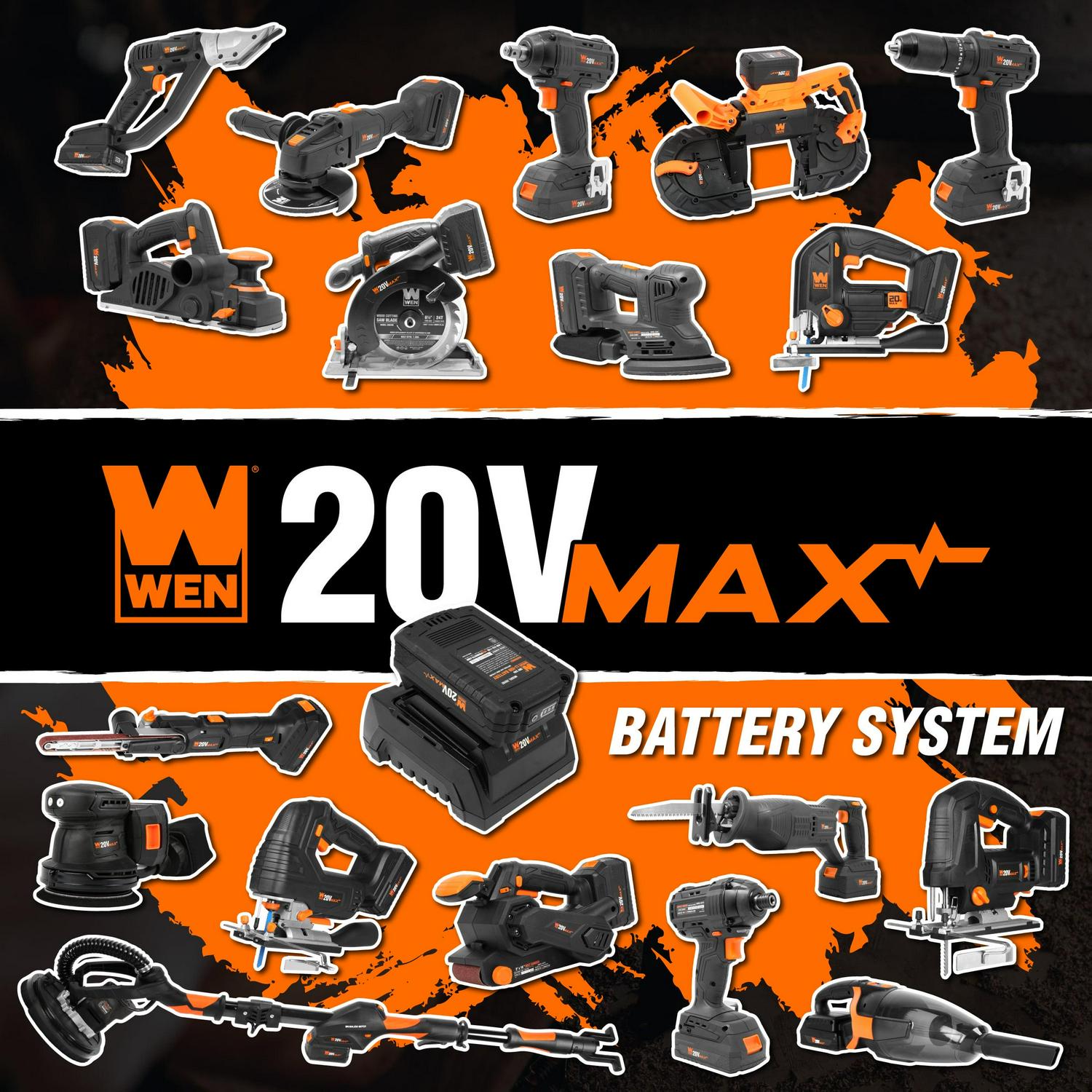 – Two 4.0 amp-hour lithium-ion batteries with onboard LED charge gauges deliver consistent power at any charge level, and are compatible with the entire WEN 20V Max Cordless Power Tool series