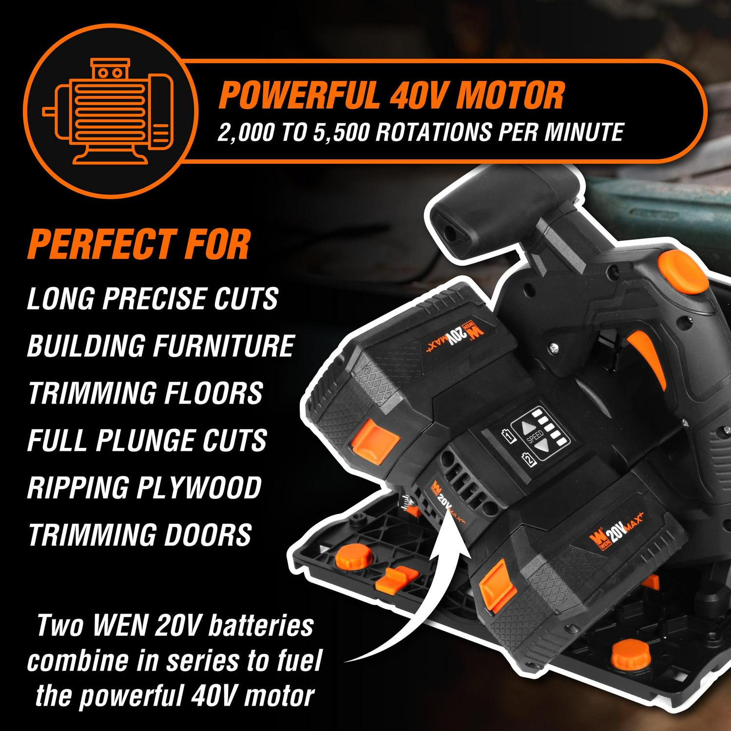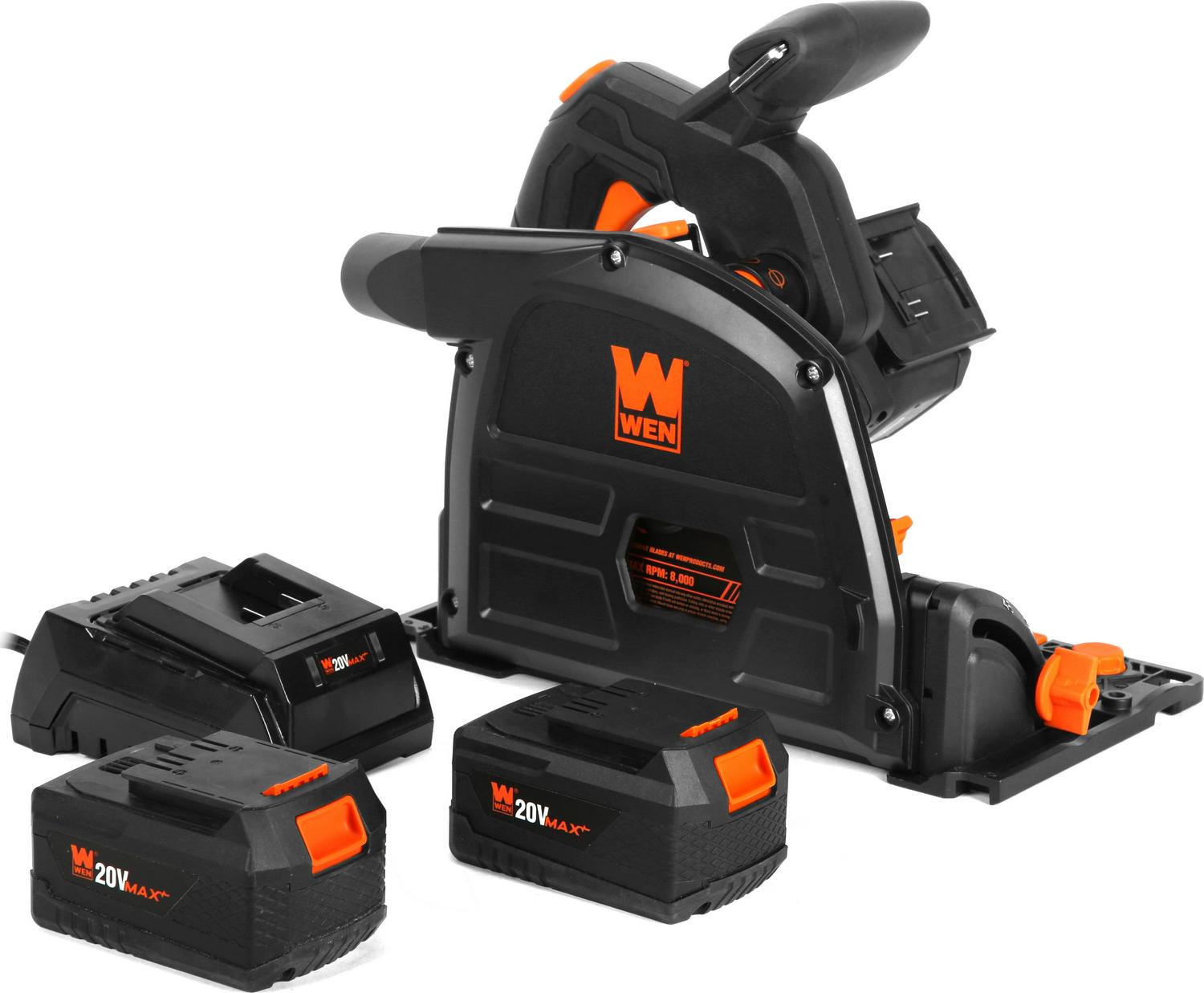 Remember when your saw stayed on the right track Keep your cuts on the straight and narrow with the WEN 20V Max Cordless Track Saw. The WEN Track Saw provides users the same results as a table or panel saw in a compact and portable package. Simply lay the track (not included models CT9502, CT9110) along the desired surface for a clean and smooth cut. The WEN Track Saw is the perfect companion for ripping plywood, trimming doors, building furniture, and any other application needing long, precise cuts. Our powerful variable-speed motor rotates the 6.5-inch blade from 2000 to 5500 times per minute, letting you power through even the hardest of woods. Bevel the saw anywhere from -1 to 47 degrees depending on the needs of the task at hand. Set the depth gauge anywhere from 0 to 2.1 inches to control how deep the saw plunges. The 12 x 6.75-inch base features precision grooves that let the saw glide smoothly along the track. However, the saw can also exist on its own as a plunge saw, relying on its flat base for maximum stability and precision. Easily switch between three different blade settings: one for scoring cuts that go 1/8-inch deep, one for full plunge cuts, and one to simplify blade changes. The back-mounted dust port allows for attachment to your favorite dust collection system to control sawdust and limit cleanup. Simply attach your dust collection device of choice and start sawing. The dust port adapter allows the unit to still stay flush against walls, making this an ideal saw for flooring trim cuts. The two included 4.0 amp-hour lithium-ion batteries deliver consistently powerful performance at any level of charge, feature onboard LED charge gauges, and are cross-compatible with the entire WEN 20V Max Cordless Lithium-Ion Power Tool line. And, because it s a WEN product, your WEN 10-Amp Plunge Cut Circular Track Saw comes backed by a two-year warranty, a nationwide network of skilled service technicians, and a friendly customer helpline, all to make sure you remember WEN. A minimum of two 4Ah batteries is recommended.