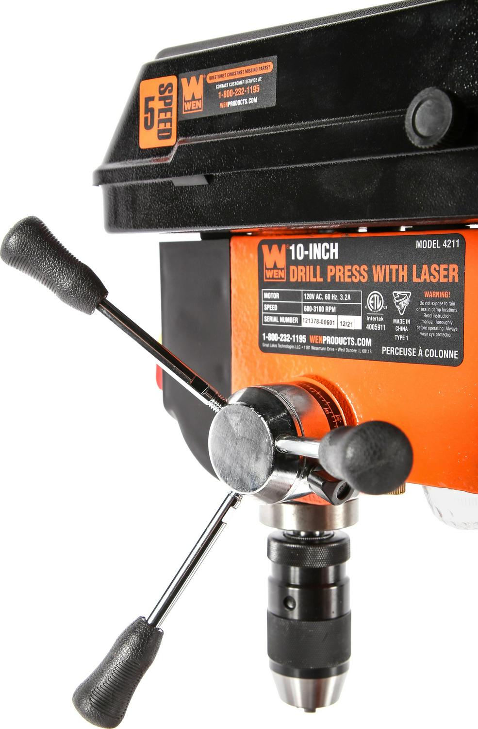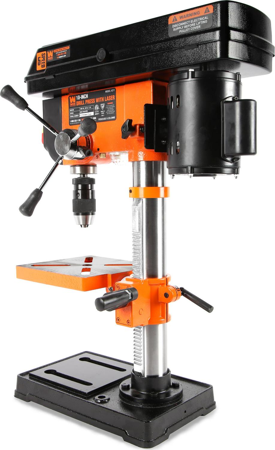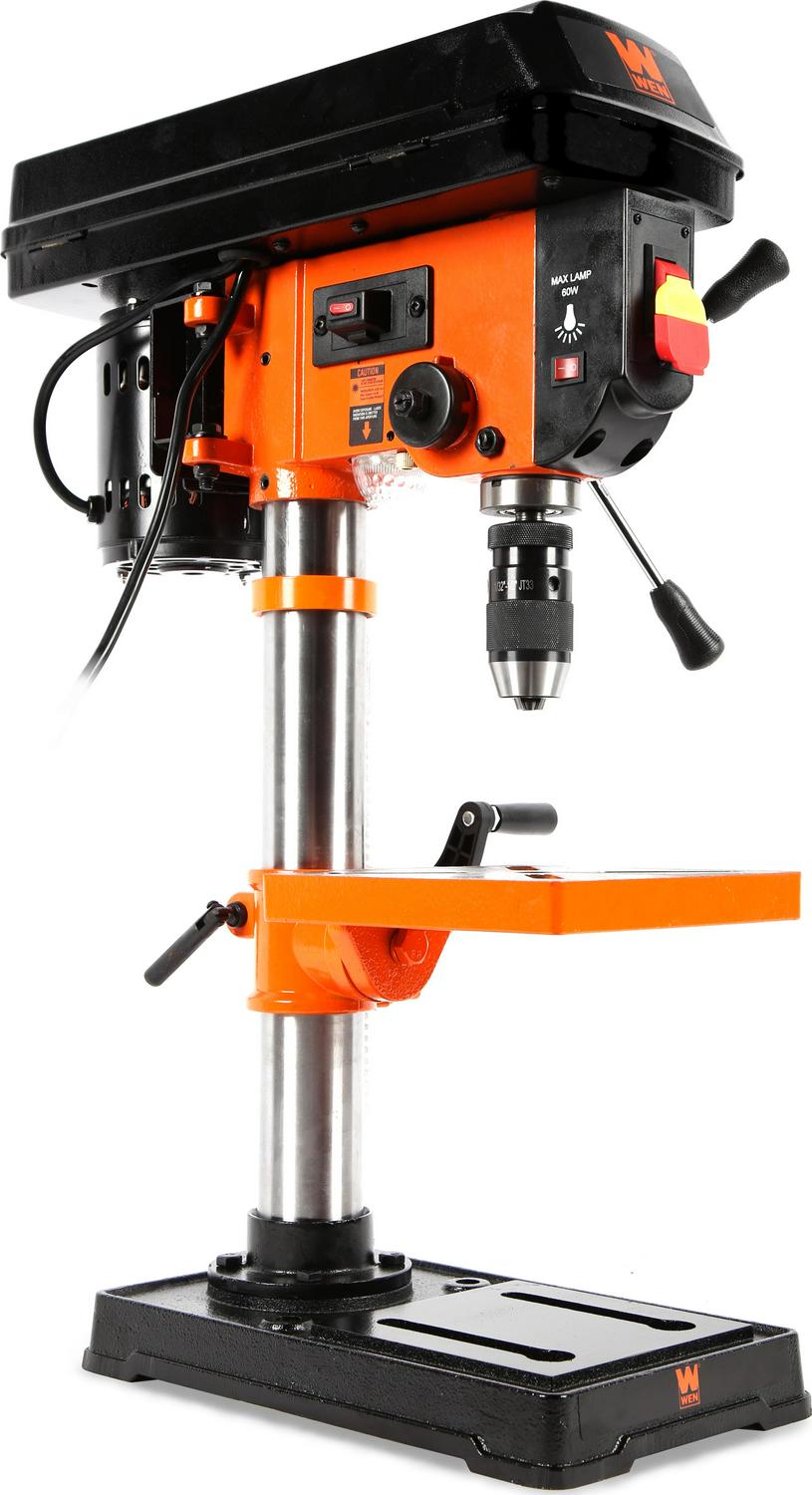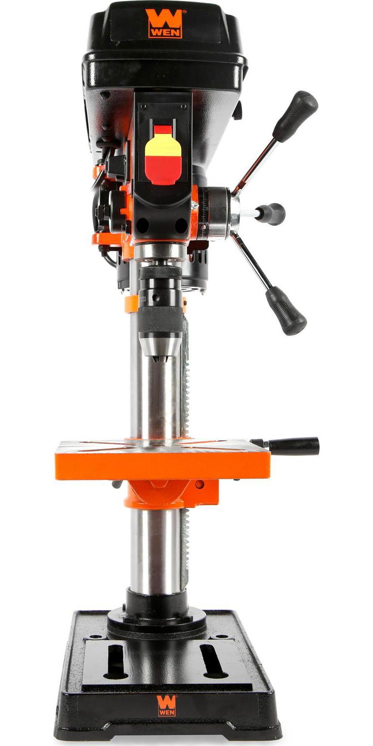 Remember when you could drill with maximum accuracy Power through metal, wood, plastics, and more with the WEN 10-Inch 5-Speed Drill Press. Don t let our compact design fool you. Between the five operating speeds, the 2-1/2-inch spindle travel, and the sturdy construction, you ll have way more precision than a standard handheld drill. Our 3.2-amp induction motor features ball bearings for smooth, balanced performance, even at high speed. Easily set your speed to either 600, 1100, 1700, 2400, or 3100 RPM by adjusting the belt position on the two spindles. The easy-to-read, locking depth stop allows for accurate and repeatable drilling operations. The keyless chuck with JT33 spindle taper accepts bits ranging from 1/20 to 1/2 inch in diameter (1.5 to 13 mm). The X-pattern laser pinpoints the drill location, eliminating guesswork and sparing expensive materials. The table bevels 45° left and right for angled drilling. The base is designed with holes for mounting onto a bench or work stand. Clamps and vises are easily mounted to the slotted table, making work-holding safe and effective. And because it s a WEN product, your 10-inch drill press comes backed by a two-year warranty, a stocked inventory of replacement parts, and a helpful customer phone line. Remember when you could drill holes in almost anything Remember WEN.