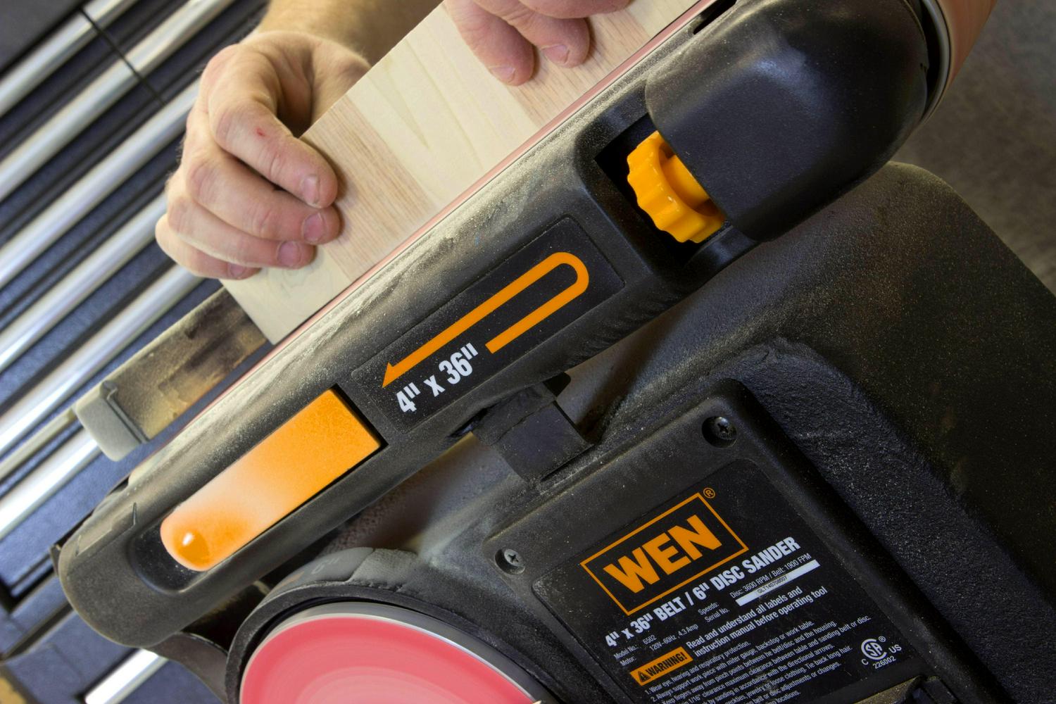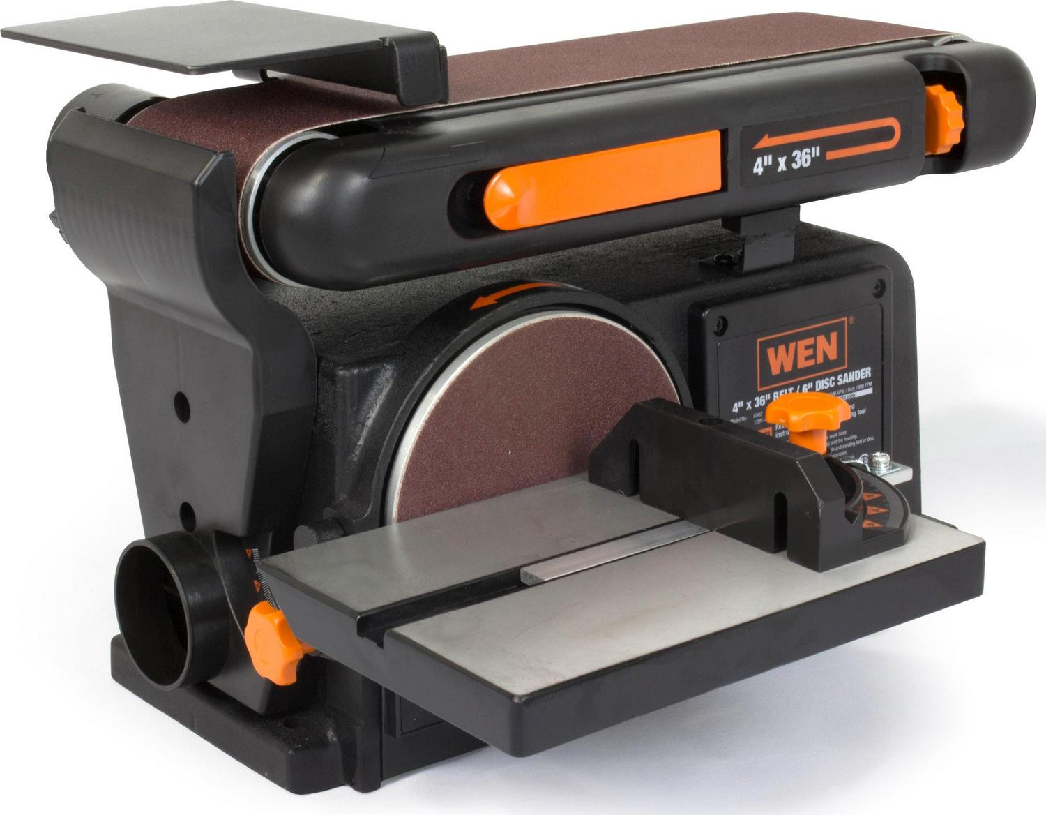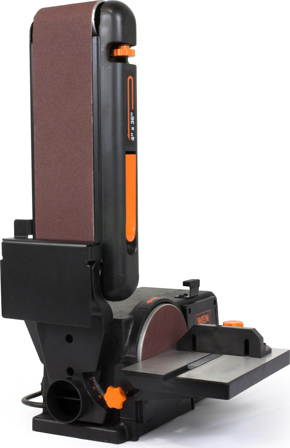 Remember when you needed a versatile and reliable sander The WEN Belt Disc Sander easily sands, smooths and removes all of the jagged edges and splinters on your wood and lumber. With a 4.3 amp 1/2 HP motor.. Changing the spacious 4-inch-by-36-inch belt is a breeze. The belt also tilts anywhere from 0 to 90 degrees to accommodate the needs of your particular workpiece while the heavy cast-iron base prevents vibrations. With all of this in addition to the 6-inch side disc, you ll have the capacity to sand whatever your heart desires. The sanding disc is accompanied by a sturdy cast-aluminum work table. Included with the belt disc sander is a miter gauge for steady sanding on angled edges, a stop bar for safety and control, and a 2.25 inch dust port to connect a dust extractor. And because this is a WEN Product, your purchase comes backed by a two-year warranty, a nationwide network of skilled experienced technicians, and a helpful customer service line all to make sure that you remember WEN.