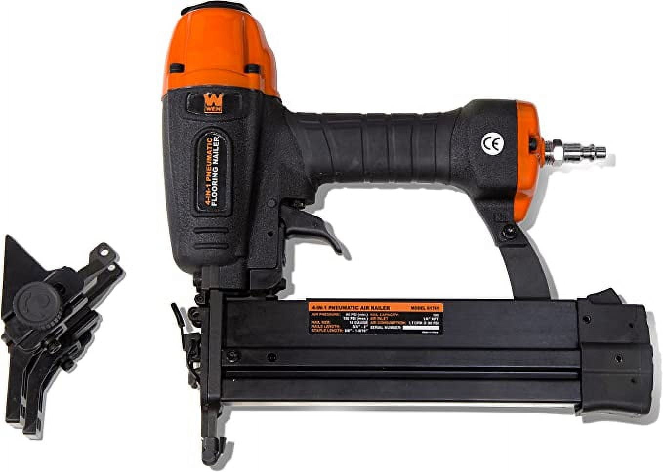 Remember when you had four different tools all in one nailer? Go from a brad nailer to a stapler to a flooring gun all with the WEN 4-in-1 18-Gauge Pneumatic Flooring Nailer and Stapler. Drive 18-gauge brads anywhere from 5/8 to 2 inches in length or 1/4-inch narrow crown staples anywhere from 1/2 to 1-5/8 inches in length. Attach the adjustable spring loaded flooring head to angle your fasteners at a 45-degree angle, making this the perfect companion for carpenters that need versatility on the job. With an operating pressure of 60 to 100 PSI and a 1/4-inch NPT air inlet, simply hook up your favorite air compressor and start nailing. The onboard depth adjustment wheel controls how deep the fastener shoots into your workpiece while the quick-release nose makes it easy to clear jams in the middle of a big job. Our lightweight design along with the rubber-backed grip prevents fatigue during long jobs. Combine that with the 100-nail capacity magazine for a nail gun that makes easy work out of crown molding, tongue and groove flooring, trim work and more. This package includes a carrying case for storage and transportation, two hex keys and oil. And, because it’s a WEN product, your 4-in-1 18-Gauge Flooring Nailer comes backed by a two-year warranty, a nationwide network of skilled service technicians and a friendly customer help line all to make sure you remember WEN. Remember when you could take on the entire job with one single nailer? Remember WEN.