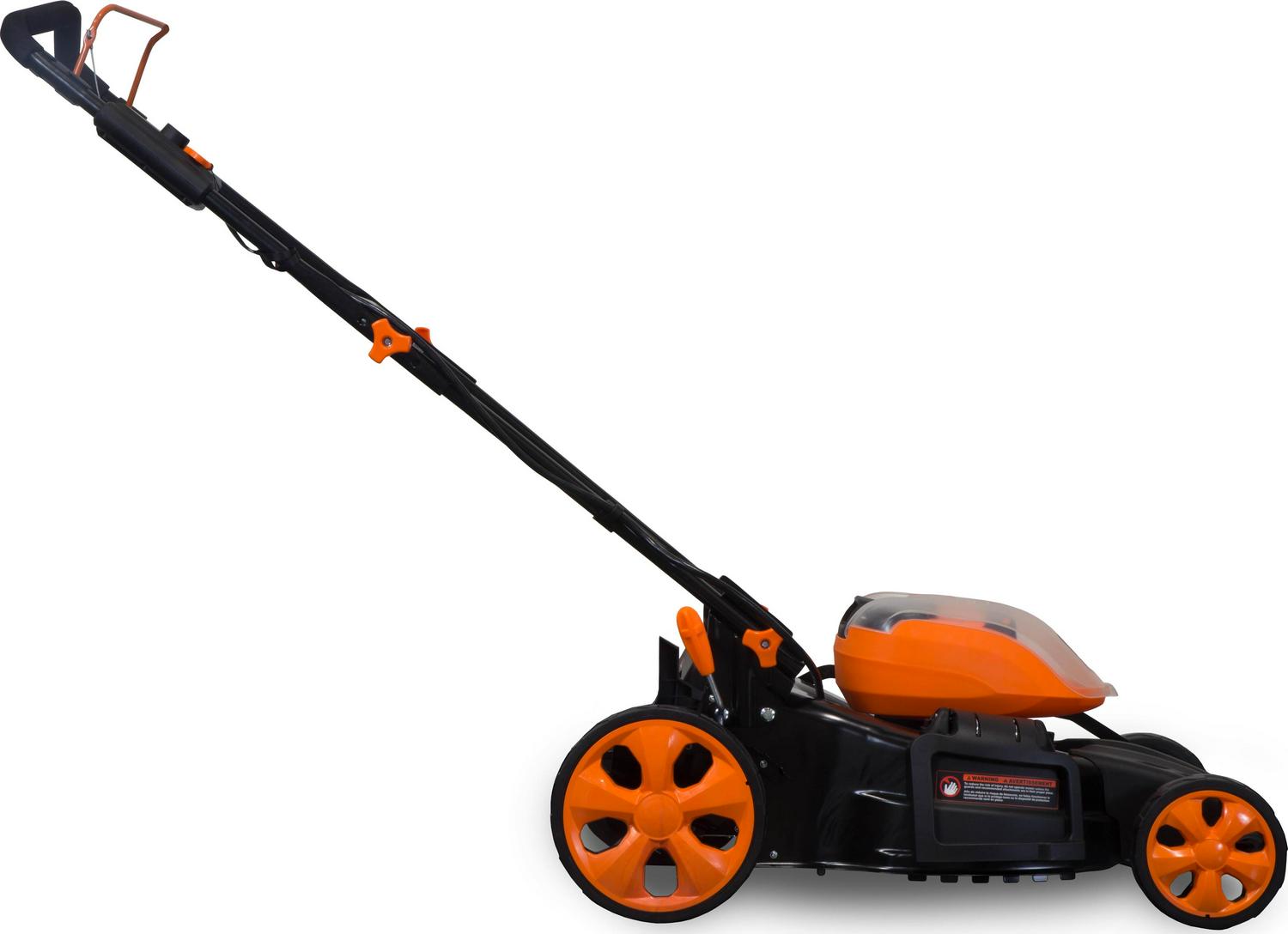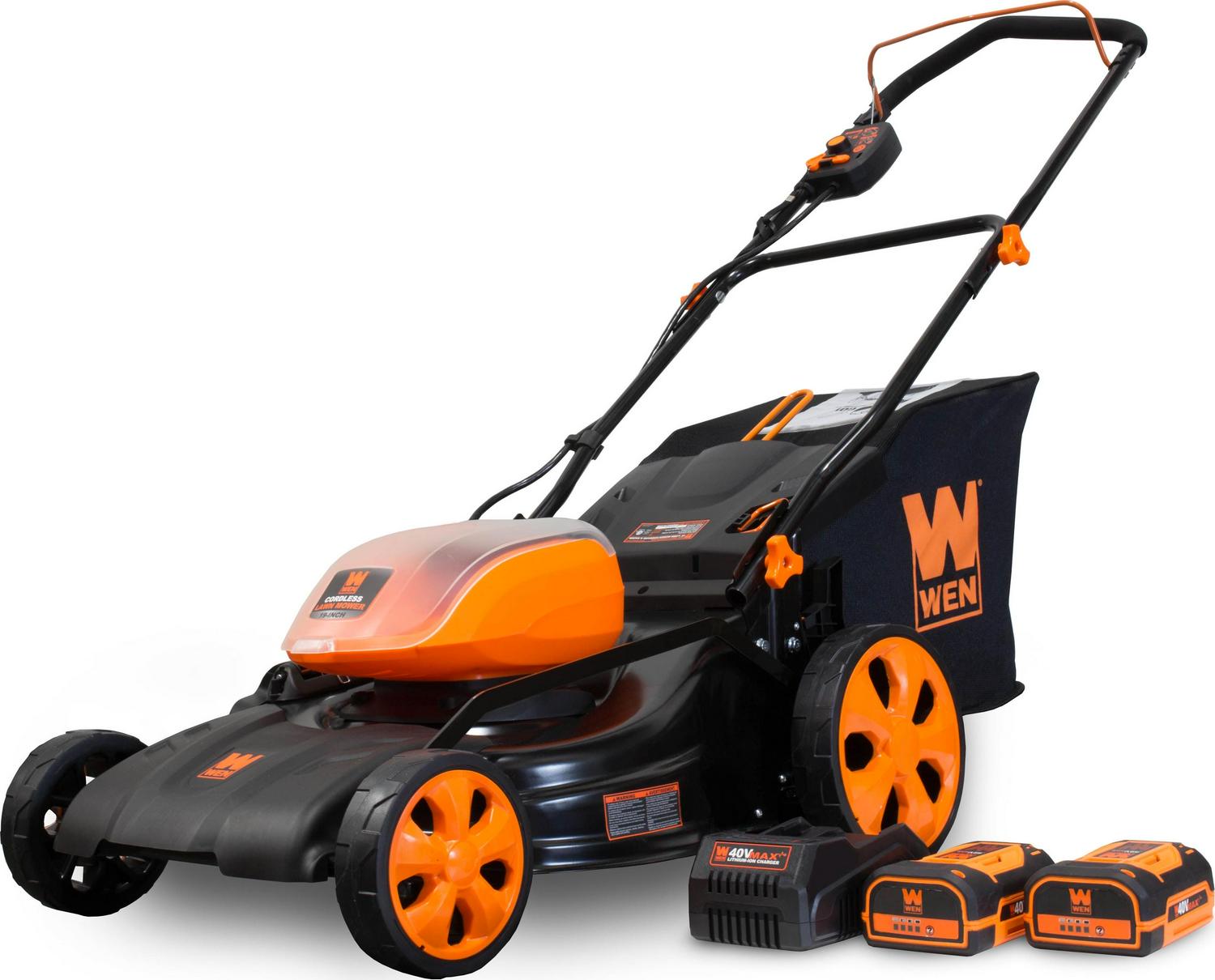 Remember when you could mow your entire yard without using a single drop of fuel Ditch the pull cords, the gasoline, the oil and the carbon emissions with the WEN 40V Max Lithium Ion 19-Inch Cordless 3-in-1 Lawn Mower. With three different modes of operation, you ll have the option to mulch, bag or use the side discharge chute depending on the needs of your particular yard. Our dual-port battery dock accepts two batteries at a time, automatically switching between the two when one battery runs out. With a collapsible handle and a compact and lightweight design, storage and transportation have never been easier. Electric start means the mower powers up quickly without the need of any additional off-season maintenance. The 40V batteries rotate the 17.7-inch blade up to 2850 RPM, making easy work out of even the thickest of grass. Easily adjust the cutting height between six different stops ranging from 1.5 to 4 inches. The onboard battery indicator will keep you up to speed on the remaining battery life while the 10-inch rear wheels glide over tough and bumpy terrain with ease. Our intelligent motor automatically adjusts its torque depending on the grass thickness, allowing users to both save battery life and maximize the lifespan of their machine. The included batteries and charger can also power the entire WEN 40V Max Lithium-Ion Series, including the WEN 40410 40V Leaf Blower, the WEN 40413 40V String Trimmer, the WEN 40415 40V Hedge Trimmer and the WEN 40417 40V Chainsaw. And because its a WEN product, your mower comes backed by a two-year warranty, a nationwide network of skilled service technicians and a friendly customer help line. Remember when your yard was the talk of the town Remember WEN.