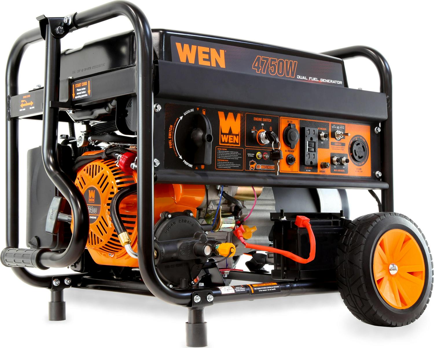 Remember when you could run your generator off either gas or propane. Whether we’re providing your home electricity during a crisis or charging your family’s cellphones at the campgrounds, WEN has been reliably lighting up lives since 1951. Now, with the WEN 4750-Watt Dual Fuel Electric Start Generator, you ll be able to create power from two different sources. Simply select your preferred method, either gasoline or LPG, and power on the generator using the electric start. Propane provides the generator with 4350 surge and 3500 running watts while gasoline produces up to 4750 surge and 3800 running watts. Our packed panel features two 120V GFCI outlets (5-20R), a NEMA 30A twist lock (L14-30R), a 12V DC cigarette-lighter-style plug, and a voltage selector to switch between 120V and 240V depending on the task at hand. Run your lights, TV, refrigerator, sump pump, power tools, or other essentials with ease. The WEN Watchdog CO Shutdown Sensor helps protect both you and your family by automatically turning off the generator if dangerous levels of carbon monoxide are detected. The wheel and handle kit makes transportation easier than ever while the included 47-inch LPG hose allows for immediate connection to propane tanks. With its 240 volts of power and 224cc engine, this CARB & EPAIII compliant generator is the perfect companion for emergency back-up. Simply plug your transfer switch into the NEMA 30A twist lock for electricity in times of need. It s durable enough for the job site and compact enough for easy storage. And because it s a WEN product, your generator comes backed by a nationwide network of skilled service technicians, a friendly customer support phone line.
