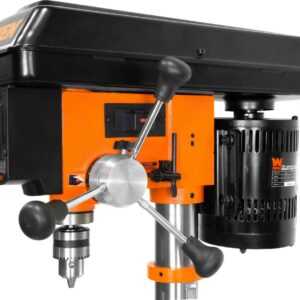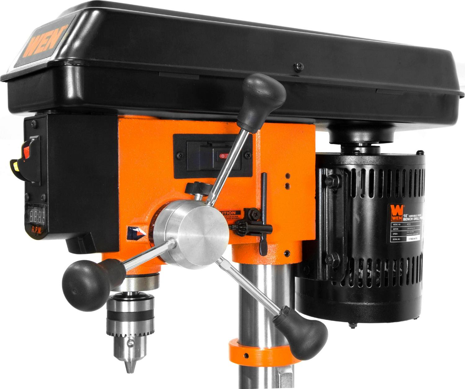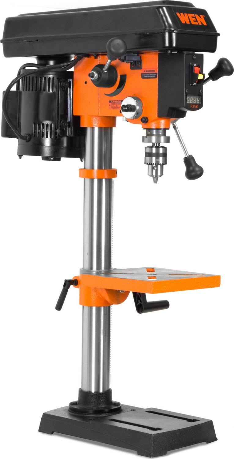 Remember when power tools were actually powerful The WEN 10-Inch Variable Speed Drill Press powers through metal, wood, plastic and more, with the ability to drill up to a 1/2-inch hole through heavy-duty, 1-inch-thick cast iron. The mechanical variable speed allows you to dial in the exact RPM (from 530 to 3100) for your project with the simple turn of a lever while the digital LED readout displays the current speed. The powerful induction motor features ball bearings for an extended life and balanced performance. The 1/2-inch chuck with JT33 spindle taper gives you versatility with a variety of bits, with on-board chuck key storage for easy organization. The 8 by 7.5-inch cast-iron worktable bevels 45° left and right for those tricky operations. The X-pattern laser shows your drill s center points, saving on guesswork and sparing expensive materials. The 8 by 12.5-inch cast iron base features predrilled holes for easy mounting to the benchtop or work surface of your choice. And because it s a WEN product, your drill press comes backed by a two-year warranty, a friendly customer support line, and a stocked inventory of replacement parts. Remember when you could drill with laser precision Remember WEN.